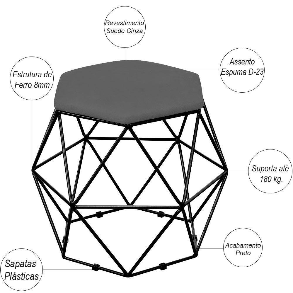 Puff Decorativo Aramado Preto Six L02 Suede Cinza - Lyam DecorDescrição do produto: É fato que a decoração com itens aramados está super em alta, e é a responsável por mudar a decoração da casa! Esbanjando estilo, o Puff Six foge do tradicional e se destaca por sua modernidade e design de extremo bom gosto. Muito forte para o estilo de decoração glam ou também para áreas externas cobertas, este Puff Decorativo cai muito bem em ambientes como sala de estar, hall de entrada, recepções, ou onde mais sua imaginação permitir. Sua estrutura não desgasta no contato com o chão pois possui proteção com sapatas plásticas, além de um assento mega confortável. O seu mais novo queridinho do ambiente e cheio de charme Puff Six. :)Dimensões do produto (L x A x P) 47 x 42 x 47 cmCaracterísticas: Estrutura em ferro 8mm com acabamento na cor preto. Revestimento Suede Cinza. Assento com espuma D-23. Sapatas de sustentação em polipropileno preto. Formato Hexágono Geométrico. Produto entregue montado, pronto para uso. Suporta até 180 kg.- Por se tratar de estofado as medidas podem ter uma pequena variação de até 3 cm. - A tonalidade do produto real poderá ter ligeira variação devido o lote de tecidos.Observações importantes: A montagem será de responsabilidade do comprador; Responsabilizamo-nos pela entrega em todo território nacional, até onde as rodovias alcançam, entregas fluviais ou aéreas devem ser cotadas a parte; As imagens são ilustrativas, não acompanham objetos de decoração e eletrônicos; Não nos responsabilizamos, no ato da entrega, por subir escadas/elevadores ou transporte por guincho em apartamentos. Eventuais despesas são de responsabilidade do comprador; Confira as dimensões do produto e certifique-se de que passará normalmente por supostos elevadores, portas, escadas e/ou corredores de sua residência; Altura Montado: 42 | Largura Montado: 47 | Profundidade Montado: 47