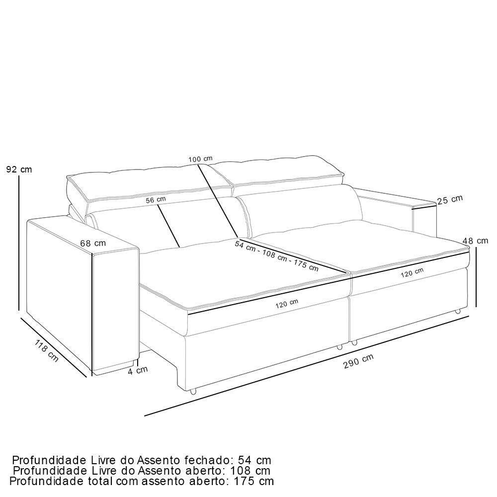 Sofá Retrátil Reclinável Para Sala De Estar Living 290cm Clara M03 Veludo Azul Marinho - Lyam DecorDono de um visual que promete levar sofisticação e aconchego para a sua casa, o Sofá Retrátil Reclinável Para Sala de Estar Living 290cm Clara, da Lyam Decor, vai transformar os seus dias de descanso, além de elevar a decoração da sala de estar. Por dentro, esse sofá conta com estrutura em madeira de reflorestamento de eucalipto, responsável pela grande durabilidade e resistência, enquanto as percintas elásticas, as molas espirais e ensacadas e a tapeçaria em espuma D-26 garantem o conforto e maciez inigualáveis. Já a versatilidade fica por conta do assento retrátil e do encosto reclinável, o que permitem adequar a posição o sofá de acordo com sua necessidade, seja fechado para receber os amigos, ou aberto e reclinado para curtir aquele filme em famí aí, bom demais, não é mesmo? Então, aproveite e garanta já o seu!Dimensões do Produto (L x A x P) 290 x 92 x 118 cmMedidas Internas: Altura da Almofada do Encosto: 56 cm Altura da Braça: 68 cm Largura da Braça: 25 cm Largura do assento: 120 cm cada Profundidade Livre do Assento fechado: 54 cm Profundidade Livre do Assento aberto: 108 cm Profundidade total com assento aberto: 175 cm Altura total com encosto sem reclino: 100 cm Altura dos Pés: 4 cmCaracterísticas: Estrutura em madeira de reflorestamento de eucalipto, pinus e placas de OSB e imunizada contra mofo, cupim e microorganismos. Revestimento em Veludo na cor Azul Marinho. Encosto retrátil com almofadas fixas preenchidas com fibras e flocos, revestida com kami e manta acrílica. Assento com espuma D-26, molas ensacadas com manta acrílica, duplo molejo. Braças com espuma D-20. Pés em MDF tingidos e rodízios de silicone. Peso suportado: Até 120 kg por assento.- Nunca sentar nos braços ou encosto do produto. - Por se tratar de estofado as medidas podem ter uma pequena variação de até 3 cm. - A tonalidade do produto real poderá ter ligeira variação devido o lote de tecidos. - Indicado para uso residencial, sua limpeza deve ser feita com pano levemente umedecido em água limpa, sem esfregar, não utilizar produtos abrasivos, desengordurantes, álcool ou solvente.Observações importantes: - Produto para uso residencial em ambiente interno, não devendo ficar exposto diretamente ao sol, calor e umidade excessivos. - Pode haver alguma diferença de tonalidade entre a imagem e o produto real, por conta do tratamento de imagens e a calibração de cores do seu monitor. - As imagens são meramente ilustrativas, não acompanham objetos de decoração e eletrônicos. - Ao receber a mercadoria, o cliente deve verificar as condições da embalagem, caso haja alguma não assine o de e com nossa para orientações. - Montagem, desmontagem e outras instalações serão de responsabilidade do cliente. Não nos responsabilizamos, no ato da , por subir escadas/elevadores ou pelo por guincho em apartamentos. Eventuais despesas são de responsabilidade do comprador. - Confira as dimensões do produto e certifique-se de que passará normalmente por supostos elevadores, portas, escadas e/ou corredores de sua residência. - Para mais informações, acesse nossa Central de . Color: Azul | Tipo de produto: Sofá | Estilo: Linear | ColorSupplier: Azul Marinho | Peso: 121 kg | Altura: 92 cm | Mecanismo de abertura do produto: Retrátil Reclinavel | Material de enchimento do encosto: preenchidas com fibras e flocos, revestida com kami e manta acrílica. | Largura: 290 cm | ProductWarranty: 90 dias após o do produto | ColorFamily: Azul | Orientação do Sofá: na | Cor: Azul Marinho | Fabricante: Lyam Decor | Material do estofamento: Veludo | Cor dos pés: NA | OriginState: PR | ProductWidth: 290 cm | ProductInstructions: Produto para uso em ambiente interno, nao devendo ficar exposto ao sol, calor e umidade excessivos. | Profundidade: 118 cm | Requer montagem: Não | Peso máximo suportado: 120 kg | Unidades por kit: 1 | Formato do sofá: Linear | Linha: Clara | ProductHeight: 92 cm | Model: Clara | ProductContents: 01 Sofá | Desenho do tecido: Liso | ColorSimple: Azul | OriginCountry: | Densidade da espuma do assento: D-26 | SizeDescription: Altura: 92 cm x Largura: 290 cm x Profundidade: 118 cm | MaterialFamily: Madeira, Tecido | Material: Madeira de reflorestamento de eucalipto, pinus e placas de OSB | ProductWeight: 121 kg | ProductLength: 118 cm | SupplierSimpleName: Sofá Retrátil Reclinável Para Sala de Estar Living 290cm Clara M03 Veludo Azul Marinho - Lyam Decor