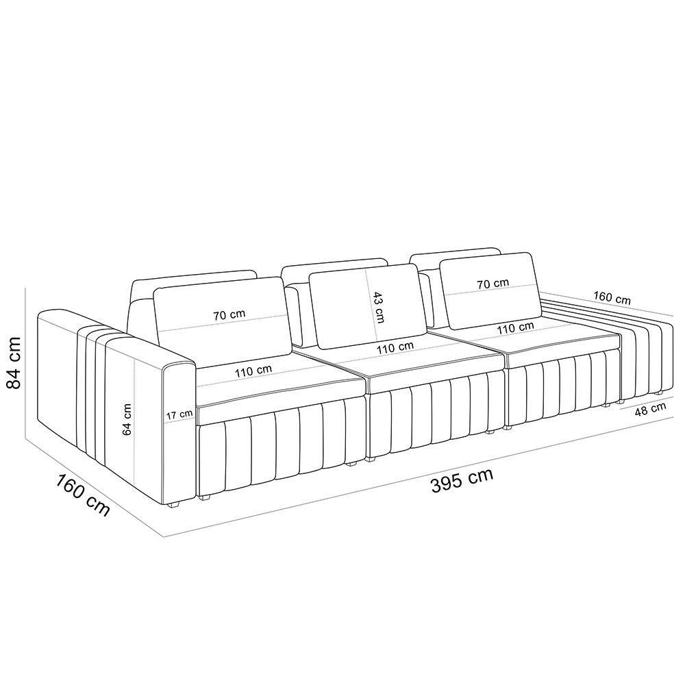 Sofá Ilha Com Puff Para Sala Living 395cm Amber M03 Bouclê Bege Claro - Lyam DecorDesenvolvido para preencher de forma majestosa e integrar harmoniosamente os ambientes integrados, o Sofá Ilha com Puff para Sala Living 395cm Amber, da Lyam Decor, é perfeito para agregar funcionalidade e conforto, enquanto se mostra como uma verdade obra de arte no ambiente. Em outras palavras, esse sofá modulado vai permitir a setorização da área social, sem a necessidade de paredes. Assim, você poderá aproveitar do conceito aberto entre living e sala de ou, ainda, sala de estar e cozinha para desfrutar de momentos inesquecíveis com a família e amigos; afinal, lugares para recebe-los com aconchego não vão faltar. Além disso, os encostos e almofadas são soltos, a fim de oferecer mais dinamicidade de uso. Aproveite essa dualidade de estilo e modernidade e transforme o seu ambiente de um jeito versátil com o Sofá Ilha com Puff Amber.Dimensões do Sofá (L x A x P) 395 x 84 x 160 cmMedidas por Módulo (L x A X P): Braço: 17 x 64 x 160 cm Assento: 110 x 43 x 160 cm Encosto: 80 x 36 x 30 cm Altura do pé: 5 cm Almofadas: 70 x 43 x 13 cm Altura dos pés: 5 cm Puff: 48 x 160 cmCaracterísticas: Estrutura em madeira de reflorestamento (pinus, eucaliptus e placas de MDF) imunizada contra mofo, cupim e micro-organismos. Revestimento em tecido Bouclê de alta qualidade na cor Bege Claro. Encostos soltos tapeçados com espuma D-23 e almofadas soltas com fibra e floco revestida com kami e manta acrílica. Assentos modulados tapeçados com espuma D-26, molas espirais e cintas elásticas de sustentação de alta resistência. Braço tapeçado com espuma D-23 e detalhe bordado na ical. Parte inferior dos assentos, encostos e puff com costura bordada linear. Pés em madeira tingidos e discretos. Peso suportado: Até 120 kg por assento.- Nunca sentar nos braços ou encosto do produto. - Por se tratar de estofado as medidas podem ter uma pequena variação de até 3 cm. - A tonalidade do produto real poderá ter ligeira variação devido o lote de tecidos. - Indicado para uso residencial, sua limpeza deve ser feita com pano levemente umedecido em água limpa, sem esfregar, não utilizar produtos abrasivos, desengordurantes, álcool ou solvente.Observações importantes: - Produto para uso residencial em ambiente interno, não devendo ficar exposto diretamente ao sol, calor e umidade excessivos. - Pode haver alguma diferença de tonalidade entre a imagem e o produto real, por conta do tratamento de imagens e a calibração de cores do seu monitor. - As imagens são meramente ilustrativas, não acompanham objetos de decoração e eletrônicos. - Ao receber a mercadoria, o cliente deve verificar as condições da embalagem, caso haja alguma não assine o de e com nossa para orientações. - Montagem, desmontagem e outras instalações serão de responsabilidade do cliente. Não nos responsabilizamos, no ato da , por subir escadas/elevadores ou pelo por guincho em apartamentos. Eventuais despesas são de responsabilidade do comprador. - Confira as dimensões do produto e certifique-se de que passará normalmente por supostos elevadores, portas, escadas e/ou corredores de sua residência. - Para mais informações, acesse nossa Central de . Cor: Bege Claro | Altura: 84 cm | Color: Bege Claro | ColorFamily: Bege Claro | ColorSimple: Bege Claro | ColorSupplier: Bege Claro | Estilo: Moderno | Fabricante: Lyam Decor | Largura: 395 cm | Material: Madeira de Eucalipto | MaterialFamily: Madeira de Eucalipto | OriginCountry: | OriginState: PR | ProductContents: 01 Sofá Ilha Modulado, Almofadas | Profundidade: 160 cm | SupplierSimpleName: Sofá Ilha com Puff para Sala Living 395cm Amber M03 Bege Claro - Lyam Decor | ProductLength: 160 cm