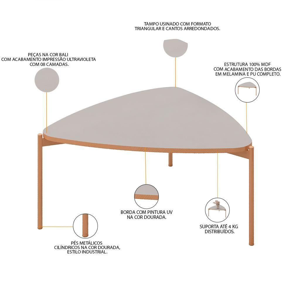 Mesa De Centro Decorativa Sala De Estar Industrial Trina D05 Bali - Lyam DecorInove na decoração da sua sala de estar com a Mesa De Centro Decorativa Sala de Estar Industrial Trina D05 Bali, da Lyam Decor; um verdadeiro destaque para ambientes que buscam um toque moderno e autêntico. Com um design inovador que combina a forma geométrica triangular com a robustez dos pés metálicos, essa mesa é a escolha perfeita para quem aprecia o estilo industrial.Essa mesa de centro possui tampo usinado com cantos arredondados, ou seja, suas linhas limpas e ângulos marcantes não apenas atraem o olhar, mas também otimizam o espaço, tornando-a ideal para sala de estar ou living de diversos tamanhos. Enquanto os pés metálicos garantem estabilidade e durabilidade, a superfície oferece espaço suficiente para exibir livros, revistas, objetos decorativos ou até mesmo um arranjo floral. Além disso, a forma triangular permite que você a posicione de diversas maneiras, facilitando a circulação e proporcionando um layout dinâmico. Aproveite e garanta já a sua! Dimensões do produto (L x A x P) 76,5 x 33,5 x 72,5 cm. Características: Estrutura 100% MDF com acabamento das bordas em Melamina e PU completo. Peças na cor Bali com acabamento impressão ultravioleta com 08 camadas. Tampo usinado com formato triangular e cantos arredondados. Suporta até 4 kg distribuídos. Pés metálicos cilíndricos na cor dourada, estilo industrial. Borda com pintura UV na cor dourada. - Produto entregue desmontado, acompanha manual de montagem. Sistema de montagem: Parafusos. - Este produto deve ser limpo com pano macio e seco. Não utilize produtos abrasivos como álcool e detergente, assim como esponjas rígidas ou palha de aço. - Proteja a superfície do móvel de objetos que transmitam calor ou umidade. Observações importantes: - Produto para uso residencial em ambiente interno, não devendo ficar exposto diretamente ao sol, calor e umidade excessivos. - Pode haver alguma diferença de tonalidade entre a imagem e o produto real, por conta do tratamento de imagens e a calibração de cores do seu monitor. - As imagens são meramente ilustrativas, não acompanham objetos de decoração e eletrônicos. - Ao receber a mercadoria, o cliente deve verificar as condições da embalagem, caso haja alguma não assine o de . - Montagem, desmontagem e outras instalações serão de responsabilidade do cliente. Não nos responsabilizamos, no ato da , por subir escadas/elevadores ou pelo por guincho em apartamentos. Eventuais despesas são de responsabilidade do comprador. - Confira as dimensões do produto e certifique-se de que passará normalmente por supostos elevadores, portas, escadas e/ou corredores de sua residência. Altura: 12 cm | Color: Cinza | ColorFamily: Cinza | ColorSimple: Cinza | ColorSupplier: Bali | Cor: Bali | Diâmetro: -1 | É adequada para exterior: Sim | É dobrável: Não | Forma: -1 | Formato de venda: Unidade | Inclui acessórios de montagem da mesa: Não | Inclui manual de montagem: Sim | Largura: 78 cm | Material: Estrutura 100% MDF com acabamento das bordas em Melamina e PU completo. | MaterialFamily: Madeira | Model: Trina | OriginCountry: | OriginState: PR | Peso: 5 kg | ProductContents: 01 Mesa | ProductHeight: 12 cm | ProductInstructions: Produto para uso em ambiente interno, nao devendo ficar exposto ao sol, calor e umidade excessivos. | ProductLength: 78 cm | ProductWarranty: 90 dias após o do produto | ProductWeight: 5 kg | ProductWidth: 78 cm | Requer montagem: Sim | SizeDescription: Altura: 12 cm x Largura: 78 cm x Profundidade: 78 cm | SupplierSimpleName: Mesa De Centro Decorativa Sala de Estar Industrial Trina D05 Bali - Lyam Decor