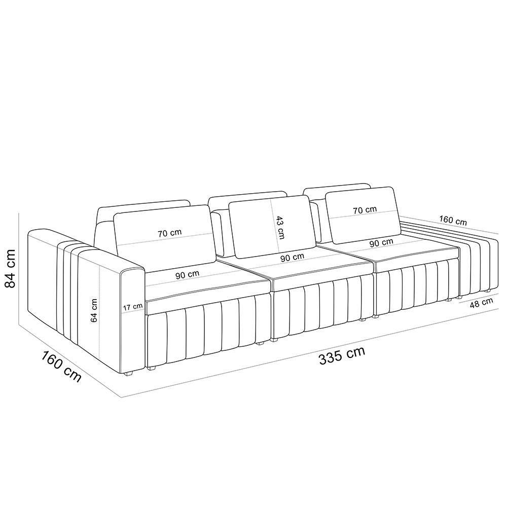 Sofá Ilha Com Puff Para Sala Living 335cm Amber M03 Bouclê Branco - Lyam DecorConhecido pela imponência e versatilidade, o Sofá Ilha com Puff para Sala Living 335cm Amber, da Lyam Decor, é perfeito para quem procura um estofado com a proposta de integrar ambientes com fluidez, além de agregar beleza e conforto. Em outras palavras, esse sofá modulado vai permitir a setorização da área social, sem a necessidade de paredes. Assim, você poderá aproveitar do conceito aberto entre living e sala de ou, ainda, sala de estar e cozinha para desfrutar de momentos inesquecíveis com a família e amigos; afinal, lugares para recebe-los com aconchego não vão faltar. Além disso, os encostos e almofadas são soltos, a fim de oferecer mais dinamicidade de uso. Aproveite essa dualidade de estilo e modernidade e transforme o seu ambiente de um jeito harmonioso e impactante esse Sofá Ilha com Puff Amber.Dimensões do Sofá (L x A x P) 335 x 84 x 160 cmMedidas por Módulo (L x A X P): Braço: 17 x 64 x 160 cm Assento: 90 x 43 x 160 cm Encosto: 80 x 36 x 30 cm Altura do pé: 5 cm Almofadas: 70 x 43 x 13 cm Altura dos pés: 5 cm Puff (L x P): 48 x 160 cmCaracterísticas: Estrutura em madeira de reflorestamento (pinus, eucaliptus e placas de MDF) imunizada contra mofo, cupim e micro-organismos. Revestimento em tecido Bouclê de alta qualidade na cor Branco. Encostos soltos tapeçados com espuma D-23 e almofadas soltas com fibra e floco revestida com kami e manta acrílica. Assentos modulados tapeçados com espuma D-26, molas espirais e cintas elásticas de sustentação de alta resistência. Braço tapeçado com espuma D-23 e detalhe bordado na ical. Parte inferior dos assentos, encostos e puff com costura bordada linear. Pés em madeira tingidos e discretos. Peso suportado: Até 120 kg por assento.- Nunca sentar nos braços ou encosto do produto. - Por se tratar de estofado as medidas podem ter uma pequena variação de até 3 cm. - A tonalidade do produto real poderá ter ligeira variação devido o lote de tecidos. - Indicado para uso residencial, sua limpeza deve ser feita com pano levemente umedecido em água limpa, sem esfregar, não utilizar produtos abrasivos, desengordurantes, álcool ou solvente.Observações importantes: - Produto para uso residencial em ambiente interno, não devendo ficar exposto diretamente ao sol, calor e umidade excessivos. - Pode haver alguma diferença de tonalidade entre a imagem e o produto real, por conta do tratamento de imagens e a calibração de cores do seu monitor. - As imagens são meramente ilustrativas, não acompanham objetos de decoração e eletrônicos. - Ao receber a mercadoria, o cliente deve verificar as condições da embalagem, caso haja alguma não assine o de e com nossa para orientações. - Montagem, desmontagem e outras instalações serão de responsabilidade do cliente. Não nos responsabilizamos, no ato da , por subir escadas/elevadores ou pelo por guincho em apartamentos. Eventuais despesas são de responsabilidade do comprador. - Confira as dimensões do produto e certifique-se de que passará normalmente por supostos elevadores, portas, escadas e/ou corredores de sua residência. - Para mais informações, acesse nossa Central de . Altura: 84 cm | Color: Branco | ColorFamily: Branco | ColorSimple: Branco | ColorSupplier: Branco | Cor: Branco | Cor dos pés: -1 | Densidade da espuma do assento: D-23 | Desenho do tecido: Liso | Estilo: Moderno | Fabricante: Lyam Decor | Formato do sofá: Linear | Largura: 335 cm | Linha: Sala de Estar living | Material: Estrutura em madeira de reflorestamento (pinus, eucaliptus e placas de MDF) imunizada contra mofo, c | Material de enchimento do encosto: Espuma D-23 | Material do estofamento: Bouclê | MaterialFamily: Madeira, Tecido | Mecanismo de abertura do produto: -1 | Model: Amber | Orientação do Sofá: -1 | OriginCountry: | OriginState: PR | Peso: 128 kg | Peso máximo suportado: 150 Kg | ProductContents: 01 Sofá 01 Puff | ProductHeight: 84 cm | ProductInstructions: Produto para uso em ambiente interno, nao devendo ficar exposto ao sol, calor e umidade excessivos. | ProductLength: 160 cm | ProductWarranty: 93 dias após o do produto | ProductWeight: 128 kg | ProductWidth: 335 cm | Profundidade: 160 cm | Quantidade de Caixas de embalagem: 1 | Requer montagem: Não | SizeDescription: Altura: 84 cm x Largura: 335 cm x Profundidade: 160 cm | SupplierSimpleName: Sofá Ilha com Puff para Sala Living 335cm Amber M03 Bouclê Branco - Lyam Decor | Tipo de produto: Sofá | Unidades por kit: 1