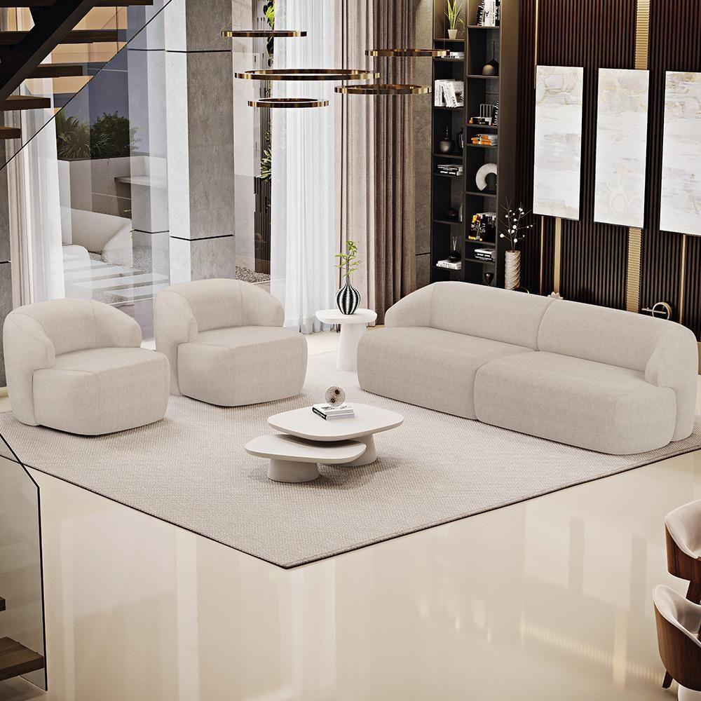 Sofá 3 Lugares Curvo Orgânico Com 02 Poltronas Living 250cm Barolo L06 Linho Bege