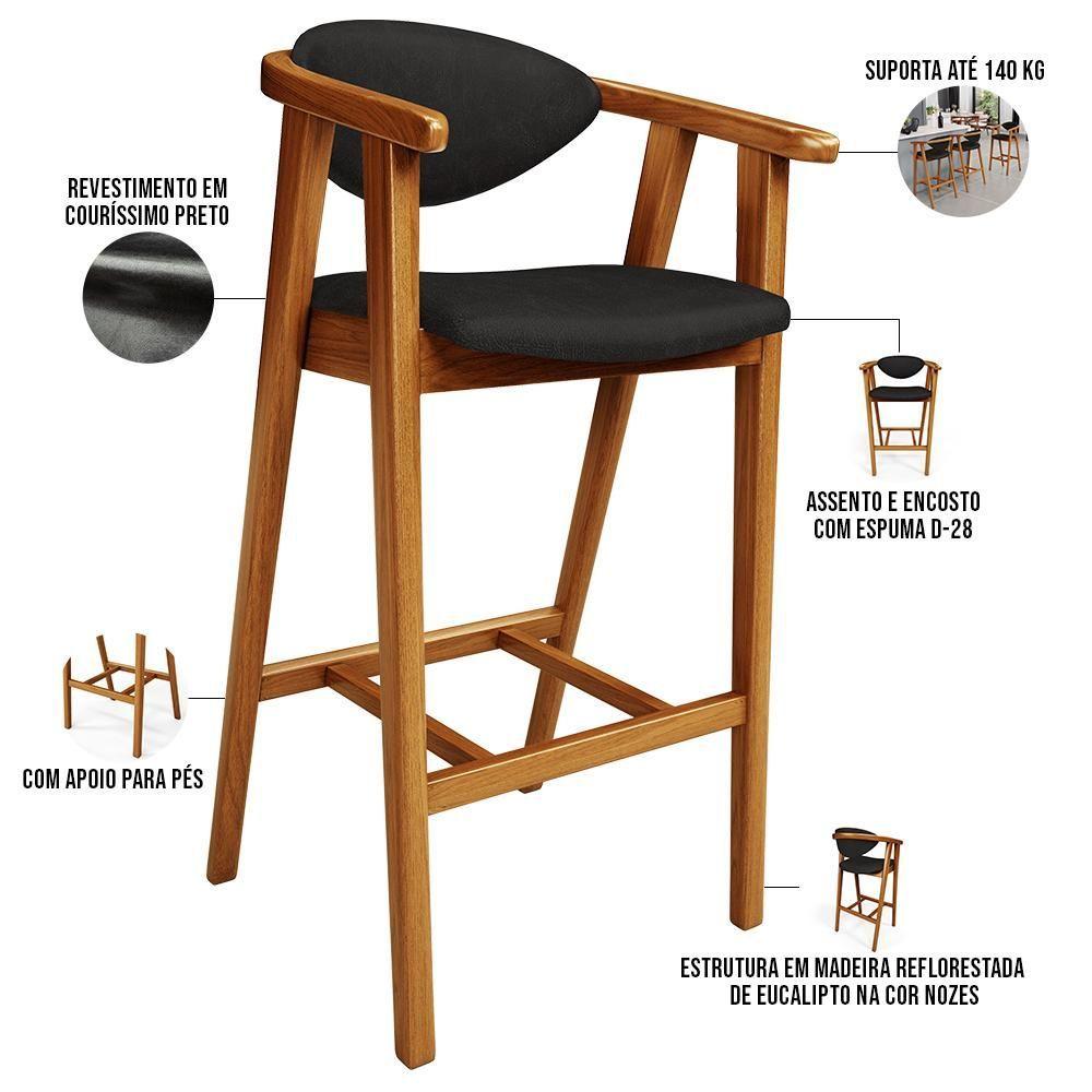 Kit 04 Banquetas Alta Cozinha Bancada Bar Sala De Jantar Fixa Cecília L02 Couríssimo Preto - LyamA melhor escolha para os momentos de confraternização no aconchego da sua casa, acaba de chegar! O Kit 04 Banquetas Altas Cecília vem com a personalidade e elegância que sua decoração merece! É ideal desde refeições rápidas, até um Happy Hour com os amigos, família. Seu design único valoriza o ambiente, sem deixar pra trás a beleza e qualidade! Para deixar a sua área gourmet mais aconchegante, ela possui assento e encosto estofados, confeccionados com materiais de excelente qualidade, e extremamente resistentes.Possui altura ideal, garantindo o encaixe perfeito no ambiente, otimizando seu espaço e promovendo máximo conforto. Pode ser usada em bancada, cozinha americana, home bar, ou área gourmet! As possibilidades são infinitas e as combinações ficarão extremamente elegantes. Adquira já a sua!Dimensões do produto (L x A x P)51 x 102 x 47 cmMedidas Internas:Altura do encosto: 22 cmAltura total do encosto: 33 cmLargura do encosto: 41 cmAltura do assento: 4,5 cmAltura do chão ao braço: 88 cmProfundidade do assento: 46,5 cmLargura do assento: 44 cmAltura interna do braço: 18 cmAltura do chão ao assento: 70 cmAltura do chão ao apoio de pés: 30 cmAltura do apoio de pés: 4,5 cmLargura interna do apoio de pés: 27 cmCaracterísticas:Estrutura em madeira de reflorestamento de eucalipto vermelho tratado.Revestimento em Couríssimo na cor Preto.Assento com espuma D-28.Encosto com espuma D-28.Peso suportado: Até 140 kg.Estrutura de Madeira na cor Nozes.Produto entregue montado.- Por se tratar de estofado as medidas podem ter uma pequena variação de até 3 cm.- A tonalidade do produto real poderá ter ligeira variação devido o lote de tecidos.- A limpeza deve ser feita com pano levemente umedecido em água limpa, sem esfregar, não utilizar produtos abrasivos, desengordurantes, álcool ou solvente.- Nunca sentar nos braços ou encosto do produto.Observações importantes:- Produto para uso residencial em ambiente interno, não devendo ficar exposto diretamente ao sol, calor e umidade excessivos.- Pode haver alguma diferença de tonalidade entre a imagem e o produto real, por conta do tratamento de imagens e a calibração de cores do seu monitor.- As imagens são meramente ilustrativas, não acompanham objetos de decoração e eletrônicos.- Ao receber a mercadoria, o cliente deve verificar as condições da embalagem, caso haja alguma não assine o de .- Montagem, desmontagem e outras instalações serão de responsabilidade do cliente. Não nos responsabilizamos, no ato da , por subir escadas/elevadores ou pelo por guincho em apartamentos. - Confira as dimensões do produto e certifique-se de que passará normalmente por supostos elevadores, portas, escadas e/ou corredores de sua residência.