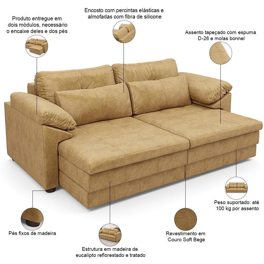 Sofá Retrátil Para Sala De Estar 3 Lugares 215cm Riza S03 Couro Soft Bege - Lyam DecorA Sala de Estar combina com conforto, não é mesmo? Afinal, poder desfrutar de uns momentos de descanso nesse cômodo é uma sensação sem igual. Melhor ainda se for em um estofado lindo e aconchegante! E é isso que você pode conseguir com o Sofá Retrátil Para Sala 3 Lugares 215cm Riza!Este lindo modelo de sofá de couro conta com estrutura em madeira de eucalipto tratado e reflorestado, garantindo uma base forte e resistente. O encosto possui percintas elásticas, também apresenta almofadas com fibra de silicone, assento com espumas e molas bonnel. Com design moderno e elegante, ele combina o que há de melhor na estrutura e elegância com revestimento em couro e a praticidade que só um sofá retrátil consegue oferecer. Com essas características, esse estofado pode transformar sua sala de estar ou sala de TV! Aproveite e garanta o seu! Dimensões do Sofá (L x A x P): 215 x 90 x 120 cm. Medidas Internas: Largura do braço: 25 cm. Largura livre por assento: 82,5 cm. Profundidade do assento aberto: 160 cm. Profundidade do assento fechado: 120 cm. Características: Estrutura em madeira de eucalipto reflorestado e tratado. Assento tapeçado com espuma D-26 e molas bonnel, encosto com percintas elásticas e almofadas com fibra de silicone. Revestimento em Couro Soft de alta qualidade na tonalidade Bege. Necessita encaixe dos pés e dos módulos. Pés fixos de madeira. Suporta até 100 kg por assento. Produto entregue em dois módulos. - Por se tratar de estofado as medidas podem ter uma pequena variação de até 3 cm. - A tonalidade do produto real poderá ter ligeira variação devido o lote de tecidos. - A limpeza deve ser feita com pano levemente umedecido em água limpa, sem esfregar, não utilizar produtos abrasivos, desengordurantes, álcool ou solvente. Observações importantes: - Produto para uso residencial em ambiente interno, não devendo ficar exposto diretamente ao sol, calor e umidade excessivos. - Pode haver alguma diferença de tonalidade entre a imagem e o produto real, por conta do tratamento de imagens e a calibração de cores do seu monitor. - As imagens são meramente ilustrativas, não acompanham objetos de decoração e eletrônicos. - Ao receber a mercadoria, o cliente deve verificar as condições da embalagem, caso haja alguma avaria não assine o comprovante de recebimento. - Montagem, desmontagem e outras instalações serão de responsabilidade do cliente. Não nos responsabilizamos, no ato da entrega, por subir escadas/elevadores ou pelo transporte por guincho em apartamentos. Eventuais despesas são de responsabilidade do comprador. - Confira as dimensões do produto e certifique-se de que passará normalmente por supostos elevadores, portas, escadas e/ou corredores de sua residência. Profundidade: 120 cm | Estilo: Moderno | ColorFamily: Bege | OriginState: PR | SupplierSimpleName: Sofá Retrátil Para Sala de Estar 3 Lugares 215cm Riza S03 Couro Soft Bege - Lyam Decor | ProductLength: 120 cm | Altura: 90 cm | Color: Bege | ColorSupplier: Bege | Largura: 215 cm | Cor: Bege | OriginCountry: Brasil | ColorSimple: Bege | MaterialFamily: Eucalipto, Espuma | Material: Madeira de Eucalipto, Espuma D-26 | Fabricante: Lyam Decor | ProductContents: 01 Sofá