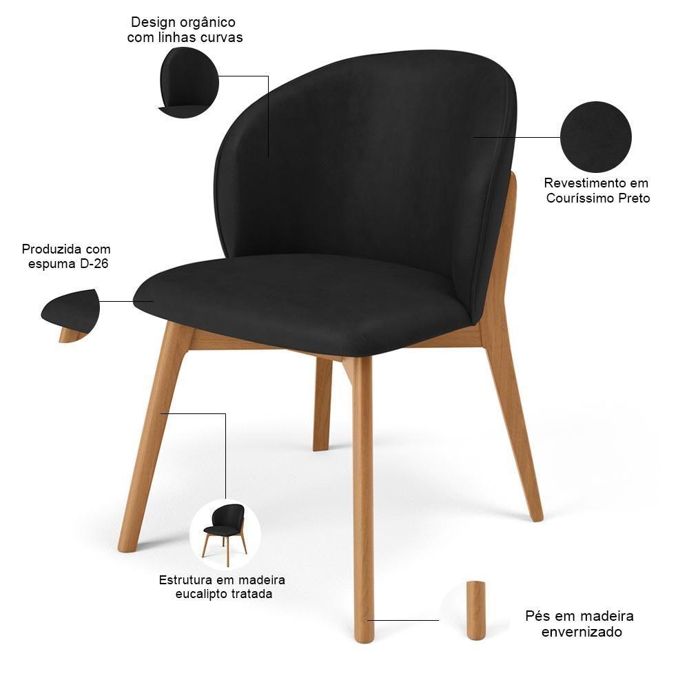 Kit 04 Cadeiras De Jantar E Estar Living Estofada Mia L02 Couríssimo Preto - Lyam Decor O Kit 04 Cadeiras de Jantar e Estar Living Estofada Mia, da Lyam Decor, é a combinação perfeita de design orgânico, conforto e modernidade, expressos em cada detalhe, desde as linhas curvas do assento e encosto até os pés de madeira maciça envernizada. Em outras palavras, essa cadeira estofada é ideal para complementar sua sala de jantar ou estar com elegância e estilo. Além disso, a tapeçaria feita com espuma D-26 oferece um conforto excepcional, permitindo que você desfrute de momentos prazerosos durante suas refeições ou conversas com amigos e familiares. Para completar, essa cadeira de jantar moderna é perfeita para quem busca uma sala de jantar contemporânea, já que seu design único traz uma sensação de beleza e sofisticação ao ambiente e, ainda, harmoniza facilmente com diversos estilos de mesa de jantar. Ah, mas além da sala de jantar, você também pode aproveitá-la como assento extra na sala de estar, recepção, escritório e até mesmo no quarto, ou seja, uma cadeira de madeira versátil como você sempre quis. Então, que tal garantir bem-estar e beleza em um único produto? Adquira agora a Cadeira Mia e transforme seu ambiente em um espaço acolhedor, elegante e cheio de personalidade.Dimensões do produto (L x A x P) 56 cm x 81 cm x 54 cmMedidas internas Altura do assento ao chão: 47 cm Profundidade do assento: 43 cm Altura do encosto: 38 cm Peso aproximado: 8 kgCaracterísticas: Estrutura de Madeira de Eucalipto tratado de reserva legalizada, correto ecologicamente. Revestimento em Couríssimo na cor Preto. Assento e encosto com espuma D-26. Peso máximo suportado por cadeira até 150 kg. Pés em madeira envernizados. Design orgânico, com linhas curvas. Produto entregue montado.- Por se tratar de estofado as medidas podem ter uma pequena variação de até 3 cm. - A tonalidade do produto real poderá ter ligeira variação devido o lote de tecidos. - A limpeza deve ser feita com pano levemente umedecido em água limpa, sem esfregar, não utilizar produtos abrasivos, desengordurantes, álcool ou solvente.Observações importantes: - Produto para uso residencial em ambiente interno, não devendo ficar exposto diretamente ao sol, calor e umidade excessivos. - Pode haver alguma diferença de tonalidade entre a imagem e o produto real, por conta do tratamento de imagens e a calibração de cores do seu monitor. - As imagens são meramente ilustrativas, não acompanham objetos de decoração e eletrônicos. - Ao receber a mercadoria, o cliente deve verificar as condições da embalagem, caso haja alguma não assine o de . - Montagem, desmontagem e outras instalações serão de responsabilidade do cliente. Não nos responsabilizamos, no ato da , por subir escadas/elevadores ou pelo por guincho em apartamentos. Eventuais despesas são de responsabilidade do comprador. - Confira as dimensões do produto e certifique-se de que passará normalmente por supostos elevadores, portas, escadas e/ou corredores de sua residência. ColorFamily: Preto | ColorSupplier: Preto | OriginCountry: | ProductHeight: 81 cm | ProductInstructions: Produto para uso em ambiente interno, nao devendo ficar exposto ao sol, calor e umidade excessivos. | ProductWeight: 28 kg | ProductContents: 04 Cadeiras | SizeDescription: Altura: 81 cm x Largura: 56 cm x Profundidade: 54 cm | Color: Preto | Model: Mia | Material: Estrutura em Madeira, Revestimento em Couro sintético e espuma | ProductWidth: 56 cm | ColorSimple: Preto | MaterialFamily: Madeira, couro sintético e espuma | OriginState: PR | ProductLength: 54 cm | ProductWarranty: 90 dias após o do produto | SupplierSimpleName: Kit 04 Cadeiras de Jantar e Estar Living Estofada Mia L02 Couríssimo Preto - Lyam Decor