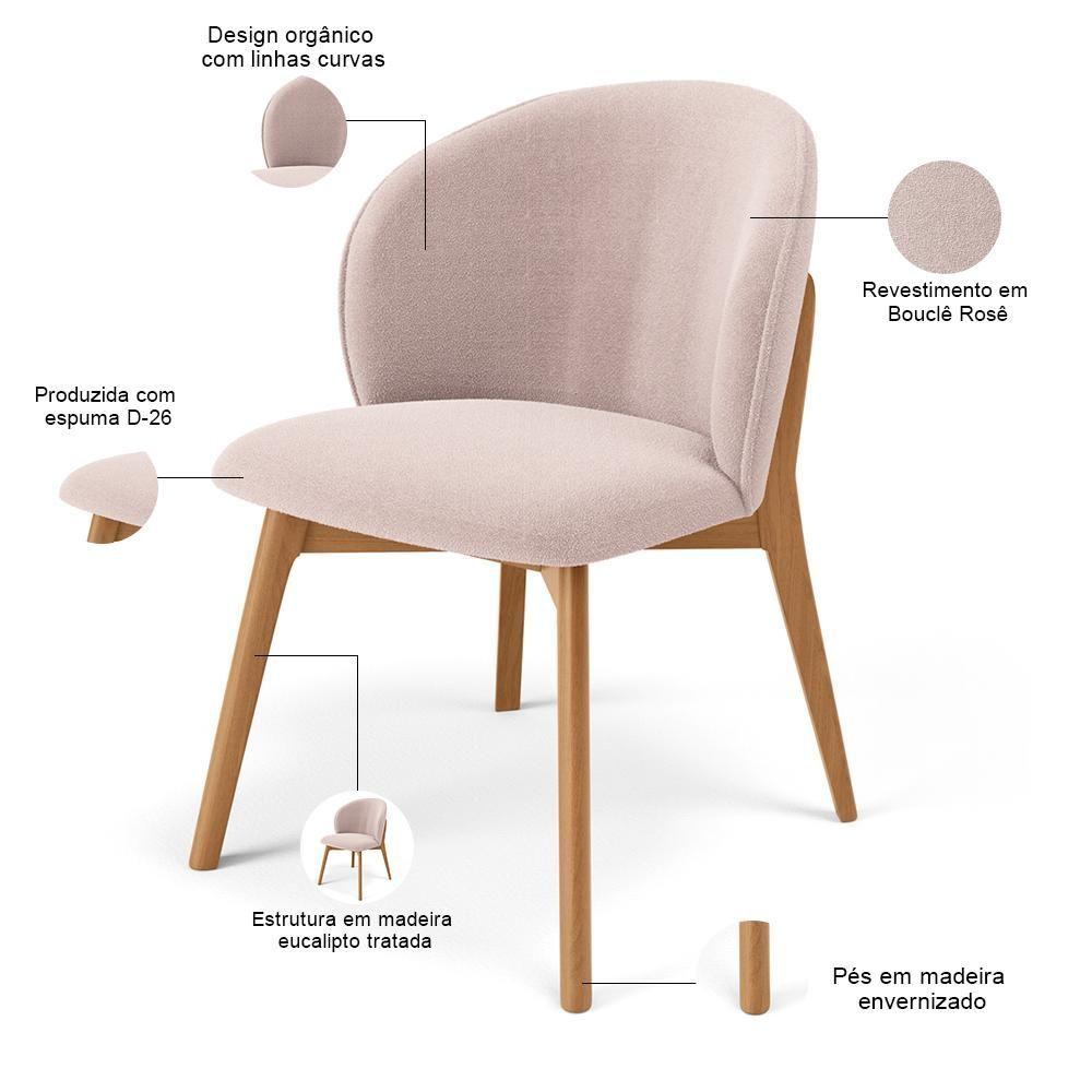 Kit 04 Cadeiras De Jantar E Estar Living Estofada Mia L02 Bouclê Rosê - Lyam Decor O Kit 04 Cadeiras de Jantar e Estar Living Estofada Mia, da Lyam Decor, é a combinação perfeita de design orgânico, conforto e modernidade, expressos em cada detalhe, desde as linhas curvas do assento e encosto até os pés de madeira maciça envernizada. Em outras palavras, essa cadeira estofada é ideal para complementar sua sala de jantar ou estar com elegância e estilo. Além disso, a tapeçaria feita com espuma D-26 oferece um conforto excepcional, permitindo que você desfrute de momentos prazerosos durante suas refeições ou conversas com amigos e familiares. Para completar, essa cadeira de jantar moderna é perfeita para quem busca uma sala de jantar contemporânea, já que seu design único traz uma sensação de beleza e sofisticação ao ambiente e, ainda, harmoniza facilmente com diversos estilos de mesa de jantar. Ah, mas além da sala de jantar, você também pode aproveitá-la como assento extra na sala de estar, recepção, escritório e até mesmo no quarto, ou seja, uma cadeira de madeira versátil como você sempre quis. Então, que tal garantir bem-estar e beleza em um único produto? Adquira agora a Cadeira Mia e transforme seu ambiente em um espaço acolhedor, elegante e cheio de personalidade.Dimensões do produto (L x A x P) 56 cm x 81 cm x 54 cmMedidas internas Altura do assento ao chão: 47 cm Profundidade do assento: 43 cm Altura do encosto: 38 cm Peso aproximado: 8 kgCaracterísticas: Estrutura de Madeira de Eucalipto tratado de reserva legalizada, correto ecologicamente. Revestimento em Bouclê na cor Rosê. Assento e encosto com espuma D-26. Peso máximo suportado por cadeira até 150 kg. Pés em madeira envernizados. Design orgânico, com linhas curvas. Produto entregue montado.- Por se tratar de estofado as medidas podem ter uma pequena variação de até 3 cm. - A tonalidade do produto real poderá ter ligeira variação devido o lote de tecidos. - A limpeza deve ser feita com pano levemente umedecido em água limpa, sem esfregar, não utilizar produtos abrasivos, desengordurantes, álcool ou solvente.Observações importantes: - Produto para uso residencial em ambiente interno, não devendo ficar exposto diretamente ao sol, calor e umidade excessivos. - Pode haver alguma diferença de tonalidade entre a imagem e o produto real, por conta do tratamento de imagens e a calibração de cores do seu monitor. - As imagens são meramente ilustrativas, não acompanham objetos de decoração e eletrônicos. - Ao receber a mercadoria, o cliente deve verificar as condições da embalagem, caso haja alguma não assine o de . - Montagem, desmontagem e outras instalações serão de responsabilidade do cliente. Não nos responsabilizamos, no ato da , por subir escadas/elevadores ou pelo por guincho em apartamentos. Eventuais despesas são de responsabilidade do comprador. - Confira as dimensões do produto e certifique-se de que passará normalmente por supostos elevadores, portas, escadas e/ou corredores de sua residência. ColorSupplier: Rosê | ProductWeight: 28 kg | ColorFamily: Rosa | OriginState: PR | ProductHeight: 81 cm | MaterialFamily: Madeira, Bouclê e espuma | Model: Mia | SizeDescription: Altura: 81 cm x Largura: 56 cm x Profundidade: 54 cm | ProductWarranty: 90 dias após o do produto | OriginCountry: | ProductContents: 04 Cadeiras | ProductWidth: 56 cm | ColorSimple: Rosa | Color: Rosa | Material: Estrutura em Madeira, Revestimento em Bouclê e espuma | ProductInstructions: Produto para uso em ambiente interno, nao devendo ficar exposto ao sol, calor e umidade excessivos. | SupplierSimpleName: Kit 04 Cadeiras de Jantar e Estar Living Estofada Mia L02 Bouclê Rosê - Lyam Decor | ProductLength: 54 cm