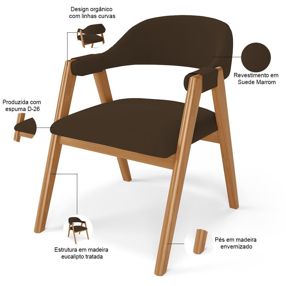 Kit 06 Cadeiras De Jantar E Estar Living Estofada Nadja L02 Suede Marrom - Lyam Decor O Kit 06 Cadeiras de Jantar e Estar Living Estofada Nadja, das Lyam Decor, é a escolha perfeita para criar uma sala de jantar moderna e acolhedora. Com seu design curvo e pés de madeira maciça envernizada, essa cadeira estofada traz elegância e sofisticação ao ambiente. Além disso, é tapeçada com espuma d-26, o que proporciona um conforto excepcional, permitindo que você desfrute de momentos incríveis à mesa. Já o design orgânico combina beleza e modernidade, tornando-a uma peça única, enquanto os braços adicionam um toque extra de conforto e estilo. A Cadeira Nadja é o equilíbrio perfeito entre funcionalidade e design, uma vez que pode facilmente ser utilizada em diversos ambientes, como espaços comerciais, recepção de hotel e eventos, até como poltrona para sala de estar. Adicione esse elemento indispensável à sua decoração e transforme qualquer ambiente em um lugar especial. Não perca a oportunidade de adquirir essa cadeira de jantar que vai encantar a todos.Dimensões do produto (L x A x P) 59,5 cm x 81 cm x 70 cmMedidas internas Altura do assento ao chão: 47 cm Largura do assento: 53,5 cm Profundidade do assento: 47 cm Altura do encosto: 37 cm Altura das braças: 22 cm Peso aproximado: 8 kgCaracterísticas: Estrutura de Madeira de Eucalipto tratado de reserva legalizada, correto ecologicamente. Revestimento em Suede na cor Marrom Assento e encosto com espuma D-26. Peso máximo suportado por cadeira até 150 kg. Pés em madeira envernizados. Design orgânico, com linhas curvas. Produto entregue montado.- Por se tratar de estofado as medidas podem ter uma pequena variação de até 3 cm. - A tonalidade do produto real poderá ter ligeira variação devido o lote de tecidos. - A limpeza deve ser feita com pano levemente umedecido em água limpa, sem esfregar, não utilizar produtos abrasivos, desengordurantes, álcool ou solvente.Observações importantes: - Produto para uso residencial em ambiente interno, não devendo ficar exposto diretamente ao sol, calor e umidade excessivos. - Pode haver alguma diferença de tonalidade entre a imagem e o produto real, por conta do tratamento de imagens e a calibração de cores do seu monitor. - As imagens são meramente ilustrativas, não acompanham objetos de decoração e eletrônicos. - Ao receber a mercadoria, o cliente deve verificar as condições da embalagem, caso haja alguma avaria não assine o comprovante de recebimento. - Montagem, desmontagem e outras instalações serão de responsabilidade do cliente. Não nos responsabilizamos, no ato da entrega, por subir escadas/elevadores ou pelo transporte por guincho em apartamentos. Eventuais despesas são de responsabilidade do comprador. - Confira as dimensões do produto e certifique-se de que passará normalmente por supostos elevadores, portas, escadas e/ou corredores de sua residência. NA