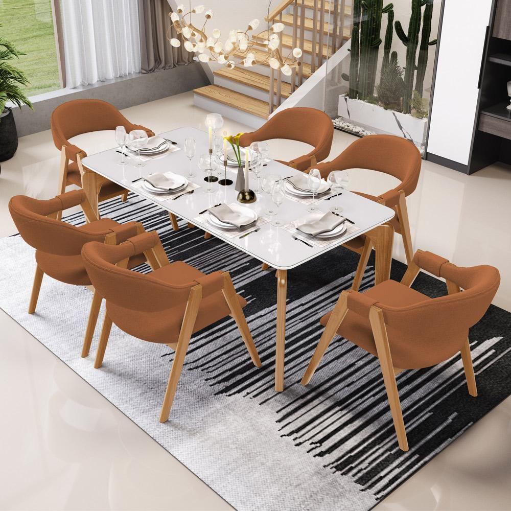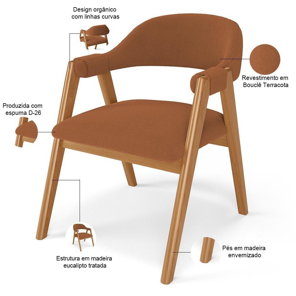 Kit 06 Cadeiras De Jantar E Estar Living Estofada Nadja L02 Bouclê Terracota - Lyam Decor O Kit 06 Cadeiras de Jantar e Estar Living Estofada Nadja, das Lyam Decor, é a escolha perfeita para criar uma sala de jantar moderna e acolhedora. Com seu design curvo e pés de madeira maciça envernizada, essa cadeira estofada traz elegância e sofisticação ao ambiente. Além disso, é tapeçada com espuma d-26, o que proporciona um conforto excepcional, permitindo que você desfrute de momentos incríveis à mesa. Já o design orgânico combina beleza e modernidade, tornando-a uma peça única, enquanto os braços adicionam um toque extra de conforto e estilo. A Cadeira Nadja é o equilíbrio perfeito entre funcionalidade e design, uma vez que pode facilmente ser utilizada em diversos ambientes, como espaços comerciais, recepção de hotel e eventos, até como poltrona para sala de estar. Adicione esse elemento indispensável à sua decoração e transforme qualquer ambiente em um lugar especial. Não perca a oportunidade de adquirir essa cadeira de jantar que vai encantar a todos.Dimensões do produto (L x A x P) 59,5 cm x 81 cm x 70 cmMedidas internas Altura do assento ao chão: 47 cm Largura do assento: 53,5 cm Profundidade do assento: 47 cm Altura do encosto: 37 cm Altura das braças: 22 cm Peso aproximado: 8 kgCaracterísticas: Estrutura de Madeira de Eucalipto tratado de reserva legalizada, correto ecologicamente. Revestimento em Bouclê na cor Terracota Assento e encosto com espuma D-26. Peso máximo suportado por cadeira até 150 kg. Pés em madeira envernizados. Design orgânico, com linhas curvas. Produto entregue montado.- Por se tratar de estofado as medidas podem ter uma pequena variação de até 3 cm. - A tonalidade do produto real poderá ter ligeira variação devido o lote de tecidos. - A limpeza deve ser feita com pano levemente umedecido em água limpa, sem esfregar, não utilizar produtos abrasivos, desengordurantes, álcool ou solvente.Observações importantes: - Produto para uso residencial em ambiente interno, não devendo ficar exposto diretamente ao sol, calor e umidade excessivos. - Pode haver alguma diferença de tonalidade entre a imagem e o produto real, por conta do tratamento de imagens e a calibração de cores do seu monitor. - As imagens são meramente ilustrativas, não acompanham objetos de decoração e eletrônicos. - Ao receber a mercadoria, o cliente deve verificar as condições da embalagem, caso haja alguma avaria não assine o comprovante de recebimento. - Montagem, desmontagem e outras instalações serão de responsabilidade do cliente. Não nos responsabilizamos, no ato da entrega, por subir escadas/elevadores ou pelo transporte por guincho em apartamentos. Eventuais despesas são de responsabilidade do comprador. - Confira as dimensões do produto e certifique-se de que passará normalmente por supostos elevadores, portas, escadas e/ou corredores de sua residência. NA