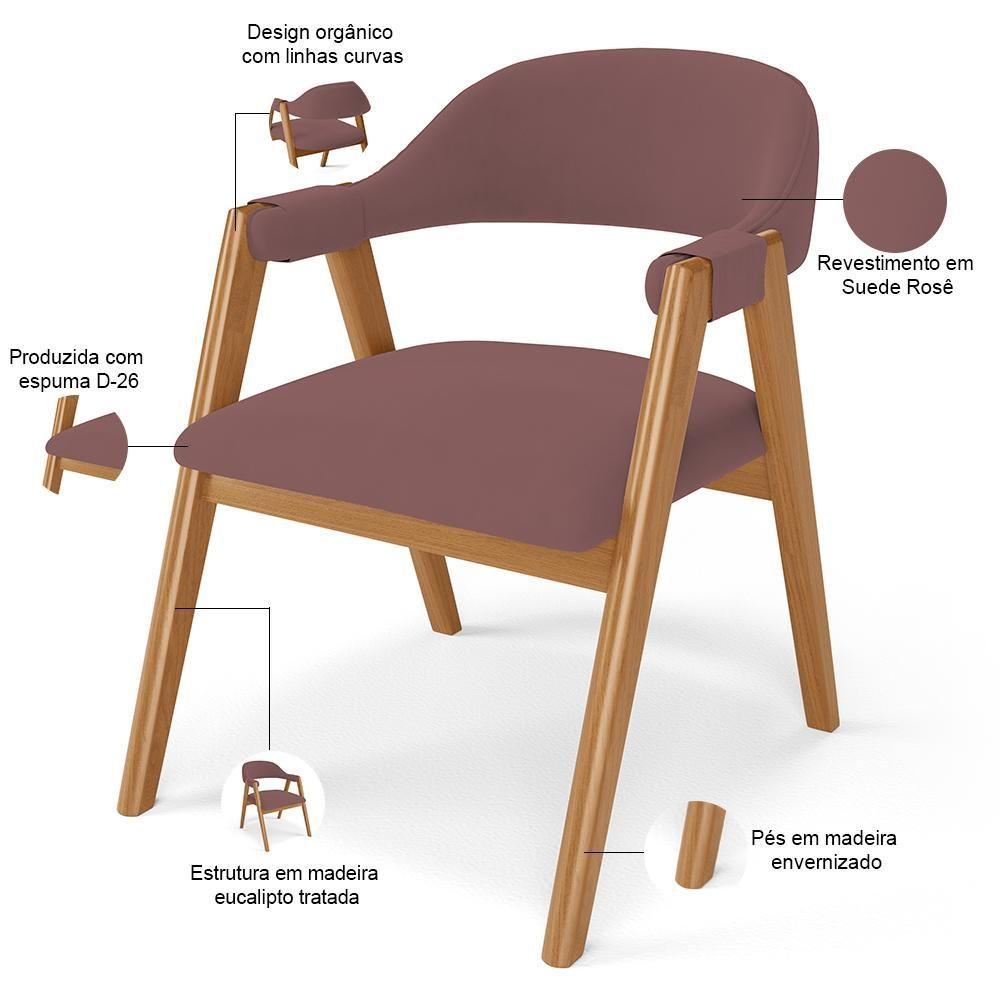 Kit 05 Cadeiras De Jantar E Estar Living Estofada Nadja L02 Suede Rosê - Lyam Decor O Kit 05 Cadeiras de Jantar e Estar Living Estofada Nadja, das Lyam Decor, é a escolha perfeita para criar uma sala de jantar moderna e acolhedora. Com seu design curvo e pés de madeira maciça envernizada, essa cadeira estofada traz elegância e sofisticação ao ambiente. Além disso, é tapeçada com espuma d-26, o que proporciona um conforto excepcional, permitindo que você desfrute de momentos incríveis à mesa. Já o design orgânico combina beleza e modernidade, tornando-a uma peça única, enquanto os braços adicionam um toque extra de conforto e estilo. A Cadeira Nadja é o equilíbrio perfeito entre funcionalidade e design, uma vez que pode facilmente ser utilizada em diversos ambientes, como espaços comerciais, recepção de hotel e eventos, até como poltrona para sala de estar. Adicione esse elemento indispensável à sua decoração e transforme qualquer ambiente em um lugar especial. Não perca a oportunidade de adquirir essa cadeira de jantar que vai encantar a todos.Dimensões do produto (L x A x P) 59,5 cm x 81 cm x 70 cmMedidas internas Altura do assento ao chão: 47 cm Largura do assento: 53,5 cm Profundidade do assento: 47 cm Altura do encosto: 37 cm Altura das braças: 22 cm Peso aproximado: 8 kgCaracterísticas: Estrutura de Madeira de Eucalipto tratado de reserva legalizada, correto ecologicamente. Revestimento em Suede na cor Rosê Assento e encosto com espuma D-26. Peso máximo suportado por cadeira até 150 kg. Pés em madeira envernizados. Design orgânico, com linhas curvas. Produto entregue montado.- Por se tratar de estofado as medidas podem ter uma pequena variação de até 3 cm. - A tonalidade do produto real poderá ter ligeira variação devido o lote de tecidos. - A limpeza deve ser feita com pano levemente umedecido em água limpa, sem esfregar, não utilizar produtos abrasivos, desengordurantes, álcool ou solvente.Observações importantes: - Produto para uso residencial em ambiente interno, não devendo ficar exposto diretamente ao sol, calor e umidade excessivos. - Pode haver alguma diferença de tonalidade entre a imagem e o produto real, por conta do tratamento de imagens e a calibração de cores do seu monitor. - As imagens são meramente ilustrativas, não acompanham objetos de decoração e eletrônicos. - Ao receber a mercadoria, o cliente deve verificar as condições da embalagem, caso haja alguma avaria não assine o comprovante de recebimento. - Montagem, desmontagem e outras instalações serão de responsabilidade do cliente. Não nos responsabilizamos, no ato da entrega, por subir escadas/elevadores ou pelo transporte por guincho em apartamentos. Eventuais despesas são de responsabilidade do comprador. - Confira as dimensões do produto e certifique-se de que passará normalmente por supostos elevadores, portas, escadas e/ou corredores de sua residência. NA