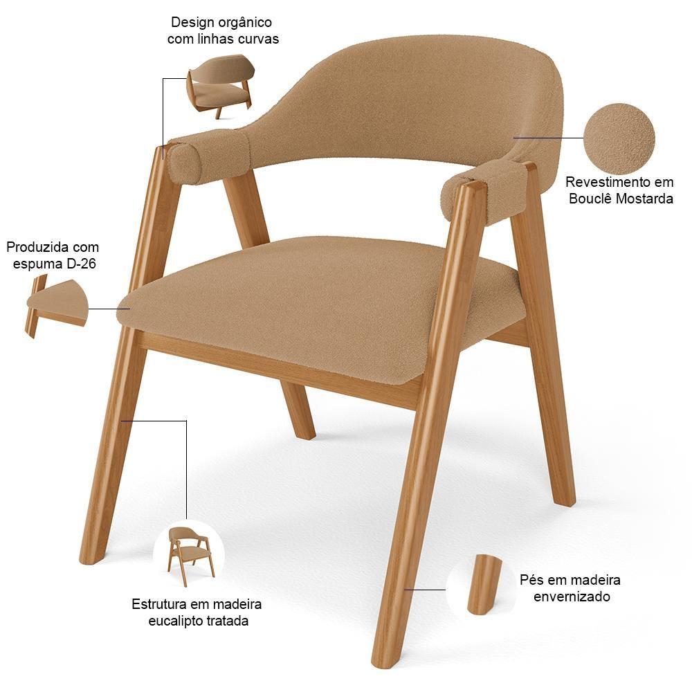 Kit 06 Cadeiras De Jantar E Estar Living Estofada Nadja L02 Bouclê Mostarda - Lyam Decor O Kit 06 Cadeiras de Jantar e Estar Living Estofada Nadja, das Lyam Decor, é a escolha perfeita para criar uma sala de jantar moderna e acolhedora. Com seu design curvo e pés de madeira maciça envernizada, essa cadeira estofada traz elegância e sofisticação ao ambiente. Além disso, é tapeçada com espuma d-26, o que proporciona um conforto excepcional, permitindo que você desfrute de momentos incríveis à mesa. Já o design orgânico combina beleza e modernidade, tornando-a uma peça única, enquanto os braços adicionam um toque extra de conforto e estilo. A Cadeira Nadja é o equilíbrio perfeito entre funcionalidade e design, uma vez que pode facilmente ser utilizada em diversos ambientes, como espaços comerciais, recepção de hotel e eventos, até como poltrona para sala de estar. Adicione esse elemento indispensável à sua decoração e transforme qualquer ambiente em um lugar especial. Não perca a oportunidade de adquirir essa cadeira de jantar que vai encantar a todos.Dimensões do produto (L x A x P) 59,5 cm x 81 cm x 70 cmMedidas internas Altura do assento ao chão: 47 cm Largura do assento: 53,5 cm Profundidade do assento: 47 cm Altura do encosto: 37 cm Altura das braças: 22 cm Peso aproximado: 8 kgCaracterísticas: Estrutura de Madeira de Eucalipto tratado de reserva legalizada, correto ecologicamente. Revestimento em Bouclê na cor Mostarda Assento e encosto com espuma D-26. Peso máximo suportado por cadeira até 150 kg. Pés em madeira envernizados. Design orgânico, com linhas curvas. Produto entregue montado.- Por se tratar de estofado as medidas podem ter uma pequena variação de até 3 cm. - A tonalidade do produto real poderá ter ligeira variação devido o lote de tecidos. - A limpeza deve ser feita com pano levemente umedecido em água limpa, sem esfregar, não utilizar produtos abrasivos, desengordurantes, álcool ou solvente.Observações importantes: - Produto para uso residencial em ambiente interno, não devendo ficar exposto diretamente ao sol, calor e umidade excessivos. - Pode haver alguma diferença de tonalidade entre a imagem e o produto real, por conta do tratamento de imagens e a calibração de cores do seu monitor. - As imagens são meramente ilustrativas, não acompanham objetos de decoração e eletrônicos. - Ao receber a mercadoria, o cliente deve verificar as condições da embalagem, caso haja alguma avaria não assine o comprovante de recebimento. - Montagem, desmontagem e outras instalações serão de responsabilidade do cliente. Não nos responsabilizamos, no ato da entrega, por subir escadas/elevadores ou pelo transporte por guincho em apartamentos. Eventuais despesas são de responsabilidade do comprador. - Confira as dimensões do produto e certifique-se de que passará normalmente por supostos elevadores, portas, escadas e/ou corredores de sua residência. NA