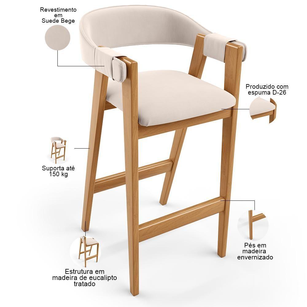 Kit 06 Banquetas Alta Bar Cozinha Sala De Jantar Bar Nadja L02 Suede Bege - Lyam DecorA Banqueta Alta Nadja da Lyam Decor, é a escolha perfeita para criar uma sala de jantar moderna e acolhedora. Com seu design curvo e pés de madeira maciça envernizada, essa banqueta estofada traz elegância e sofisticação ao ambiente. Além disso, é tapeçada com espuma d-26, o que proporciona um conforto excepcional, permitindo que você desfrute de momentos incríveis à mesa. Já o design orgânico combina beleza e modernidade, tornando-a uma peça única, enquanto os braços adicionam um toque extra de conforto e estilo. A Banqueta Nadja é o equilíbrio perfeito entre funcionalidade e design, uma vez que pode facilmente ser utilizada em diversos ambientes, como área gourmet, cozinhas, bancadas e até em eventos eventos. Adicione esse elemento indispensável à sua decoração e transforme qualquer ambiente em um lugar especial. Não perca a oportunidade de adquirir essa banqueta alta que vai encantar a todos.Dimensões do produto (L x A x P) 54 cm x 98,5 cm x 49 cmMedidas internas Altura do assento ao chão: 76 cm Largura do assento: 43,5 cm Profundidade do assento: 43 cm Altura do encosto: 24 cm Altura das braças: 17 cm Altura do chão ao braço: 92,5 cmCaracterísticas: Estrutura de Madeira de Eucalipto tratado de reserva legalizada, correto ecologicamente. Revestimento em suede cor bege. Assento e encosto com espuma D-26. Peso máximo suportado por banqueta até 150 kg. Pés em madeira envernizados. Design orgânico, com linhas curvas. Produto entregue montado.- Por se tratar de estofado as medidas podem ter uma pequena variação de até 3 cm. - A tonalidade do produto real poderá ter ligeira variação devido o lote de tecidos. - A limpeza deve ser feita com pano levemente umedecido em água limpa, sem esfregar, não utilizar produtos abrasivos, desengordurantes, álcool ou solvente.Observações importantes: - Produto para uso residencial em ambiente interno, não devendo ficar exposto diretamente ao sol, calor e umidade excessivos. - Pode haver alguma diferença de tonalidade entre a imagem e o produto real, por conta do tratamento de imagens e a calibração de cores do seu monitor. - As imagens são meramente ilustrativas, não acompanham objetos de decoração e eletrônicos. - Ao receber a mercadoria, o cliente deve verificar as condições da embalagem, caso haja alguma avaria não assine o comprovante de recebimento. - Montagem, desmontagem e outras instalações serão de responsabilidade do cliente. Não nos responsabilizamos, no ato da entrega, por subir escadas/elevadores ou pelo transporte por guincho em apartamentos. Eventuais despesas são de responsabilidade do comprador. - Confira as dimensões do produto e certifique-se de que passará normalmente por supostos elevadores, portas, escadas e/ou corredores de sua residência. MaterialFamily: Madeira, Suede e espuma | ColorSimple: Bege | ColorSupplier: Bege | Model: Nadja | Material: Estrutura em Madeira, Revestimento em Suede e espuma | Color: Bege | ColorFamily: Bege | OriginCountry: Nacional | OriginState: PR | ProductContents: 06 Banquetas | ProductHeight: 260 cm | ProductInstructions: Produto para uso em ambiente interno, nao devendo ficar exposto ao sol, calor e umidade excessivos. | ProductLength: 53 cm | ProductWarranty: 90 dias após o recebimento do produto | ProductWeight: 60 kg | ProductWidth: 52 cm | SizeDescription: Altura: 260 cm x Largura: 52 cm x Profundidade: 53 cm | SupplierSimpleName: Kit 06 Banquetas Alta Bar Cozinha Sala de Jantar Bar Nadja L02 Suede Bege - Lyam Decor