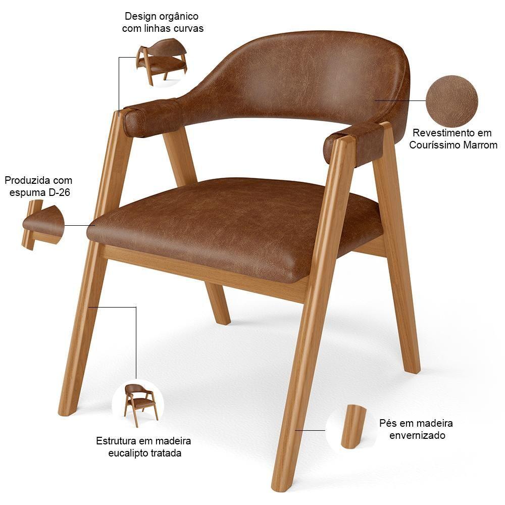 Kit 03 Cadeiras De Jantar E Estar Living Estofada Nadja L02 Couríssimo Marrom - Lyam Decor O Kit 03 Cadeiras de Jantar e Estar Living Estofada Nadja, das Lyam Decor, é a escolha perfeita para criar uma sala de jantar moderna e acolhedora. Com seu design curvo e pés de madeira maciça envernizada, essa cadeira estofada traz elegância e sofisticação ao ambiente. Além disso, é tapeçada com espuma d-26, o que proporciona um conforto excepcional, permitindo que você desfrute de momentos incríveis à mesa. Já o design orgânico combina beleza e modernidade, tornando-a uma peça única, enquanto os braços adicionam um toque extra de conforto e estilo. A Cadeira Nadja é o equilíbrio perfeito entre funcionalidade e design, uma vez que pode facilmente ser utilizada em diversos ambientes, como espaços comerciais, recepção de hotel e eventos, até como poltrona para sala de estar. Adicione esse elemento indispensável à sua decoração e transforme qualquer ambiente em um lugar especial. Não perca a oportunidade de adquirir essa cadeira de jantar que vai encantar a todos.Dimensões do produto (L x A x P) 59,5 cm x 81 cm x 70 cmMedidas internas Altura do assento ao chão: 47 cm Largura do assento: 53,5 cm Profundidade do assento: 47 cm Altura do encosto: 37 cm Altura das braças: 22 cm Peso aproximado: 8 kgCaracterísticas: Estrutura de Madeira de Eucalipto tratado de reserva legalizada, correto ecologicamente. Revestimento em Couríssimo na cor Marrom. Assento e encosto com espuma D-26. Peso máximo suportado por cadeira até 150 kg. Pés em madeira envernizados. Design orgânico, com linhas curvas. Produto entregue montado.- Por se tratar de estofado as medidas podem ter uma pequena variação de até 3 cm. - A tonalidade do produto real poderá ter ligeira variação devido o lote de tecidos. - A limpeza deve ser feita com pano levemente umedecido em água limpa, sem esfregar, não utilizar produtos abrasivos, desengordurantes, álcool ou solvente.Observações importantes: - Produto para uso residencial em ambiente interno, não devendo ficar exposto diretamente ao sol, calor e umidade excessivos. - Pode haver alguma diferença de tonalidade entre a imagem e o produto real, por conta do tratamento de imagens e a calibração de cores do seu monitor. - As imagens são meramente ilustrativas, não acompanham objetos de decoração e eletrônicos. - Ao receber a mercadoria, o cliente deve verificar as condições da embalagem, caso haja alguma avaria não assine o comprovante de recebimento. - Montagem, desmontagem e outras instalações serão de responsabilidade do cliente. Não nos responsabilizamos, no ato da entrega, por subir escadas/elevadores ou pelo transporte por guincho em apartamentos. Eventuais despesas são de responsabilidade do comprador. - Confira as dimensões do produto e certifique-se de que passará normalmente por supostos elevadores, portas, escadas e/ou corredores de sua residência. NA