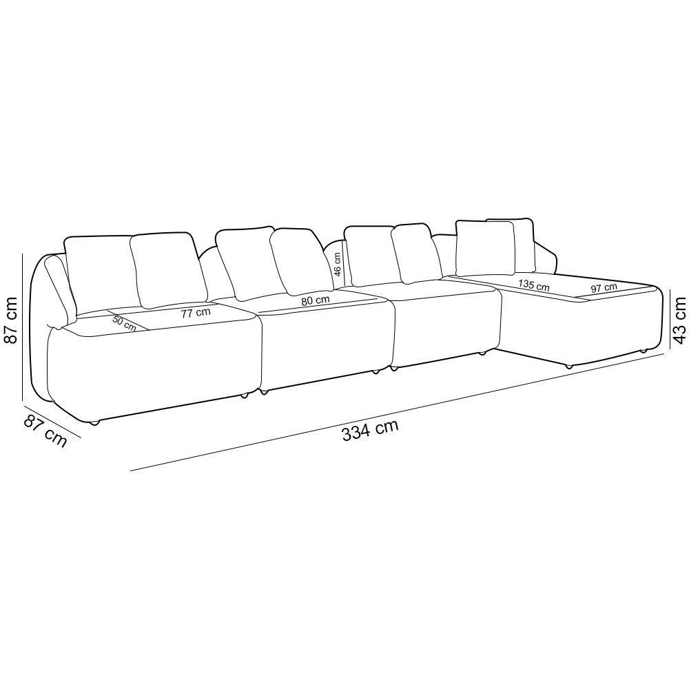 Sofá 5 Lugares Com Chaise Direito Sala Living 334cm Arlo F04 Veludo Bege - Lyam DecorRenove sua sala de estar com o Sofá com Chaise Arlo 334cm, da Lyam Decor, uma peça que exala conforto e elegância sem medidas.Com linhas curvas e estilo orgânico, esse sofá modulado é um convite à descontração, perfeito para criar memórias com família e amigos. Isso porque a estrutura robusta e tapeçaria de alta qualidade garantem uma maciez inigualável, fazendo com que cada momento se torne uma experiência de pura satisfação. Seja para um bate-papo animado ou uma tarde de filmes, esse sofá 5 lugares se adapta a todas as suas necessidades. Afinal, o Sofá Arlo não é apenas um estofado; mas será o coração do seu living, onde aconchego e estilo se encontram. Escolha a beleza do design contemporâneo e aproveite cada instante ao lado das pessoas que você ama. Dimensões total do produto (L x A x P) 334 x 87 x 135 cm Medidas Internas Largura do assento com braço: 77 cm Largura do assento sem braço: 80 cm Profundidade livre dos assentos: 50 cm Profundidade total dos assentos: 87 cm Chaise (L x P): 97 x 135 cm Altura do encosto: 46 cm Altura do chão ao assento: 43 cm Características: Estrutura em madeira de lei Eucalipto tratada e aparelha com reforços e cantoneiras. Revestimento em tecido Veludo de alta qualidade na tonalidade Bege. Sofá modulado contendo: 01 assento com braço, 02 assentos sem braço e 01 chaise. Assento fixo composto por espuma D-26 e molas espirais. Encosto fixo com almofadas soltas compostas por fibra siliconada. Percintas elásticas nos encostos e assentos, para maior resistência e durabilidade. Braços fixos compostos por espuma D-20. Chaise lado direito olhando de frente. Pés em madeira fixos. Peso suportado: até 120 kg por assento. - Por se tratar de estofado as medidas podem ter uma pequena variação de até 3 cm. - A tonalidade do produto real poderá ter ligeira variação devido o lote de tecidos. - A limpeza deve ser feita com pano levemente umedecido em água limpa, sem esfregar, não utilizar produtos abrasivos, desengordurantes, álcool ou solvente. Observações importantes: - Produto para uso residencial em ambiente interno, não devendo ficar exposto diretamente ao sol, calor e umidade excessivos. - Pode haver alguma diferença de tonalidade entre a imagem e o produto real, por conta do tratamento de imagens e a calibração de cores do seu monitor. - As imagens são meramente ilustrativas, não acompanham objetos de decoração e eletrônicos. - Ao receber a mercadoria, o cliente deve verificar as condições da embalagem, caso haja alguma avaria não assine o comprovante de recebimento. - Montagem, desmontagem e outras instalações serão de responsabilidade do cliente. Não nos responsabilizamos, no ato da entrega, por subir escadas/elevadores ou pelo transporte por guincho em apartamentos. Eventuais despesas são de responsabilidade do comprador. - Confira as dimensões do produto e certifique-se de que passará normalmente por supostos elevadores, portas, escadas e/ou corredores de sua residência. Cor: Bege | ProductLength: 135 cm | Orientação do Sofá: Linear | Requer montagem: Não | Mecanismo de abertura do produto: na | ProductHeight: 87 cm | Cor dos pés: Marrom Escuro | ProductInstructions: Produto para uso em ambiente interno, nao devendo ficar exposto ao sol, calor e umidade excessivos. | Quantidade de Caixas de embalagem: 4 | Color: Bege | Unidades por kit: 1 | Fabricante: Lyam Decor | Estilo: Moderno | Largura: 334 cm | ColorFamily: Bege | Altura: 87 cm | Formato do sofá: Orgânico | Material de enchimento do encosto: Fibra Siliconada | ColorSimple: Bege | Model: Arlo | Densidade da espuma do assento: D-26 | Tipo de produto: Sofá Modulado com Chaise | Peso máximo suportado: 480 kg | Desenho do tecido: Liso | Linha: Sala de Estar, Living | MaterialFamily: Madeira de Eucalipto | OriginCountry: Brasil | ProductWeight: 185 kg | SupplierSimpleName: Sofá 5 Lugares com Chaise Direito Sala Living 334cm Arlo F04 Veludo Bege - Lyam Decor | Peso: 185 kg | ColorSupplier: Bege | Material do estofamento: Veludo | ProductWidth: 334 cm | Material: Madeira de Eucalipto, Cantoneiras, Chapas em MDF | Profundidade: 135 cm | OriginState: PR | ProductContents: 01 Sofá | ProductWarranty: 90 dias após o recebimento do produto | SizeDescription: Altura: 87 cm x Largura: 334 cm x Profundidade: 135 cm