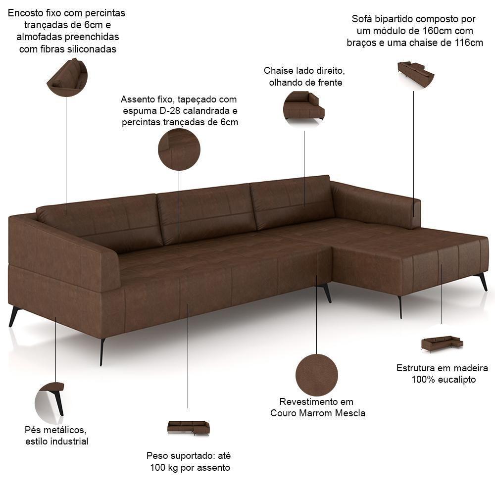 Sofá 3 Lugares Com Chaise Para Sala Living 292cm Tolstoi P08 Couro Marrom Mescla - Lyam DecorO Sofá 3 Lugares Tolstoi 292cm, da Lyam Decor é a declaração definitiva de estilo e funcionalidade. Com seu design moderno e pés metálicos de inspiração industrial, ele traz um ar urbano e sofisticado para sua sala de estar ou living, sem abrir mão do conforto mais luxuoso.Esse sofá com chaise integrada é um convite irrecusável ao relaxamento - perfeito para esticar as pernas após um longo dia ou acomodar visitas com elegância. Os assentos e encostos generosos, combinados com materiais premium, garantam um apoio suave e duradouro, enquanto a estrutura reforçada assegura resistência sem igual. Além disso, por ser um sofá de couro a durabilidade e fácil manutenção estão garantidas, adaptando-se ao seu estilo de vida. Mais que um sofá para sala, um refúgio de conforto e design. O Sofá Tolstoi com Chaise é a escolha ideal para quem busca sofisticação, praticidade e um toque de ousadia na decoração. Surpreenda-se e leve para casa o equilíbrio perfeito entre robustez e requinte. Dimensões total do produto (L x A x P) 292 x 61 x 150 cm Medidas Internas Módulo 2 lugares (L x P): 160 x 97 cm Largura livre chaise: 100 cm Largura dos braços: 16 cm Altura do chão ao assento: 45 cm Altura dos pés: 19 cm Características: Estrutura em madeira 100% eucalipto. Revestimento em tecido Couro de alta qualidade na tonalidade Marrom Mescla. Encosto fixo com percintas trançadas de 6cm e almofadas preenchidas com fibras siliconadas. Assento fixo, tapeçado com espuma D-28 calandrada e percintas trançadas de 6cm para melhor sustentação. Sofá bipartido composto por um módulo de 160cm com braços e uma chaise de 116cm. Chaise lado direito, olhando de frente Pés metálicos, estilo industrial. Peso suportado: até 100 kg por assento. - Por se tratar de estofado as medidas podem ter uma pequena variação de até 3 cm. - A tonalidade do produto real poderá ter ligeira variação devido o lote de tecidos. - A limpeza deve ser feita com pano levemente umedecido em água limpa, sem esfregar, não utilizar produtos abrasivos, desengordurantes, álcool ou solvente. Observações importantes: - Produto para uso residencial em ambiente interno, não devendo ficar exposto diretamente ao sol, calor e umidade excessivos. - Pode haver alguma diferença de tonalidade entre a imagem e o produto real, por conta do tratamento de imagens e a calibração de cores do seu monitor. - As imagens são meramente ilustrativas, não acompanham objetos de decoração e eletrônicos. - Ao receber a mercadoria, o cliente deve verificar as condições da embalagem, caso haja alguma avaria não assine o comprovante de recebimento. - Montagem, desmontagem e outras instalações serão de responsabilidade do cliente. Não nos responsabilizamos, no ato da entrega, por subir escadas/elevadores ou pelo transporte por guincho em apartamentos. Eventuais despesas são de responsabilidade do comprador. - Confira as dimensões do produto e certifique-se de que passará normalmente por supostos elevadores, portas, escadas e/ou corredores de sua residência. Cor dos pés: Marrom | Profundidade: 150 cm | Quantidade de Caixas de embalagem: 2 | Unidades por kit: 2 | Peso máximo suportado: 300 kg | Cor: Marrom Mescla | Formato do sofá: Linear com Chaise | Fabricante: Lyam Decor | Desenho do tecido: Liso | Requer montagem: Não, apenas o encaixe dos pés | Altura: 61 cm | Peso: 93 kg | Orientação do Sofá: Frontal | Material do estofamento: Couro | Material de enchimento do encosto: Fibras Siliconadas | Linha: Sala de Estar, Living | Densidade da espuma do assento: D-28 | Largura: 292 cm | Tipo de produto: Sofá Living | Mecanismo de abertura do produto: na | Estilo: Moderno