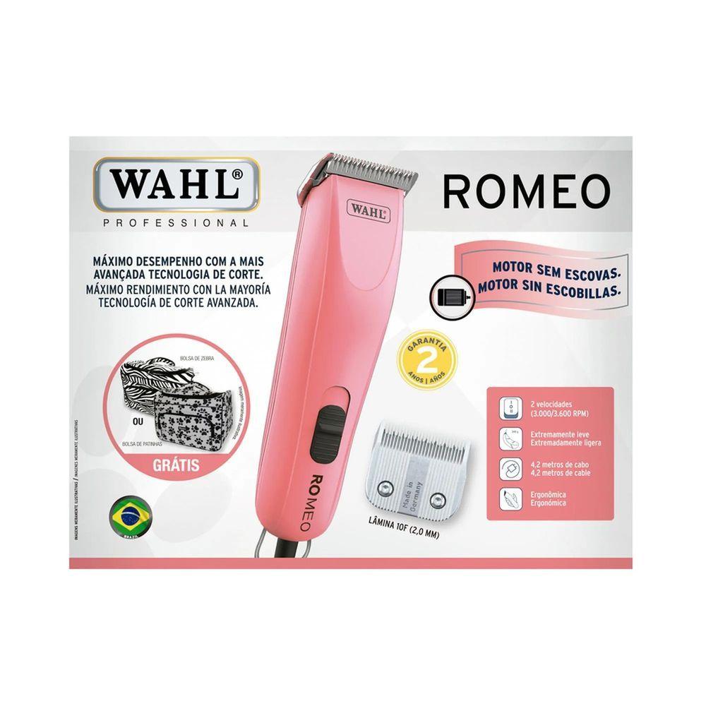 Máquina De Tosa Animal Wahl RomeoModelo: RomeoA Máquina de Tosa Animal Wahl Romeo é um modelo de alta qualidade, projetada especificamente para animais de estimação. Ela é fabricada com materiais duráveis e resistentes, garantindo uma longa vida útil.A Romeo é equipada com um motor potente e silencioso que permite a tosa eficiente e suave dos pelos do animal, sem causar desconforto ou estresse ao pet. Além disso, possui lâminas de alta precisão, que garantem um corte uniforme e sem puxões.A Wahl foi fundada no ano de 1919 e se tornou líder no mercado profissional e doméstico, com a fabricação de máquinas de corte elétrico, pois além da fabricação de máquinas para uso pessoal a indústria também faz a fabricação de máquinas para uso animal.A mais de 100 anos atuando no ramo, a empresa busca sempre proporcionar qualidade e excelência através dos produtos.CaracterísticasCabo: 4,2 metros de caboOutrosInformação adicional:? Máquina de Tosa Profissional com 2 velocidades: 3000 e 3600 rpm;? Silenciosa;? Leve e ergonômica - 340 gramas;? Maior Durabilidade;? Não esquenta (baixa temperatura);? Lâmina #10F fabricada na Alemanha;
