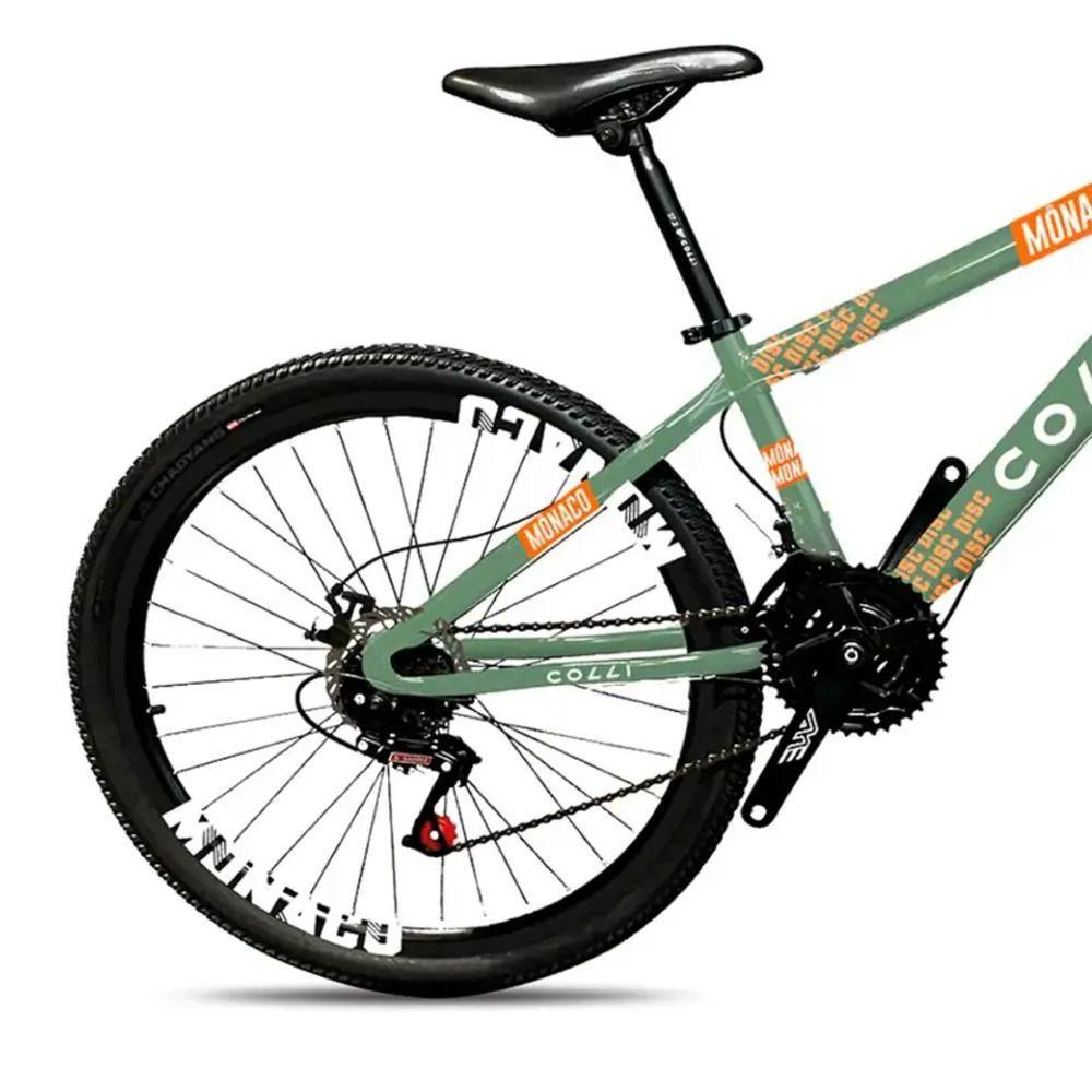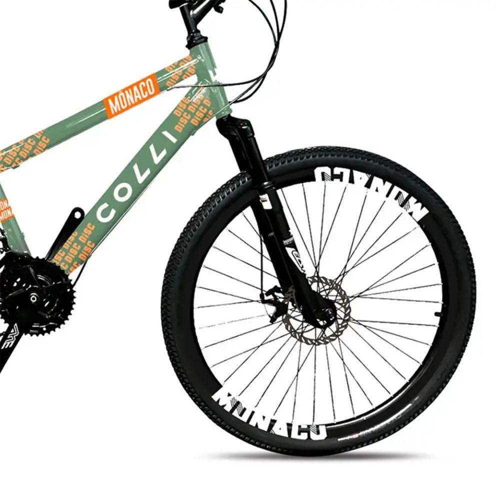 Bic. Colli Monaco 21v - 230-14d Verde MilitarBicicleta Aro 26 Colli Monaco 21 Marchas Freio a DiscoA Bicicleta Colli M?naco ? pensada para proporcionar um excelente desempenho em diversas condi??es de terreno, combinando robustez, conforto e seguran?a. Ideal para ciclistas a partir de 12 anos, esta bicicleta suporta at? 100 kg, sendo perfeita para jovens e adultos que buscam aventuras ao ar livre ou um meio eficiente de . Confira mais detalhes:Qualidades de impressionar!A Bicicleta Colli M?naco vem equipada com alavancas rapid fire de 3/7 velocidades, permitindo mudan?as r?pidas e precisas. As rodas possuem aros 26 aero com 36 furos e freios a disco, garantindo uma frenagem eficiente e segura. A corrente fina de 1/2x3/32 e a suspens?o no garfo aro 26 com rosca para disco asseguram uma pedalada suave, mesmo em terrenos irregulares. O quadro aro 26 M?naco ? robusto e leve, perfeito para manobras e conforto. Os pneus oferecem ader?ncia e estabilidade.