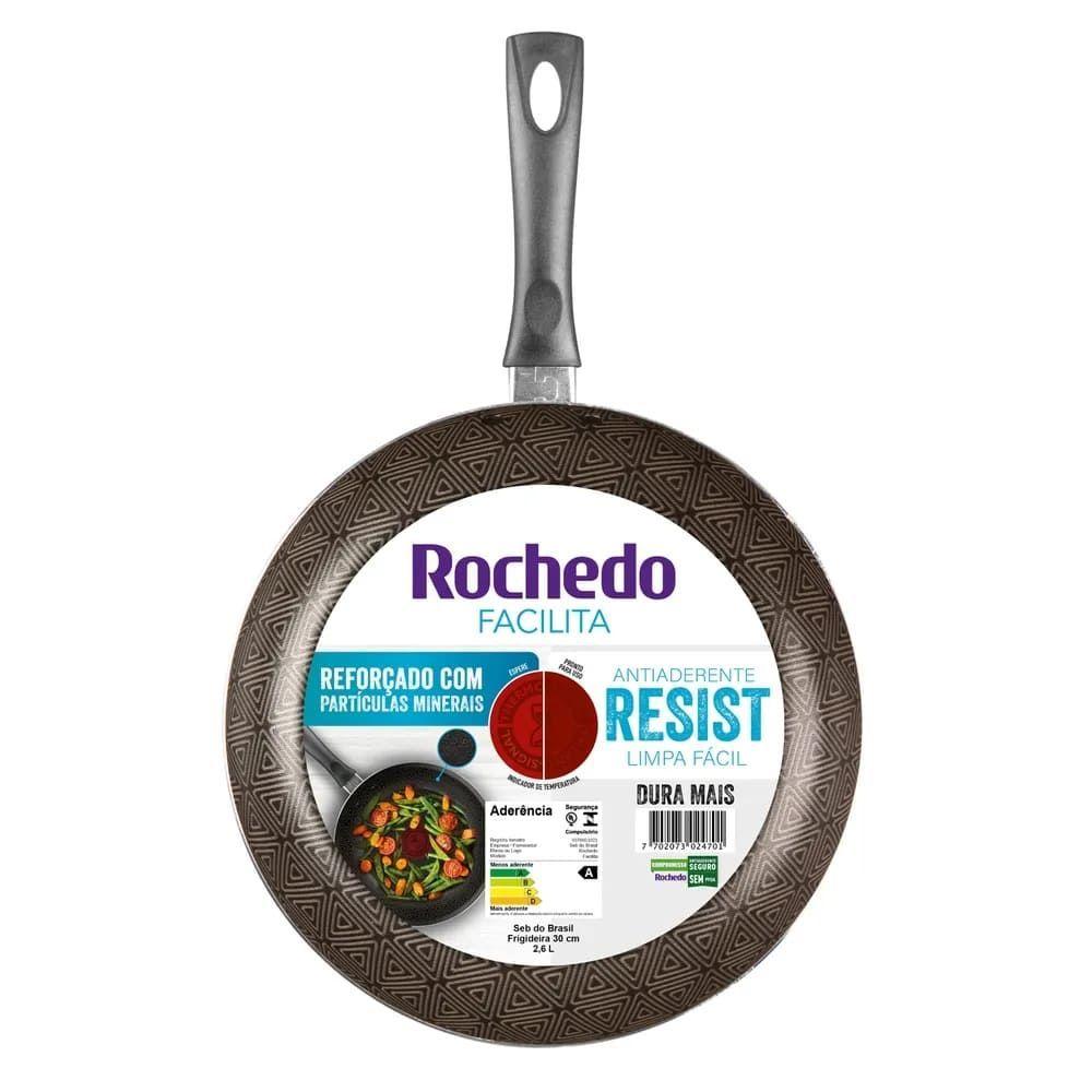 Frigideira Rochedo Facilita 30cm - 5861034141 VermelhoLinha Rochedo Facilita, com antiaderente Resist Limpa f?cil, refor?ado com part?culas minerais: Dura mais. Com a Frigideira Rochedo Facilita Vermelha 30cm, voc? facilita seu dia a dia, com design moderno na cor vermelha, ? o item ideal para sua cozinha. Conhe?a todos os diferenciais dessa linha:Antiaderente Resist: Limpa f?cil e dura mais, refor?ado com part?culas minerais.Thermo-Sinal: Muda de cor indicando o momento ideal para selar o seu alimento.Base Limpa F?cil: N?o mancha, n?o gruda e ? f?cil de limpar.Cabos refor?ados: mais seguran?a e conforto.Al?m de contar com a qualidade da marca Rochedo, presente no Brasil h? mais de 100 anos, a Frigideira Rochedo Facilita Vermelha 30cm ? livre de subst?ncias t?xicas (PFOA), garantindo a seguran?a no uso dos produtos. Pode ser utilizada em fog?o a g?s, vitrocer?mico e el?trico, podendo tamb?m ser levada ? m?quina de lavar lou?as.Diferenciais RochedoConte?do da Embalagem1 Frigideira 30cmRegistro no INMETRO007660/2023Instru??es de CuidadosN?o usar no micro-ondas e freezer. Prefira utens?lios de cozinha n?o met?licos ao manuse?-la. Lave com o lado n?o abrasivo da esponja. Realize a cura inicial para ativar o antiaderente. Pode ir em todos os tipos de fog?es, exceto indu??o.Benef?cio do produto? Antiaderente Resist: Limpa f?cil e dura mais, refor?ado com part?culas minerais.? Thermo-Sinal: Muda de cor indicando o momento ideal para selar o seu alimento.? Base Limpa F?cil: N?o mancha, n?o gruda e ? f?cil de limpar.? Cabos refor?ados: mais seguran?a e conforto.CorVermelhoGarantia3 mesesTipo de MaterialAlum?nioComp. Cabo (cm)16,4cmDi?metro (em cm)30Volume3,3 litrosTipo de Embalagem IndividualAdesivo
