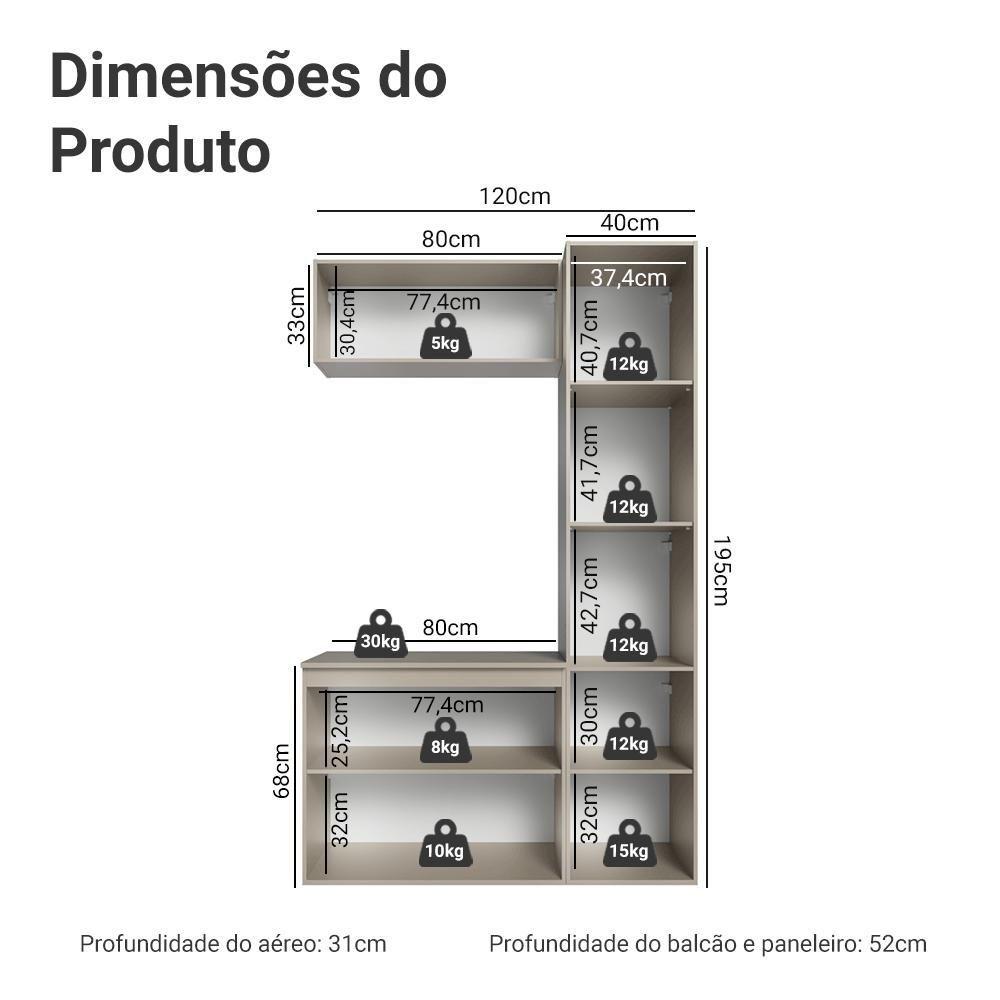 Conjunto Gabinete Suspenso Para Banheiro 120cm 5 Portas Crema Nice Madesa 02 CremaSe o seu banheiro precisa de mais praticidade e um toque moderno, o conjunto Nice da Madesa é a escolha ideal.Formado por um balcão com duas portas, um armário com diversas prateleiras internas, e um aéreo com porta basculante. Cada módulo foi pensado para oferecer excelente aproveitamento de espaço, ajudando a manter o banheiro sempre organizado.O acabamento é no tom crema, uma tonalidade bege clara que transmite leveza. Com visual moderno, ela combina facilmente com diferentes estilos de decoração, criando um ambiente elegante. Outro diferencial está nos puxadores em bronze metalizado, que acrescenta um toque contemporâneo.Produzido com materiais de qualidade, possui dobradiças metálicas nas portas e puxadores em perfil de alumínio, garantindo resistência. A porta basculante possui pistão, que a mantém suspensa enquanto está aberta, oferecendo mais conforto e no uso e o acabamento é de alta resistência, garantindo durabilidade.Medidas totais:- 195cm de altura- 120cm de largura- 31cm de profundidade no aéreo e 52cm no balcão e no armárioO que você recebe:- Um Balcão com duas portas- Um Armário com duas portas- Um Armário aéreo com uma porta basculante- Manual de montagem e ferragensCódigo do produto: MDBA0300027PÉ importante saber:- Material: MDP- Imagens meramente ilustrativas, a decoração não acompanha o produto.- A Madesa não oferece de montagem.- O móvel não acompanha pés, deve ser instalado de forma suspensa, com fixação na parede.A Madesa se dedica à sustentabilidade com várias iniciativas: temos uma usina própria que gera energia para uma das fábricas. Priorizamos fornecedores responsáveis com o meio ambiente. Todo o plástico utilizado na produção é reciclado, e as sobras também são reaproveitadas. Investimos no desenvolvimento de nossos colaboradores e em ações que beneficiem a comunidade. Cor: Crema | Garantia: 3 meses contra de fabricação | Dimensões - Altura: 195 cm | Dimensões - Largura: 120 cm | Dimensões - Profundidade: 52 cm | Produto (produto): Kit Banheiro | Marca: Madesa | Peso aproximado: 66 kg | Material: MDP | Estado de Origem: RS | Conteúdo da embalagem: Kit Banheiro | Material para Filtro: MDP | Instruções/Cuidados: Utilize um pano limpo, levemente umedecido e seque em seguida a superfície. Não usar produtos químicos ou abrasivos para a limpeza. Recomendamos polir seu móvel com lustra-móveis duas a três vezes por ano. | Produto precisa de Montagem?: Sim | Peso Produto Com Embalagem (Kg): 66 | Altura do Produto com Embalagem (cm): 25,8 | Largura Produto Com Embalagem (cm): 53,3 | Comprimento Produto Com Embalagem (cm): 199,8 | Descrição do Tamanho: 195 cm x 120 cm x 52 cm | Nome do Simples no Fornecedor: Conjunto Gabinete Suspenso para Banheiro 120cm 5 Portas Crema Nice Madesa 02 | Fabricante: Madesa | RBN: Casa/Móveis/Móveis para Banheiro/Conjuntos de Móveis para Banheiro | Materiais do corpo: MDP | Quantidade de caixas de embalagem: 3 | Bullet Point 1: Dimensões: 195 cm altura x 120 cm largura x 52 cm profundidade | Bullet Point 2: Os puxadores no tom titanium complementam o design com um toque contemporâneo. | Bullet Point 3: Produzido com materiais de qualidade, possui dobradiças metálicas nas portas e puxadores em perfil de alumínio. | Bullet Point 4: Possui acabamento de alta resistência, conservando a beleza do móvel por muito mais tempo. | É Frágil: Não | Quantidade de itens (number_of_items): 1 | Certificação de teste externa (external_testing_certification): Sim | Precisa de baterias ou pilhas: Não | da peça (part_number): MDBA0300027P | Peso do item (item_weight): value=66;unit=kilograms | Dimensões do item P x L x A (item_depth_width_height): depth#value=52;depth#unit=centimeters;height#value=195;height#unit=centimeters;width#value=120;width#unit=centimeters | Exige montagem (is_assembly_required): Sim | Requer montagem (REQUIRES_ASSEMBLY): Sim | Inclui manual de montagem (INCLUDES_ASSEMBLY_MANUAL): Sim | do modelo (model_number): MDBA0300027P | is_assembly_required: Sim | Inclui pia: Não | Inclui espelhos: Não | Componentes incluídos (included_components): Portas | Cor: Crema