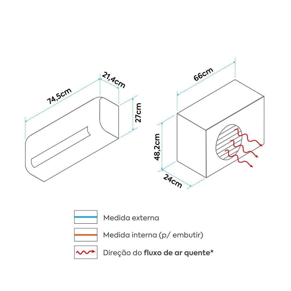 Ar Condicionado Split Hi Wall Inverter R-32 Hisense 9000 BTUs Quente/Frio 220V Monofásico O Hisense Split Hi-Wall Inverter combina tecnologia avançada, eficiência energética e design moderno para proporcionar conforto térmico com economia e praticidade. Com 9.000 BTUs, é ideal para ambientes de até 12 m², oferecendo climatização silenciosa, sustentável e conectada. Principais Diferenciais Tecnologia Inverter Ajuste contínuo da velocidade do compressor. Elimina picos de energia típicos dos modelos convencionais. Mantém a climatização constante. Reduz até 40% o consumo de energia. Prolonga a vida útil do equipamento. Gás Refrigerante Ecológico R32 Até 10 vezes menos prejudicial ao meio ambiente. Contribui para a redução da camada de ozônio. Mais eficiência na troca térmica. Conectividade Wi-Fi Controle total via smartphone. Ajuste remoto de temperatura. Monitoramento do consumo de energia em tempo real. Silencioso e Discreto Níveis de ruído reduzidos, ideal para dormitórios e escritórios. Design compacto e moderno que se integra ao ambiente. Eficiência Energética – Selo Procel A Máxima eficiência energética. Economia no longo prazo com desempenho superior. Sistema de Filtro Avançado Remove poeira, alérgenos e micro-organismos. Garante ar mais puro e saudável. Variedade de Capacidades da Linha 9.000 BTUs: Quartos e salas de até 12 m². 12.000 BTUs: Ambientes de médio porte, como salas de estar e pequenos escritórios. 18.000 a 36.000 BTUs: Áreas maiores, como lojas e salas comerciais. Especificações Técnicas Capacidade: 9.000 BTUs Ciclo: Quente/Frio Voltagem: 220V Fase: Monofásico Tecnologia do compressor: Inverter Classificação energética (INMETRO): A Consumo de energia: 396 kWh/ano Temperatura mínima/máxima: 16 ~ 30 ºC Acionamento após queda de energia: Manual Condensadora Tipo: Horizontal Cor: Branca Material: Metal Alimentação de energia: Condensadora Material da serpentina: Cobre Potência de aquecimento: 1000 W Potência de refrigeração: 2638 W Capacidade (mín., nominal, máx.): 9000 / 9000 / 9000 Diâmetro da linha (sucção): 3/8 pol Diâmetro da linha (líquido): 1/4 pol Altura: 48,2 cm Código modelo condensadora: AS-09UW2RLD00C Código EAN: 7898753560505 NCM: 8415.10.11 Evaporadora Capacidade: 9.000 BTUs Ciclo: Quente/Frio Voltagem: 220V Fase: Monofásico Cor: Branca Controle de ar (cima/baixo): Automático Controle de ar (direita/esquerda): Automático Largura: 74,5 cm Profundidade: 21,4 cm Diâmetro da linha (sucção): 3/8 pol Diâmetro da linha (líquido): 1/4 pol Código modelo evaporadora: AS-09UW2LDTT00E Código EAN: 789875356051 Garantia Garantia legal: 90 dias (Hisense). Garantia estendida: 9 meses (total 12 meses) contra defeitos de fabricação, desde que instalado conforme o manual e com manutenções preventivas anuais realizadas por assistência autorizada. Garantia estendida do compressor/motor Inverter: 10 anos, válida somente com manutenções preventivas realizadas por técnicos credenciados. Atenção: a garantia perde a validade se o aparelho for instalado ou utilizado em desacordo com o manual. Certificações Selo Procel A – máxima eficiência energética. Selo Inmetro – atendimento a rigorosos padrões de qualidade. Código ANATEL: 04069-23-05520 Importante: Fique atento à capacidade do produto. Calcule a metragem do ambiente para escolher a potência ideal.