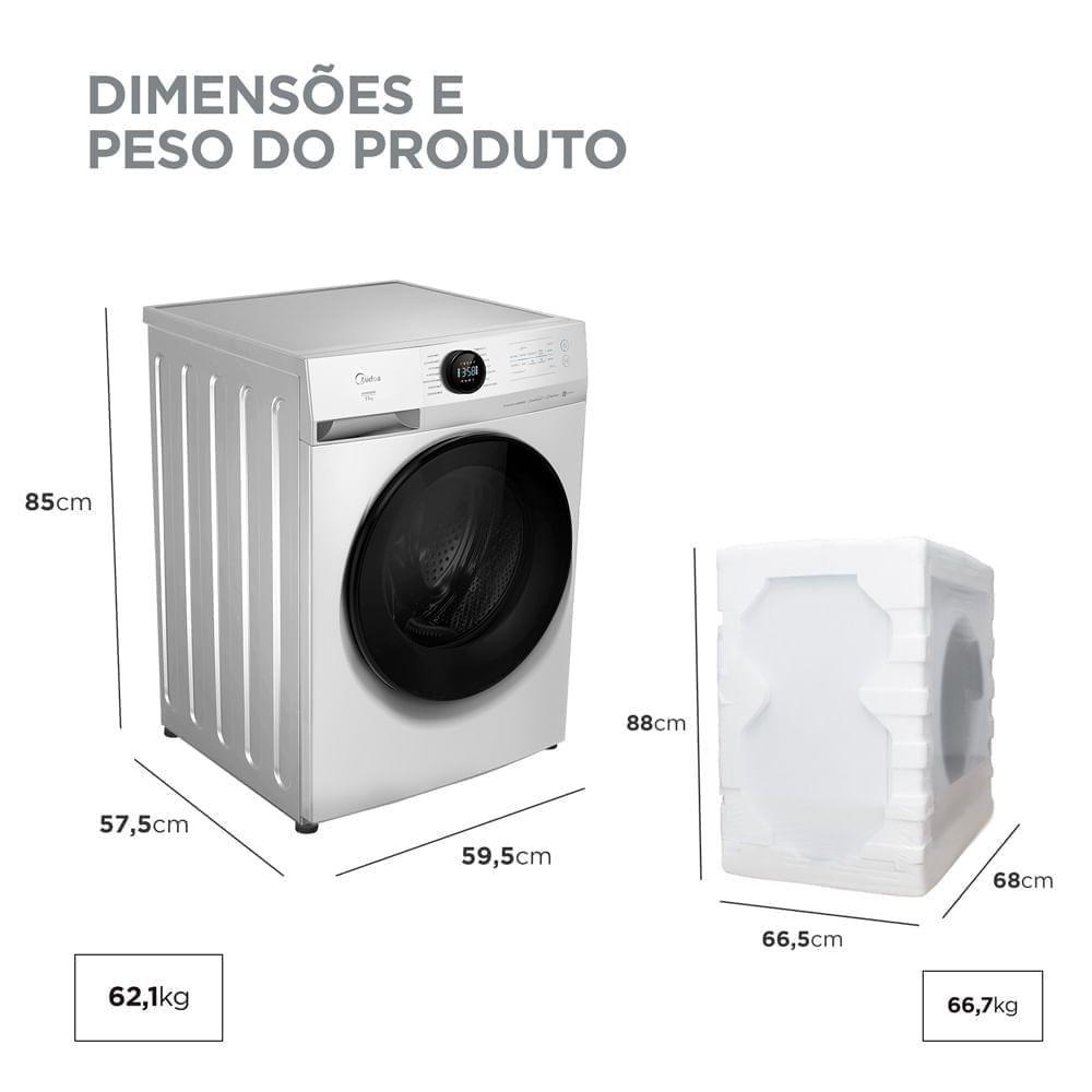 Máquina de Lavar Roupas 11kg Branca Slim HealthGuard Conectada Midea MF201W110WB/WK-01 - 110VMáquina de lavar roupas com capacidade de 11 kg, design compacto e moderno Slim, que otimiza espaço sem comprometer a eficiência. Conta com tecnologia HealthGuard para limpeza e esterilização profunda, além da Função Turbo para acelerar o ciclo de lavagem. Equipamento conectado, permite controle via aplicativo SmartHome e comando de voz (Alexa e Google Home). Função Especialista recomenda o programa ideal conforme tipo de roupa e nível de sujeira.Principais Características:- Design: Slim (profundidade reduzida que otimiza espaço)- Conectividade: Wi-Fi, controle via app Midea SmartHome e comandos por Alexa e Google Home- Função Especialista: Recomenda lavagem ideal para cada tipo de roupa- Tecnologias Exclusivas: HealthGuard (limpeza e esterilização profundas), Função Turbo (ciclo mais rápido)- Programas: 14 programas, incluindo Favorito, Algodão, Mix, Sintético, Esterilizar, Secar, Rápido, ECO, Delicado, Edredom e Limpeza do tambor- Funções: 10 funções, como Turbo, Vapor, Secar, Tira Mancha e Adiar Início- Painel: Touch + Knob Lunar Dial com display LED azul e branco, botão lunar indicativo- Controle de ciclo: Monitoramento dos estágios com aviso de erroObservação: Somente faturamos para o nosso consumidor final, ou seja, não faturamos pedidos para CNPJ por este portal de vendas.Especificações Técnicas:Voltagem: 110VPotência: 1250W Capacidade: 11 kgAltura: 85 cmLargura: 59,5 cmProfundidade: 57,5 cmPeso: 61,5 kgAltura embalado: 88 cmLargura embalado: 68 cmProfundidade embalado: 66,5 cmPeso embalado: 66,7 kgÁgua fria: 0,27 kWh/cicloÁgua quente: 1,64 kWh/cicloConsumo de água: 80-81 L/cicloVelocidade de centrifugação: 0 a 1200 RPMTemperaturas: Fria, 20°C, 30°C, 40°C, 50°C, 60°C Nível de ruído: 79 dB(A)Tipo de tomada: 10 A, 60 HzTipo de água: FriaFiltro: SimDispenser: Sabão e amaciantePés ajustáveis: SimTrava no painel: EletrônicoTimer: Sim, até 24hMaterial do cesto: Aço inoxTipo de carga: FrontalMotor: BLDC (inverter)Eficiência energética: Classificação A, selo ProcelAbertura da porta: Frontal (porta preta, cabine branca, interior inox)Itens inclusos: Máquina de lavar, mangueira de entrada, tampões de fechamento, suporte para mangueira de saída, protetor para rato e manual do usuárioGarantia: 24 meses