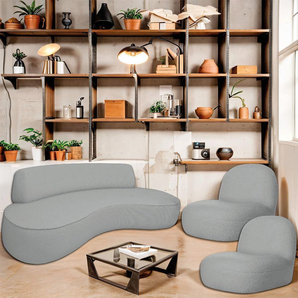 Sofá Curvo 130cm 2l E 2 Poltronas Orgânico Recepção Sala Amsterdã Bouclé Adj Decor Cinza