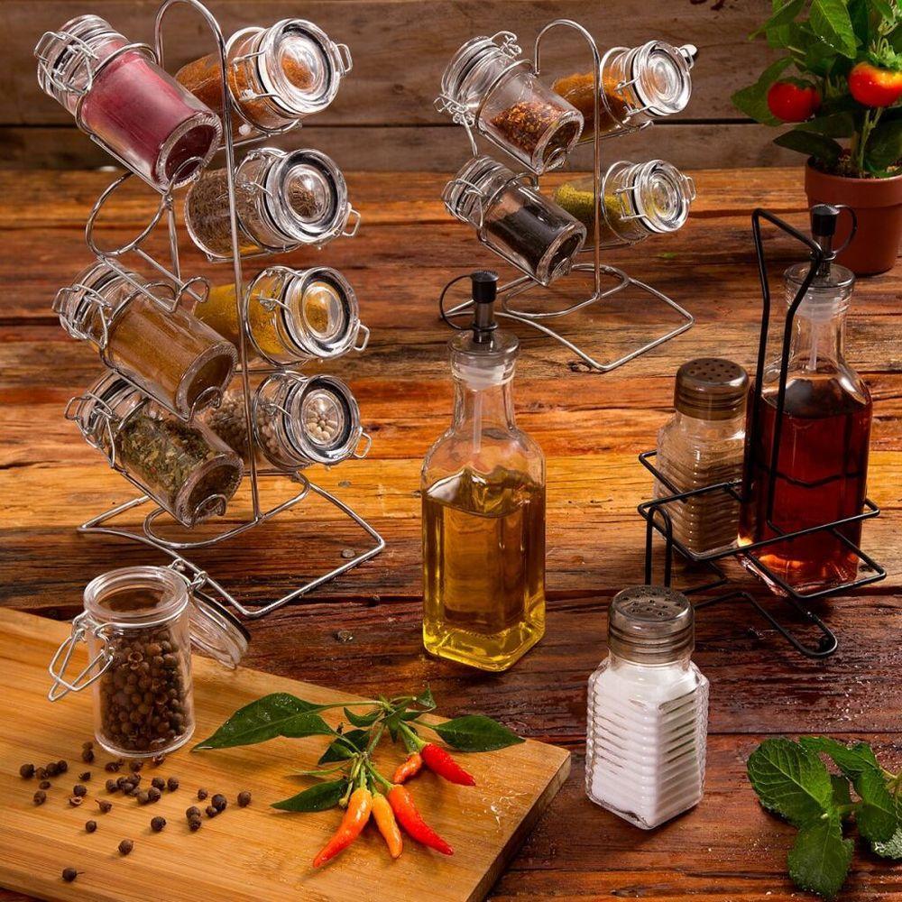 Porta Temperos 8 Peças De Vidro Com Tampa Hermética E Suporte De Metal Cromado Lyor