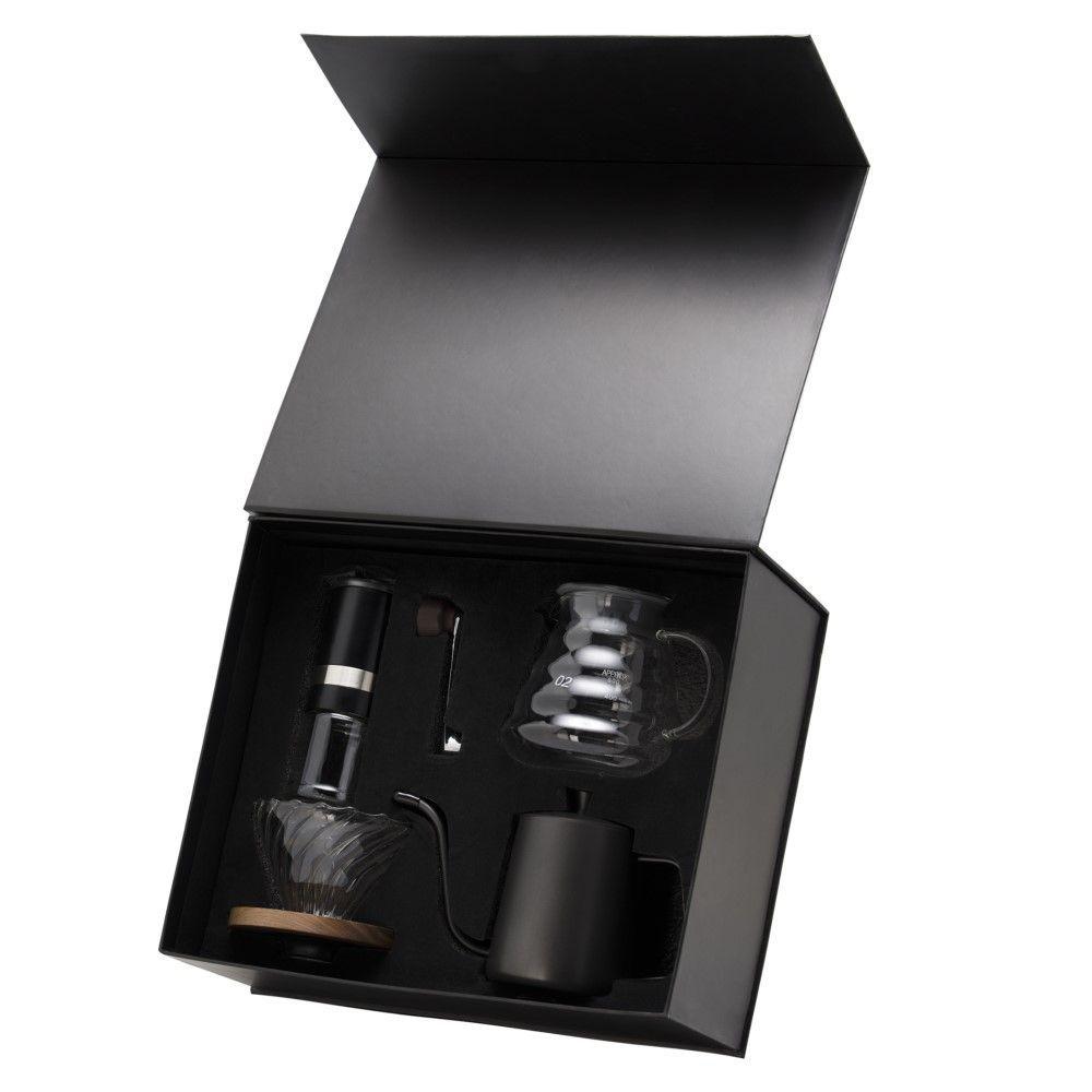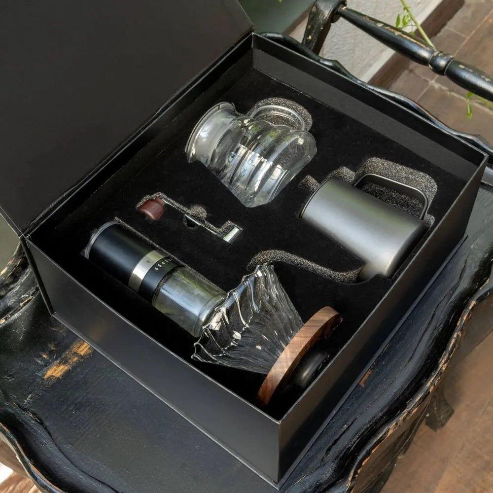Jogo De Café Gourmet 4 Peças OxfordJogo de Café Gourmet 4 peças Oxford Para quem ama o ritual de preparar um café, apresentamos um conjunto Gourmet feito para te acompanhar em cada etapa do preparo dessa bebida tão especial. Desde o moer dos grãos de café até o servir em uma jarra em vidro borosilicato, extremamente resistente à altas temperaturas. Além desses dois itens, completam o conjunto suporte para filtro Hario em vidro e chaleira de aço inox com bico de ganso para adicionar a água ao filtro com precisão. O conjunto acompanha embalagem especial em box preto com apoio para cada peça. Perfeito para presentear os “Coffee Lovers”.Jogo de Café Gourmet 4 peças Oxford - Itens Inclusos1 Jarro de Vidro para Filtro de Café1 Chaleira de Aço Inox Bico de Ganso1 Suporte de Vidro com Base de Madeira para Filtro de Café1 Moedor Manual de Grãos de Café