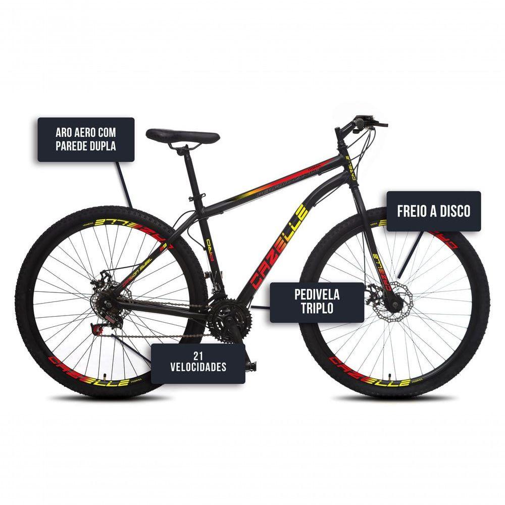 Bicicleta Cazelle Roma A.29 Tam 18 Aco Carbono F.disco 21v -quadro Preto C/ AdesivoAbraçadeira de Canote- Abraçadeira com blocagem (31.8mm)Canote do Selim- Canote do selim 27.2Caixa de Direção- Guarda pó mov. direção 22mmRoda- Aro 29, aro 36 furos, freio a discoCorrente- Corrente fina 1/2x3/32Freio (Cabo)- Cabo de freio para bicicleta freio a disco 1.5 x 1900mmFreio (Conduíte)- Conduíte encapado freioFreio (Kit)- Kit freio a disco pinça/discoMovimento Central- Eixo centro ponta quadrada 5U com porca- Movimento central 34.7mm com colarGuidão- Guidão downhill aço expandido 580mm- Espaçador do guidão de ferro 30mmMaçanetas- Maçaneta de alumínio 26Câmera de Ar- Câmera de ar aro 29- Fita para aro 29Câmbio Dianteiro- Câmbio dianteiro 31.8, puxa por cima (para 42 dentes)Câmbio Traseiro- Câmbio traseiro com gancheiraSuspensão- Garfo 29 Colli, freio a discoAlavancas- Grip-Shift com cabo 21 trocadorCaixa de Direção (comum)- Movimento direção comum com colarPedal- Pedal Stone 9/16 pretoPedivela- Pedivela triplo aço (24/34/42)Dimensões:Altura: 112 cmLargura: 73 cmProfundidade: 188 cmPeso: 17 kgObservações:- Todos os produtos têm três (03) meses de garantia fornecida pelo fornecedor- As imagens são meramente ilustrativas, os objetos que ambientam as fotos não acompanham o produto.- Pode haver alguma diferença de tonalidade entre a foto e o produto, devido ao tratamento de imagens e a calibração do monitor- A entrega é realizada por transportadora, não nos responsabilizamos, no ato da entrega por desmontagens, subir escadas/elevadores ou transporte por guincho para apartamentos- Eventuais despesas são de responsabilidade do cliente- Confira as dimensões dos volumes e certifique-se de que passará normalmente por supostos elevadores, portas, escadas ou corredores- Ao receber a mercadoria, verifique as condições da embalagem, caso haja alguma avaria, entre em contato com nosso SAC- Nossa empresa não se responsabiliza pela montagem dos produtos, mas todos os produtos possuem manual de montagem. Recomendamos que a montagem seja feita por profissional de sua confiança.