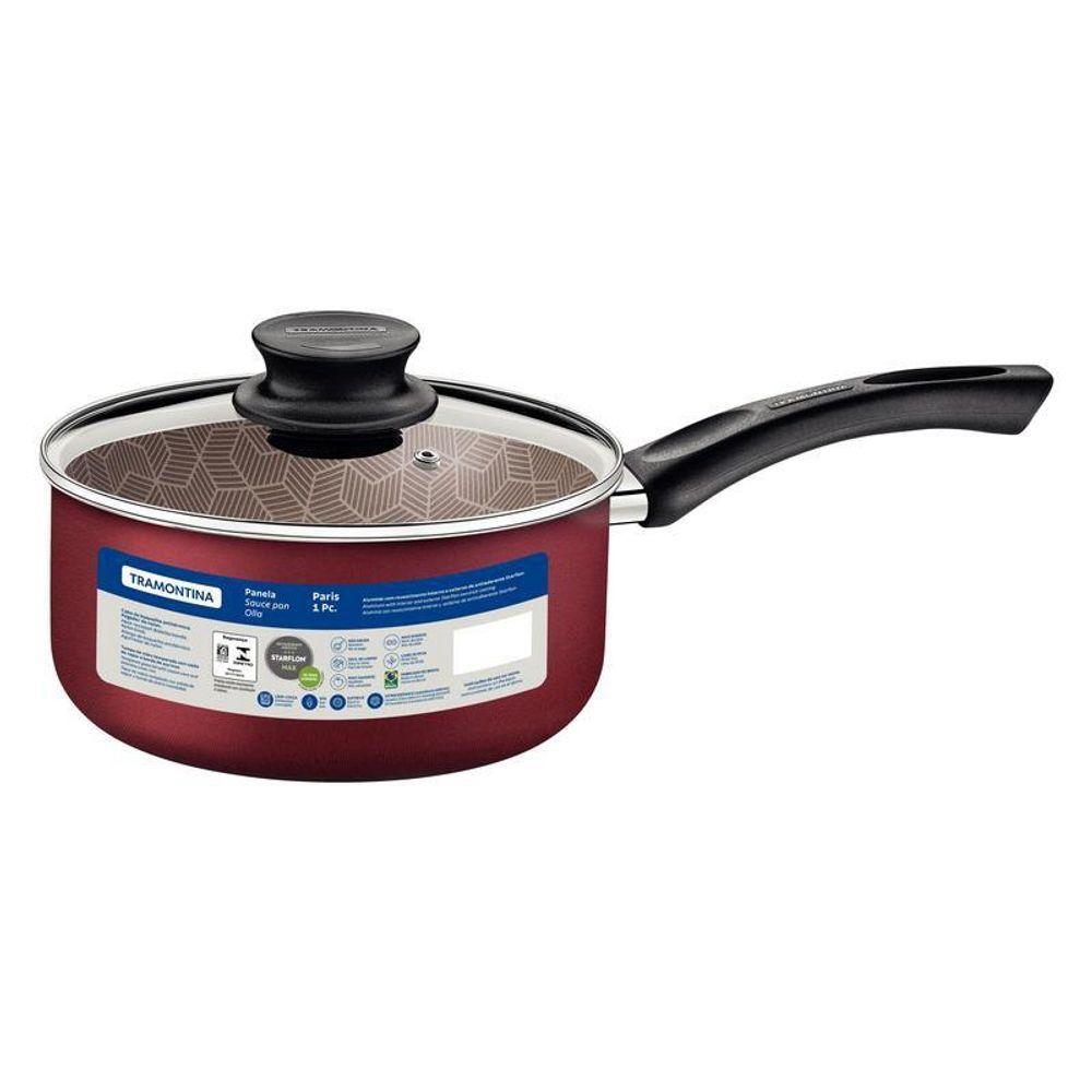 Panela 22 Cm Paris Vermelha TramontinaPanela Tramontina Paris em Alumínio com Revestimento Interno e Externo em Antiaderente Starflon Max Vermelho com Tampa de Vidro 22 cm 3,8 LA panela Tramontina Paris em alumínio com revestimento interno e externo em antiaderente Starflon Max vermelho com tampa de vidro 22 centímetros 3,8 litros vai te ajudar a preparar suas receitas com muito mais praticidade. É produzida em alumínio com espessura de 1,8 milímetros e revestimento interno e externo em antiaderente Starflon Max, atributos que juntos, proporcionam um cozimento rápido e uniforme dos alimentos, evitam que eles grudem em sua superfície e a tornam muito mais fácil de limpar. Para sua segurança, o cabo e o pegador da tampa de vidro são em materiais antitérmicos e não aquecem. Além de todas essas características, ela é uma panela de excelente durabilidade e que pode ser levada à máquina de lavar louças. Escolha Tramontina e tenha prazer em preparar suas melhores receitas!Informações Gerais:Corpo de alumínio com espessura de 1,8 mm que proporciona cozimento rápido e uniforme.Revestimento interno e externo de antiaderente Starflon Max que não gruda, é fácil de limpar, mais durável e não é prejudicial à saúde, pois é livre de PFOA.Tampa de vidro temperado, com saída de vapor e borda de aço inox.Cabo de baquelite antitérmico e pegador de nylon que oferecem segurança durante o manuseio.Pode ir à máquina de lavar louças facilitando seu dia a dia.Uso seguro e adequado:A capacidade volumétrica máxima para cozimento é de 3/4 da capacidade total da peça.Posicione o cabo do utensílio voltado ao centro do fogão.Em fogões com grade, centralize a peça sobre a chama ou fonte de calor e alinhe o cabo com a grade.Utensílios quentes devem estar fora do alcance das crianças.Antes do primeiro uso, lave com esponja macia, sabão neutro ou detergente líquido.Depois de secar, unte a área interna com óleo ou gordura e leve ao fogo por um ou dois minutos. Deixe esfriar e lave novamente.Seu utensílio Starflon está pronto para uso com ou sem gordura, sempre em fogo baixo ou médio (nunca superior a 260 °C).Para mexer os alimentos use somente utensílios de silicone, nylon ou madeira. Com o uso, o cabo e o pegador podem afrouxar devido à dilatação normal dos materiais. Reaperte apenas o suficiente, sem forçar.Limpeza: Evite a imersão do utensílio quente em água fria.Nunca utilize produtos abrasivos na lavagem.Se deixar queimar alimentos, umedeça a área e reserve até que possa remover os resíduos grudados com esponja e sabão.Para descarte do produto e embalagem siga as orientações de reciclagem vigentes.Garantia: 90 dias para vícios ou defeitos de fabricação.