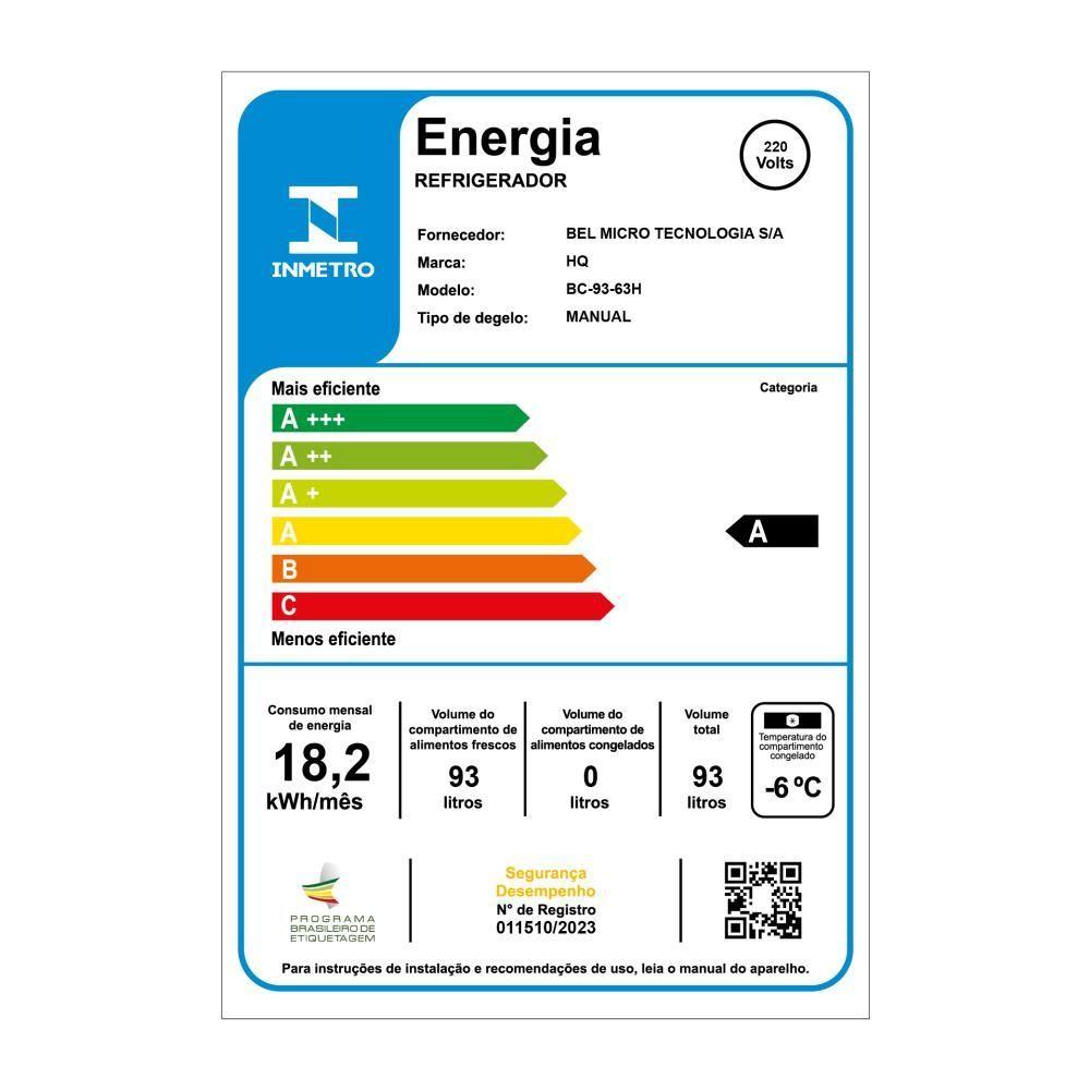 Frigobar Geladeira HQ 93 Litros Preto BC-93 110VFrigobar Geladeira HQ 93 Litros Preto BC-93Frigobar HQ Compacto, Funcional e Eficiente para Todos os AmbientesSeja para equipar o seu quarto, escritório, hotel, consultório ou qualquer ambiente que mereça mais praticidade, a linha de frigobares HQ entrega o essencial com o máximo de qualidade. Disponíveis em três tamanhos 47L, 70L e 93L nossos modelos foram desenvolvidos para atender diferentes perfis de uso com o mesmo padrão de excelência: design funcional, operação silenciosa, gás ecológico e controle de temperatura ajustável.Elegantes por fora e surpreendentemente versáteis por dentro, eles garantem organização, economia e eficiência energética com ótimo custo-benefício. Conheça os diferenciais e escolha o ideal para você.- Capacidade ideal para armazenar bebidas, lanche e refeições rápidas.- Funcionamento silencioso (= 42 dB): mais conforto em qualquer ambiente.- Controle manual com até 7 níveis de temperatura, de 0 °C a 8 °C.- Porta reversível: mais liberdade para adaptar à posição do espaço.- Prateleiras internas removíveis: otimize o espaço como quiser.- Gás refrigerante ecológico R600a: menor impacto ambiental e mais eficiência.Especificações Técnica:Marca: HQCor: PretoModelo: BC-93Capacidade Total: 93LVoltagem: 127V ou 220V (Não é Bivolt)Corrente elétrica: 0,8A (127V) | 0,5A (220V)Frequência (Hz): 60Tipo de Degelo: ManualPrateleiras removíveis: SimMaterial da prateleira: VidroConsumo(kWh/mês): 18,2Iluminação: NãoPorta reservível: SimAjuste de temperatura: MecânicoNíveis de ajuste de temperatura: 7Porta garrafa: Simbandeja de ovos: NãoGás refrigerante: R600a (21g)Classificação energética: AFaixa de temperatura: (0 a 8°C)Sistema de refrigeração: ÚnicoRuído: 42dBInterior: Prateleiras em vidro, compartimentos para latas e garrafas.Dimensões e Peso do ProdutoAltura:84,3 cmLargura: 44,4 cmProfundidade:48,5 cmPeso:19,5 kgGarantia01 Ano (Sendo 3 meses de garantia legal e mais 9 meses de garantia para defeito de fabricação).Indicado para: famílias, escritórios maiores, hotéis e clínicas.