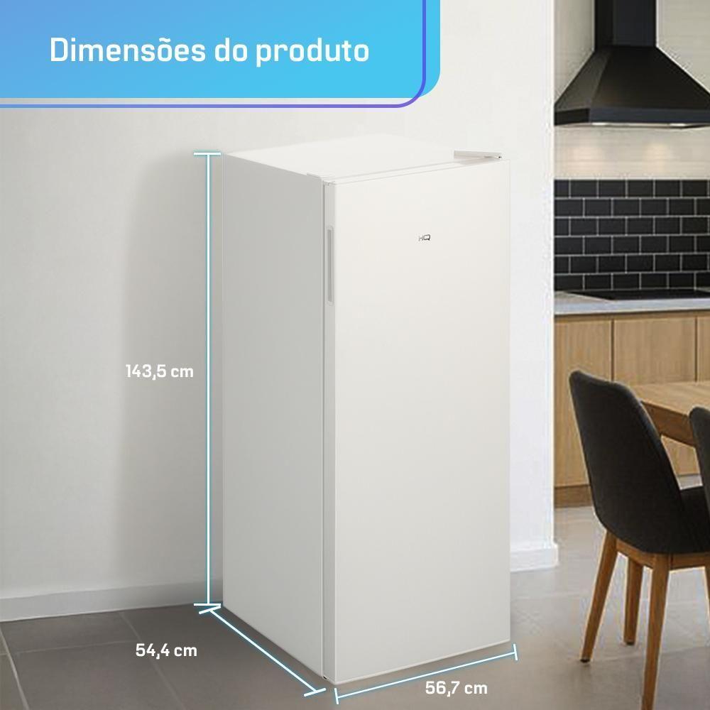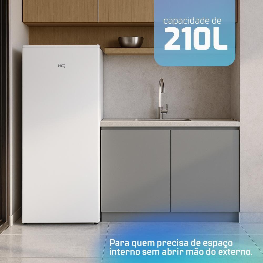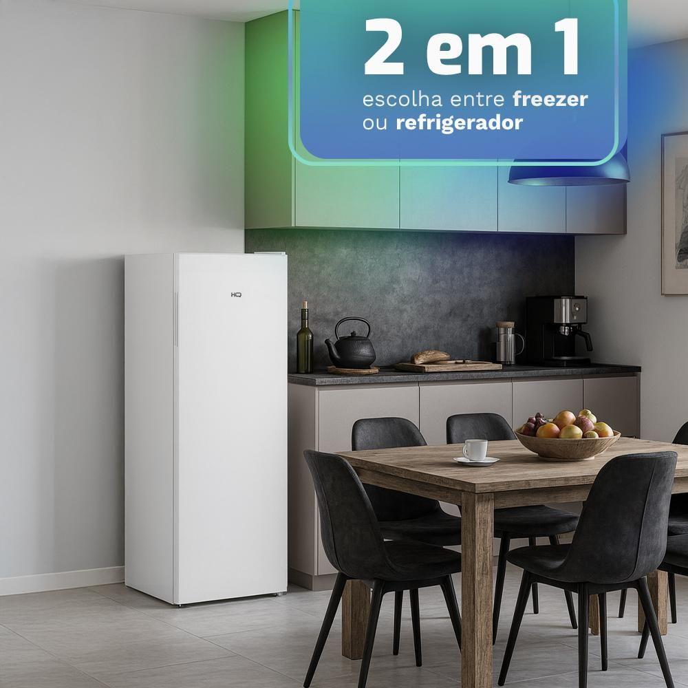 Freezer e Conservador Vertical HQ 210 Litros Branco HQ-210FV/RDFX - 220VO Freezer e Conservador Vertical HQ-210FV/RDFX na cor branca é a solução 2 em 1 perfeita para quem busca flexibilidade e alta capacidade. Com 210 litros de espaço útil, ele se adapta às suas necessidades, funcionando como freezer para estocagem a longo prazo ou como refrigerador para o dia a dia. A função Fast Freezer garante resfriamento rápido após as compras, e sua classificação energética A+++ assegura baixo consumo de energia. É a escolha ideal para famílias, casais e pequenos comércios que precisam de praticidade e eficiência.Principais Características e Benefícios:Função 2 em 1: Alterne facilmente entre freezer (até –18 °C) e refrigerador (0–10 °C) conforme sua necessidade.Alta Eficiência Energética: Classificação A+++, com um consumo de apenas 21,41 kWh/mês, garantindo mais economia.Função Fast Freezer: Acelera o congelamento para preservar a qualidade dos alimentos recém-adicionados.Capacidade de 210 Litros: Amplo espaço interno para organizar alimentos, bebidas e congelados.Organização Inteligente: Conta com prateleiras de vidro (fixa e ajustáveis), meia prateleira e uma gaveta, facilitando a visualização e o acesso aos itens.Controle Simples: Seletor de temperatura mecânico para uma operação fácil e intuitiva. Certificada: Produto com registro INMETRO (002597/2025).Design Versátil: O acabamento na cor branca combina facilmente com cozinhas, copas, áreas de ou pequenos comércios.Ecológico: Utiliza gás refrigerante R600a e isolamento em ciclopentano, com menor impacto ambiental.Especificações Técnicas:Marca: HQModelo: HQ-210FV/RDFXProduto: Freezer e Conservador VerticalCor: BrancoCapacidade Total: 210 LitrosTensão: 220VFrequência: 60 HzEficiência Energética: A+++Consumo (kWh/mês): 21,41Tipo de Degelo: ManualControle de Temperatura: MecânicoFaixa de Temperatura (Modo Freezer): –18 °CFaixa de Temperatura (Modo Refrigerador): 0 °C a 10 °CGás Refrigerante: R600aIsolamento: CiclopentanoCesto Removível: NãoRegistro INMETRO: 002597/2025Altura: 143,5 cmLargura: 56,7 cmProfundidade: 54,4 cmPeso: 47 kgOrientações de Instalação e Uso:Instalação: Produto freestanding (de piso), não deve ser embutido. É necessário deixar um espaço livre de 12,7 cm nas laterais, topo e fundo para garantir a ventilação. Elétrica: Conecte em uma tomada exclusiva e aterrada. Não utilize extensões, benjamins ou adaptadores.Antes de Ligar: Após o , mantenha o produto em pé por algumas horas antes de conectá-lo à energia.Degelo: Realize o degelo manual periodicamente, a cada 1 a 3 meses ou quando a camada de gelo atingir de 3 a 5 mm de espessura.Itens Inclusos na Embalagem:1 Freezer e Conservador Vertical HQ-210FV/RDFX1 Manual de InstruçõesGarantia: 01 Ano (sendo 3 meses de garantia legal e mais 9 meses de garantia de para de fabricação).
