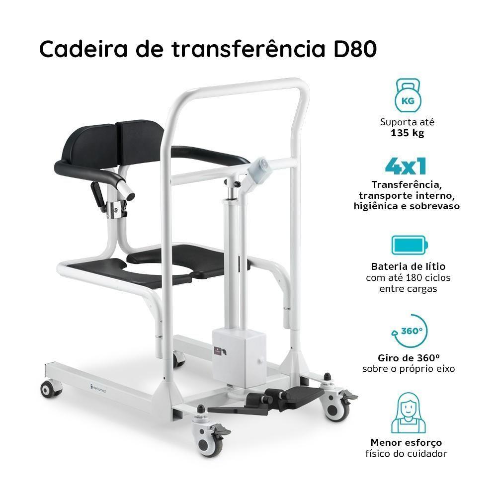 Cadeira De Transferência Dellamed Multiuso Com Elevação Eletrônica Até 135 Kg Assento 48,5cm Branco E Preto D80Cadeira de Transferência Dellamed Multiuso com Elevação Eletrônica até 135 Kg Assento 48,5cm Branco e Preto D80A Cadeira de Transferência D80 Dellamed é uma solução versátil e resistente, especialmente projetada para atender às necessidades de pessoas com mobilidade reduzida. Com capacidade para suportar até 135 kg, esta cadeira apresenta um sistema de elevação eletrônica que facilita a transferência do usuário entre diferentes locais.Além disso, ela é um verdadeiro 3 em 1, desempenhando as funções de cadeira de transferência, cadeira de transporte interno e sobre vaso, oferecendo praticidade e conforto em diversas situações. Equipada com rodas com trava, proporciona segurança e estabilidade durante o uso, especialmente para acamados e cadeirantes.Este modelo de cadeira eletrônica conta com a classificação IP44, garantindo proteção contra respingos de água e assegurando durabilidade e segurança em ambientes úmidos.- Capacidade: Suporta até 135 kg.- Montagem rápida e de fácil transporte.- Conta com sistema elétrico que levanta e abaixa a cadeira facilitando a rotina do cuidador.- Giro de 360º sobre o próprio eixo - maior acesso em locais pequenos.- 3 em 1 : Cadeira de Transferência, transporte interno e sobre vaso.- Menor esforço físico do cuidador.- Bateria de lítio com recarregável.- Conta com a IP44, que é uma proteção contra respingos de água.- O equipamento pode ser utilizado em ambientes pequenos.- Montagem rápida.- Menos esforço físico do cuidador.- Encosto para uso opcional.Especificações TécnicasMarca: DellamedModelo:D80Cor:Branco e PretoCapacidade: Até 135KgComposição: Aço carbono, pintura epóxi, espuma rígida de poliuretanoCor: Estrutura branca, assento e encosto em pretoRodas e travas nas rodas traseiras: SimDimensões e Peso do ProdutoAltura: 130 cmLargura: 54 cmProfundidade: 81 cmPeso: 26 kgGarantia01 Ano para estrutura (Sendo 3 meses de garantia legal e mais 9 meses de garantia para defeito de fabricação).3 meses de garantia legal para demais componentes.Marca: Dellamed | Modelo: D80 | Cor: Branco e Preto | Capacidade: 135Kg | Rodas e travas nas rodas traseiras: Sim | Encosto: Uso opcional | Bateria de lítio com recarregável: Sim | 3 em 1: Cadeira de Transferência, transporte interno e sobre vaso | Sistema elétrico que levanta e abaixa a cadeira: Sim | Giro de 360º sobre o próprio eixo: Sim | Bateria recarregável: Sim | Proteção IP44: Sim | Pintura: Epóxi | Código de Registro Sanitário (ANVISA): 80795950038