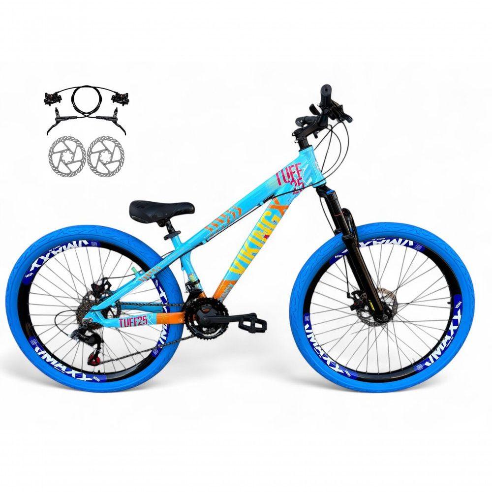 Bicicleta Aro 26 Vikingx Tuff X25 Freeride Freio Hidráulico 21v Aros Vmaxx Dh Pneu Flame - Azul/laranjaBike aro 26, VIKINGX TUFF, nova na caixa a pronta entrega, produto com ótima qualidade e acabamento, possui 21 marchas com sistema de alavancas rapid fire que a cada clique uma marcha é trocada, sistema de freio a disco hidraulico, pneus flame. Bicicleta pré montada, vai precisar apenas fixar a roda dianteira, guidão, selim e pedais.Segue abaixo características da bike: ; ; ;Quadro 26 VikingX Tuff em AlumínioGarfo 29 suspensão ;Suporte do guidão em alumínio pretoGuidão 31.8mm em alumínio pretoCanote do selim 27.2 em alumínio preto Sem carrinhoSelim Freeride PretoAbraçadeira do Selim alumínio PretoAros Vmaxx DH Super reforçadosRaios PretosCubos Pretos ;Pneus 26 FlameMovimento central selado rolamentadoFreios a disco hidraulico com discos inox 160mmAlavancas Semi-automáticas Rapid FireCâmbio Traseiro Importado IndexCâmbio Dianteiro Importado IndexCorrente IndexPedivela Aço RevestidoPedal Plataforma Nylon pretoRoda Livre 7v index dourada(rosca)