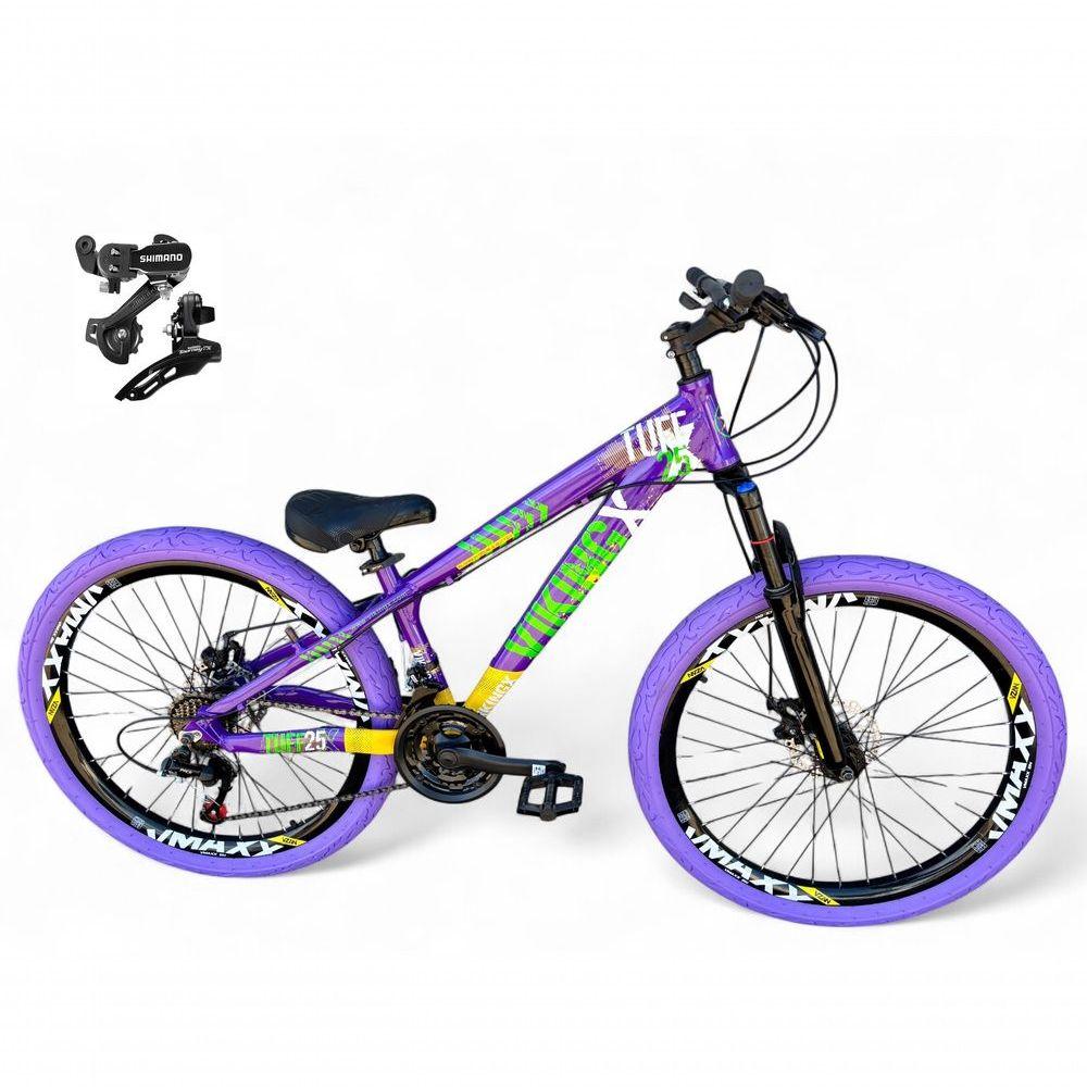 Bicicleta Aro 26 Vikingx Tuff X25 Freeride Câmbios Shimano 21v Freio A Disco Aros Vmaxx Pneu Flame - Roxo/amarelo/verdeBike aro 26, VIKINGX TUFF, nova na caixa a pronta entrega, produto com ótima qualidade e acabamento, possui 21 marchas com sistema de alavancas rapid fire que a cada clique uma marcha é trocada, câmbios Shimano, sistema de freio a disco mecânico, pneus flame. Bicicleta pré montada, vai precisar apenas fixar a roda dianteira, guidão, selim e pedais.Segue abaixo características da bike: ;Quadro 26 VikingX Tuff em AlumínioGarfo 29 suspensão ;Suporte do guidão em alumínio pretoGuidão 31.8mm em alumínio pretoCanote do selim 27.2 em alumínio preto Sem carrinhoSelim Freeride PretoAbraçadeira do Selim alumínio PretoAros Vmaxx DH Super reforçadosRaios PretosCubos Pretos ;Pneus 26 FlameMovimento central selado rolamentadoFreios a disco Mecânicos com discos inox 160mmAlavancas Semi-automáticas Rapid FireCâmbio Traseiro Shimano TZCâmbio Dianteiro Shimano TZCorrente IndexPedivela Aço RevestidoPedal Plataforma Nylon pretoRoda Livre 7v index dourada(rosca)