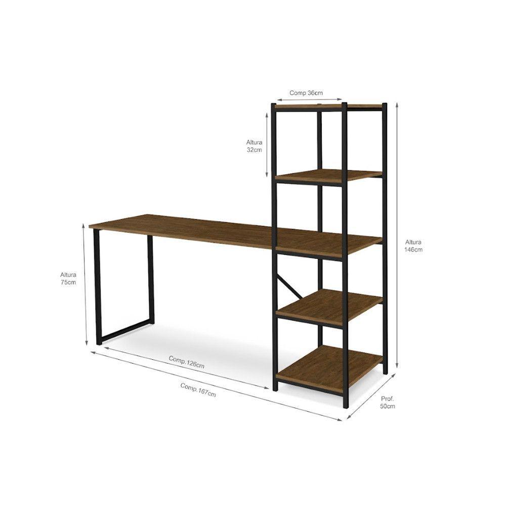 Escrivaninha Com Estante 4 Prateleiras Klm Móveis Amadeirado Com PretoEscrivaninha para estudo e escritório com prateleiras estilo industrial decorativo, ideal para qualquer ambiente, deixando o espaço mais moderno e prático. Produto em aço carbono com pintura em pó e tampos em MDP com pintura UV.Dimensões:Altura:146 cmLargura: 167 cmProfundidade: 50,00 cmPeso: 20 KgGarantia do Fornecedor 3 Meses.Cor: Amadeirado com Preto