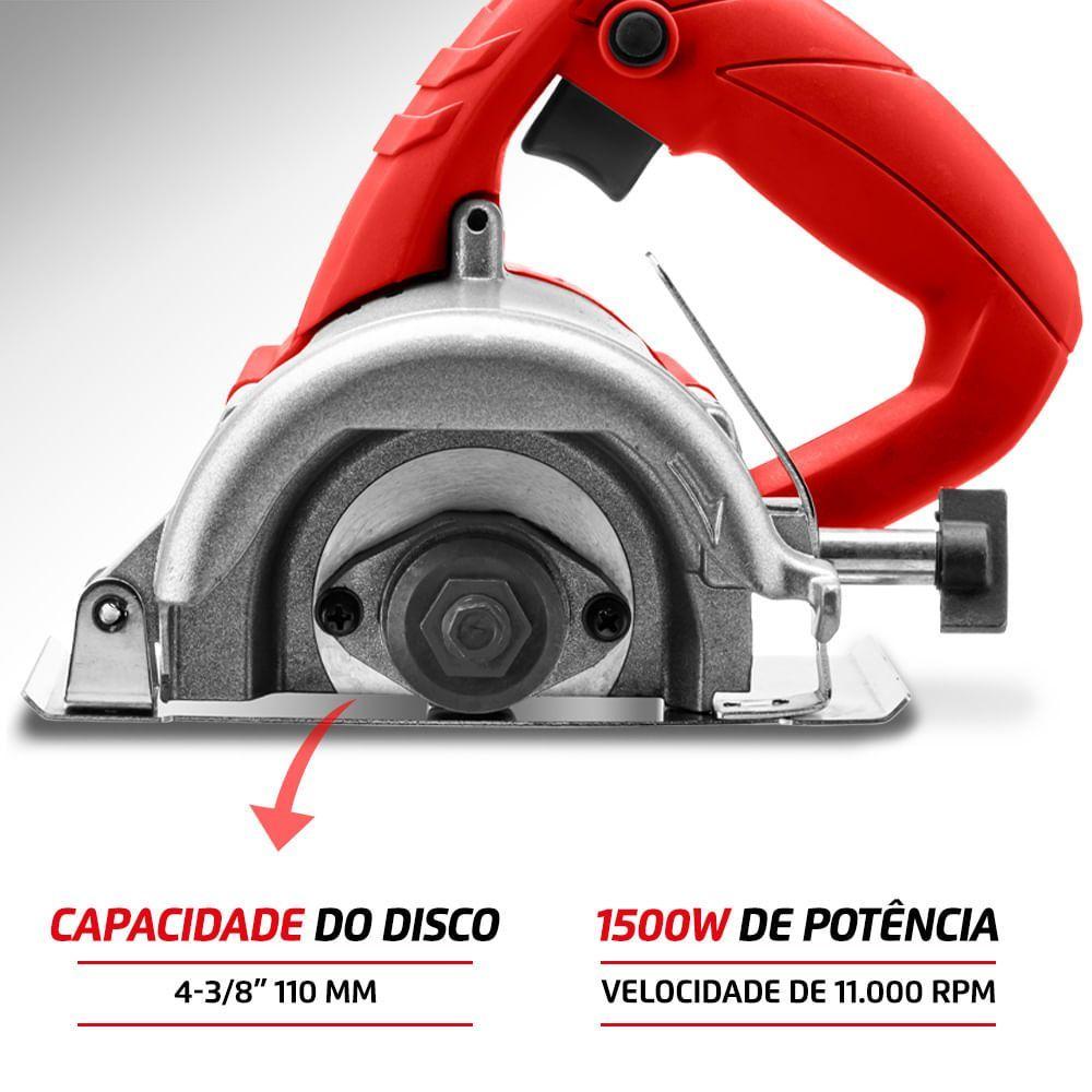 Serra Mármore Mondial Power Tools Fsm-03 Serra Mármore-127v-vermelhoCom 1.500W de potência, velocidade de 11.000 RPM e capacidade de disco de 4-3/8 (110 mm), a Serra Mármore FSM-03 vermelha tem ajuste de profundidade, base inox, interruptor com trava e capa antipoeira e é ergonômica. Seu motor tem 1.500W. Toda essa potência se une à velocidade de 11.000 RPM, para trabalhos rápidos e eficientes. Sua capacidade de disco é de 4-3/8 (110 mm). Ela é ajustável, tendo ajuste rápido de profundidade de corte, o que facilita e agiliza na hora de definir a altura do disco. Sua base é de aço inox (inoxidável), que não enferruja e protege o material a ser cortado. Seu interruptor tem trava, para você não ter que ficar apertando, o que dá mais autonomia em trabalhos mais longos. O interruptor também tem uma capa antipoeira, o que aumenta a sua vida útil. Além disso tudo, a Serra Mármore 4-3/8 FSM03 tem empunhadura ergonômica e antideslizante. Com 1 ano de garantia de fábrica.Modelo - FSM-03Cor - VermelhoVoltagem (Tensão) - 127V/220VItens inclusos - 01 Serra Mármore e Manual de InstruçõesPotência - 1500WCapacidade do disco - 4-3/8 (110mm)Velocidade - 11.000rpmAjuste rápido de profundidade de corte - SimBase inox - SimInterruptor com trava - SimTrava antipoeira - Sim100% rolamentada - SimCabo de energia - 2mDimensões do produto - 17cm x 20,70cm x 20,50cm (AxLxP)Peso - 2,800kgGarantia - 1 ano