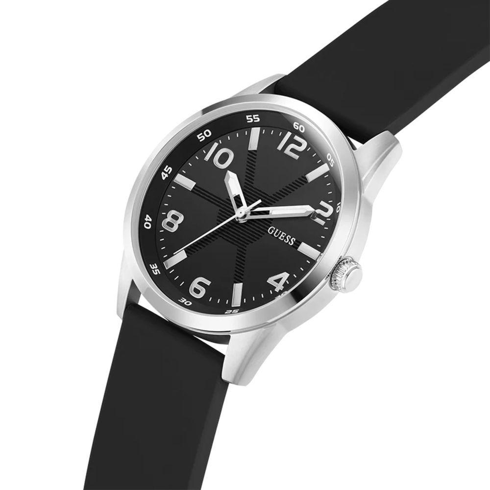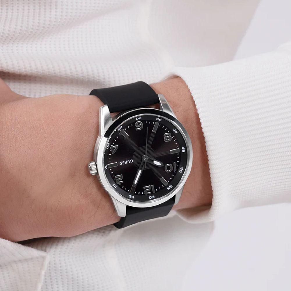 Relógio Guess Masculino Gw0805g1 PretoRelógio Guess Masculino GW0805G1 PretoRelógio masculino GUESS modelo GW0805G1. Design clássico e versátil com caixa em aço inox escovado/polido e pulseira em silicone preta, ideal para uso diário que combina casual e formal. Dial preto com mostrador analógico de três ponteiros (horas, minutos, segundos). Movimento a quartzo (bateria) de fácil manutenção. Resistente à água até 50 metros (5 ATM), adequado para uso diário, com proteção contra respingos e chuva. Diâmetro de caixa de 42 mm: excelente para pulso masculino médio/grande, com presença marcante. Perfeito como acessório estiloso ou presente.Especificações Técnicas Diâmetro da caixa: 42 mm Espessura da caixa: ~10 mm Material da caixa: Aço inox (acabamento escovado/polido) Material da pulseira: Silicone Fecho: Fivela tradicional (tipo tang) Cor do mostrador: Preto Movimento: Quartzo (bateria) Vidro: Cristal mineral Resistência à água: 50 metros / 5 ATM Garantia: 12 meses pela fabricante GuessRelógio 100% Original, acompanha caixa, manual, certificado de garantia Guess e NF.Somos revendedores oficial e autorizado da GUESS, todos os relógios comercializados pela nossa empresa possuem GARANTIA NACIONAL do FABRICANTE e caso o produto que adquiriu apresente algum defeito durante o período da garantia, basta encaminhá-lo diretamente à assistência técnica mais próxima de sua região, sempre acompanhado do CERTIFICADO de GARANTIA e NOTA FISCAL.