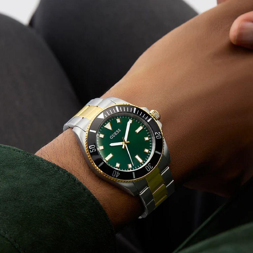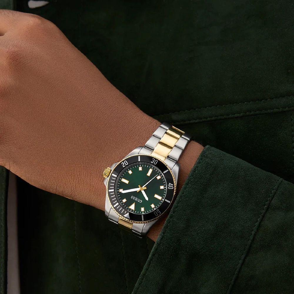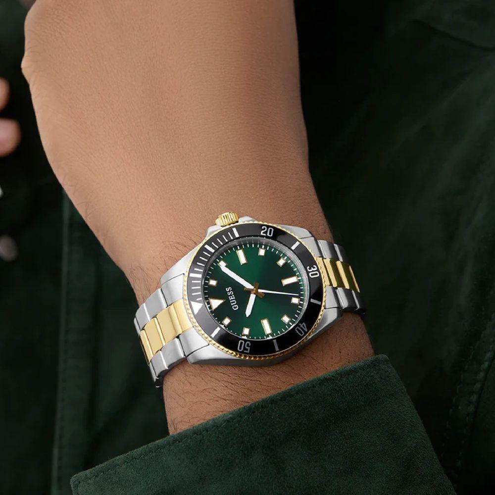Relógio Guess Masculino Cliff Gw0968g4 BicolorRelógio Guess Masculino Cliff GW0968G4 BicolorEste relógio esportivo dinâmico apresenta detalhes inovadores em alumínio e um design contemporâneo arrojado, apresentando uma caixa redonda de 41 mm em aço reciclado escovado e polido em dois tons de prata e ouro, com um exclusivo aro superior em alumínio preto combinado com uma pulseira em dois tons de prata e ouro. O mostrador verde com efeito raio de sol proporciona um contraste de cores clássico, enquanto o detalhe em alumínio preto adiciona um toque de sofisticação. Com resistência à água de 50 metros, este relógio atraente é perfeito para o homem que busca se destacar com materiais inovadores e combinações de cores clássicas.Especificações Técnicas Mecanismo: Analógico (Quartzo) Gênero: Masculino Visor: Verde Vidro: Cristal mineral Prova d'água: 50m Características: Hora, Minuto e Segundos Diâmetro da caixa: 41 mm Garantia: 1 ano pela fabricante GuessRelógio 100% Original, acompanha caixa, manual, certificado de garantia Guess e NF.Somos revendedores oficial e autorizado da GUESS, todos os relógios comercializados pela nossa empresa possuem GARANTIA NACIONAL do FABRICANTE e caso o produto que adquiriu apresente algum defeito durante o período da garantia, basta encaminhá-lo diretamente à assistência técnica mais próxima de sua região, sempre acompanhado do CERTIFICADO de GARANTIA e NOTA FISCAL.