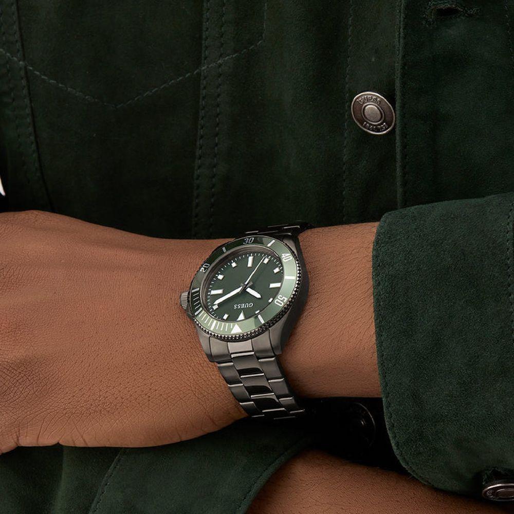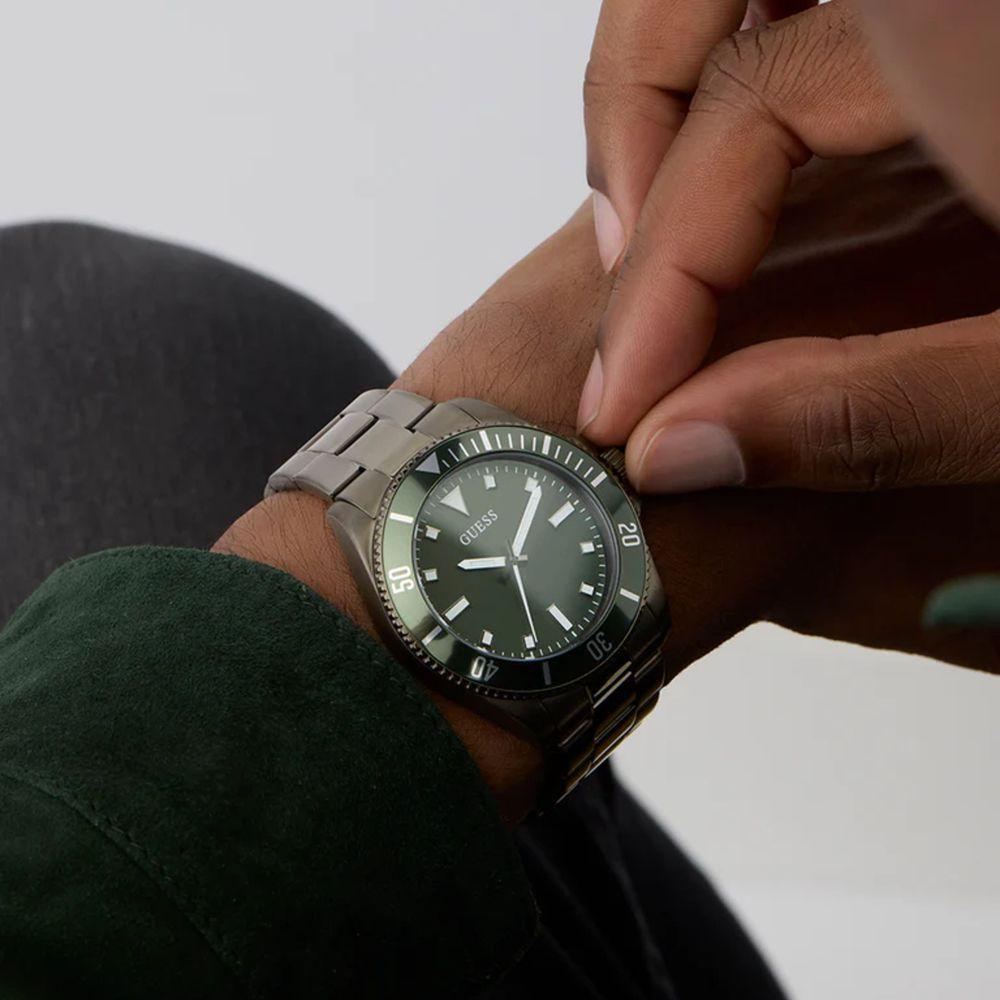 Relógio Guess Masculino Cliff Gw0968g3 BronzeRelógio Guess Masculino Cliff GW0968G3 BronzeEste relógio esportivo dinâmico apresenta detalhes inovadores em alumínio e um design contemporâneo arrojado, apresentando uma caixa redonda de 41 mm em aço reciclado bronze escovado e polido, com um distinto aro superior em alumínio verde-algas marinhas, combinado com uma pulseira em aço inoxidável bronze. O mostrador em tom raio de sol verde-algas marinhas adiciona um toque de cor complementar, enquanto o detalhe em alumínio adiciona um toque de sofisticação. Com resistência à água de 50 metros, este relógio atraente é perfeito para o homem que quer se destacar com materiais inovadores e combinações de cores ousadas.Especificações Técnicas Mecanismo: Analógico (Quartzo) Gênero: Masculino Visor: Verde Vidro: Cristal mineral Prova d'água: 50m Características: Hora, Minuto e Segundos Diâmetro da caixa: 41 mm Garantia: 1 ano pela fabricante GuessRelógio 100% Original, acompanha caixa, manual, certificado de garantia Guess e NF.Somos revendedores oficial e autorizado da GUESS, todos os relógios comercializados pela nossa empresa possuem GARANTIA NACIONAL do FABRICANTE e caso o produto que adquiriu apresente algum defeito durante o período da garantia, basta encaminhá-lo diretamente à assistência técnica mais próxima de sua região, sempre acompanhado do CERTIFICADO de GARANTIA e NOTA FISCAL.
