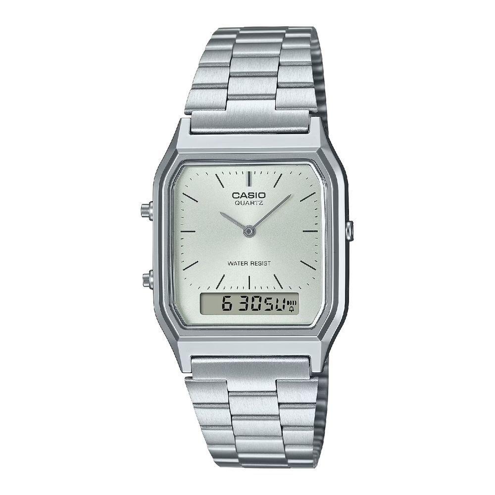 Relógio Vintage Aq-230a-7amqydf PrataRelógio Vintage AQ-230A-7AMQYDF PrataA combinação analógica-digital clássica ornamentada com tonalidades deslumbrantes. Com um mostrador Sunray para um toque colorido e elegante num design moderno. Resistência à água para utilização diária e funcionalidades práticas como cronómetro, alarme e muito mais.Especificações Técnicas:- Gênero: Unissex- Mecanismo: Digital- Alimentação: Bateria- Composição do Vidro: Acrilico- Material da Caixa: Aço Inoxidável- Material da Pulseira: Aço Inoxidável- Resistência à Água: 30 Mts.- Espessura da Caixa: 38,8mm- Largura da Caixa: 29,8mm- Altura da Caixa: 8,1mm-Peso: 47g- Itens Inclusos na Caixa: Relógio, manual de instruções, certificado de garantia- Garantia: 12 meses (Rede de Autorizadas)Relógio 100% , acompanha caixa, manual, certificado de garantia e .Somos revendedores oficial e autorizado da (fabricado e comercializado pela COMÉRCIO PRODUTOS ELETRONICOS LTDA), todos os relógios comercializados pela nossa empresa possuem GARANTIA do FABRICANTE e caso o produto que adquiriu apresente algum durante o período da garantia, basta encaminhá-lo diretamente à assistência técnica mais próxima de sua , sempre acompanhado do CERTIFICADO de GARANTIA e .