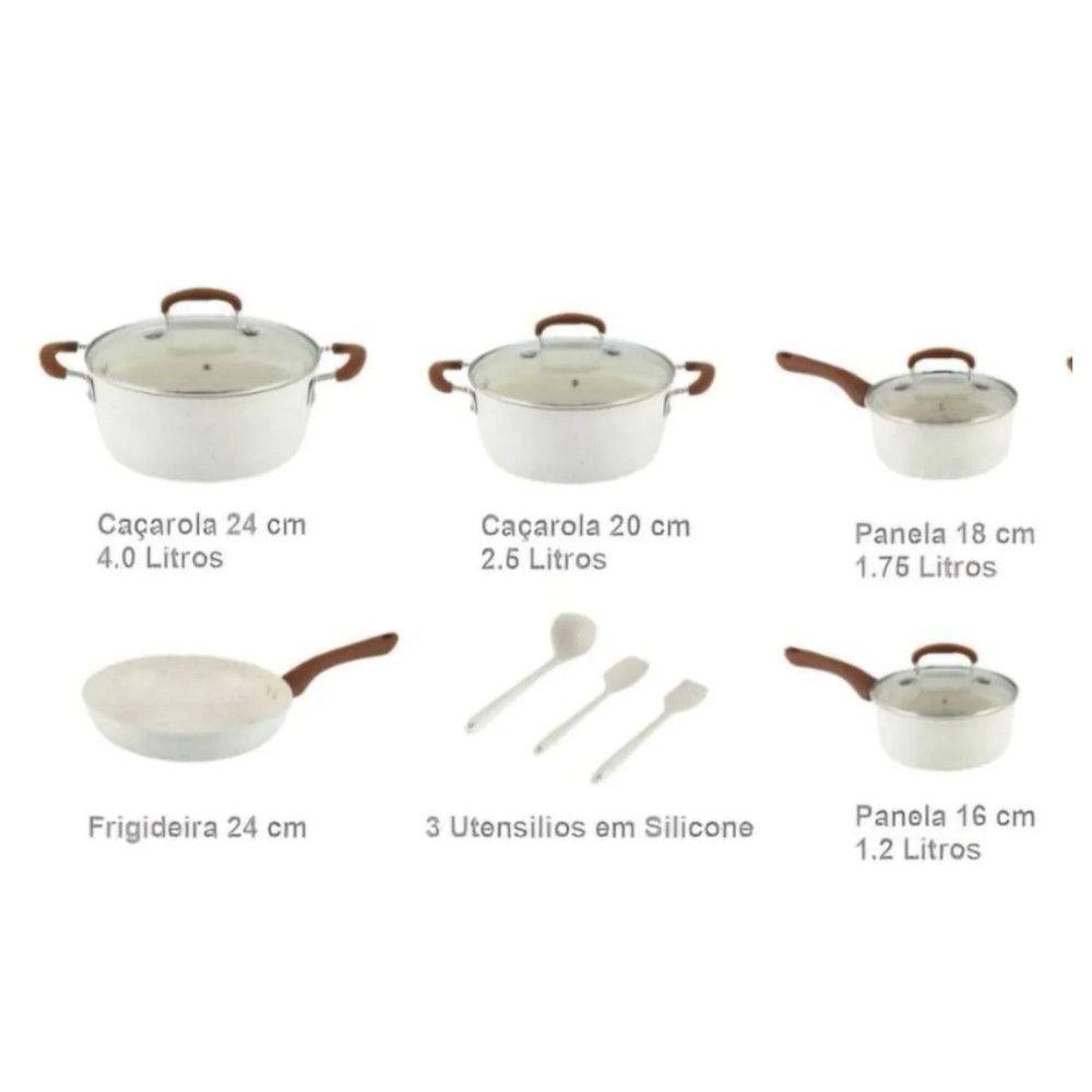 Kit Panelas 8pçs Jaguar Com Faqueiro Tramontina 24pçs Bege/pretoRenove sua cozinha com praticidade e elegancia com o Kit Panelas 8 Pecas Jaguar com Faqueiro Tramontina 24 Pecas. As panelas possuem revestimento antiaderente de alta performance, que evita que os alimentos grudem e facilita a limpeza. As tampas de vidro temperado com saida de vapor permitem acompanhar o cozimento sem perder calor, e seu design moderno combina com qualquer estilo de cozinha. Apropriadas para fogoes por inducao, gas, eletricos e vitroceramicos, sao ideais para o uso diario.O faqueiro Tramontina 24 pecas inclui garfos, facas e colheres em aco inox com cabos de polipropileno, oferecendo durabilidade, conforto e um toque moderno a mesa. O kit acompanha pote plastico para armazenar os talheres ou mantimentos, garantindo mais organizacao e praticidade.Conjunto Panelas Jaguar 8PCS Inducao Casa AmbienteMaterial: Aluminio com revestimento em CeramicaEspessura: 4.5mmFogao: Inducao e ChamaConteudo da embalagem:1 Panela com tampa: 16 cm 1,20L1 Panela com tampa: 18 cm 1,75L1 Cacarola com tampa: 20 cm 2,5L1 Cacarola com tampa: 24 cm 4L1 Frigideira: 24 cmUtensilios: 3 em siliconeModelo: JaguarFaqueiro Tramontina Ipanema Com 24 pecasLaminas de aco inoxAs laminas das facas tem maior durabilidade do fio devido ao tratamento termicoOs garfos e colheres garantem maior resistencia devido a espessura do aco e a estampagem das laminasOs cabos de polipropileno possuem maior resistencia e durabilidadePodem ir a maquina de lavar loucas facilitando seu dia a diaDimensoes do produtoAltura: 30 cmLargura: 10 cmProfundidade: 10 cmPeso: 535 grGarantia: 3 meses