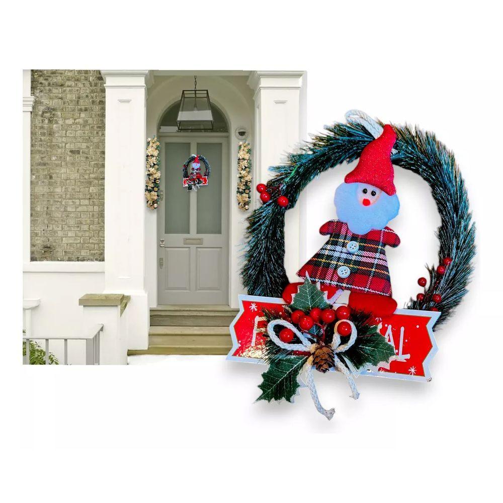 Guirlanda Natalina Com Papai NoelDESCRIÇÃO: Dê as boas-vindas ao espírito natalino com a nossa Guirlanda Natalina com Papai Noel. Esta peça artesanal é feita em tecido macio e decorada com um encantador Papai Noel de roupa xadrez, detalhes em pelúcia e acabamento rústico, proporcionando um toque acolhedor e exclusivo.Enfeitada com folhas artificiais, pinhas, bagas vermelhas e uma placa Feliz Natal, essa guirlanda combina texturas e cores para criar uma decoração que chama atenção na sua porta, recepção ou ambiente interno.Com 25 cm de altura e 18 cm de largura, é o tamanho perfeito para destacar e embelezar seu espaço de maneira charmosa e convidativa. Durável e de alta qualidade, é a escolha ideal para encantar suas visitas e transformar sua casa em um verdadeiro lar de Natal.DADOS TÉCNICOS:Material: Tecido macio, pelúcia, folhas artificiais, pinhas e bagas vermelhasPersonagem: Papai Noel de roupa xadrez com acabamento artesanalCores: Vermelho, verde, e toque rústicoMedidas: 25 cm de altura e 18 cm de larguraPeso: Leve e fácil de pendurarUso: Ideal para portas, recepções e áreas internasDurável para uso por muitos nataisPlaquinha: Feliz Natal inclusaITENS INCLUSOS:1 x Guirlanda Natalina com Papai Noel