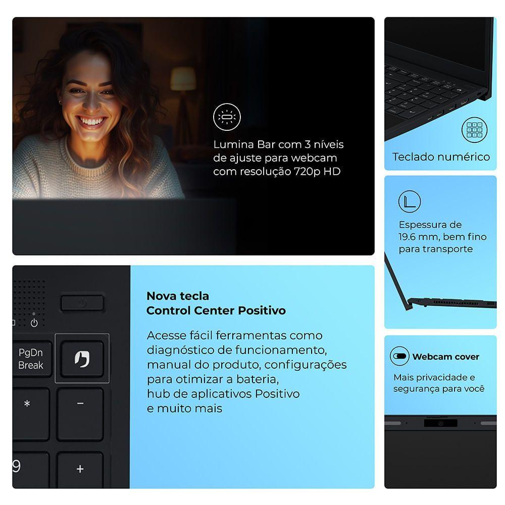 Notebook Positivo Vision R15m Amd® Ryzen 5-5625u Linux 8gb Ram 256gb Ssd Wi-fi 6 15” Full Hd Ips Minitela - PretoNotebook Positivo Vision R15M AMD Ryzen 5-5625U Linux 8GB RAM 256GB SSD Wi-Fi 6 Tela 15” Full HD IPS - Minitela - PretoO notebook que acompanha seu ritmo. Uma tela para o trabalho, outra para sua vida.O Positivo Vision R15M com Minitela integrada é mais que um notebook – é a resposta para quem precisa de performance, organização e estilo no dia a dia. Com design moderno, leve e funcional, ele traz um diferencial exclusivo: a Minitela. Essa tela secundária, de 1,54” IPS com resolução de 240x240, coloca notificações do WhatsApp, lembretes, status do dispositivo, previsão do tempo e imagens/GIFs sempre ao alcance dos seus olhos — sem interromper o que está fazendo na tela principal. Ideal para estudantes e profissionais que buscam produtividade e inovação em um único equipamento.Equipado com processadores AMD Ryzen série 5000 com placa gráfica integrada Radeon, o Vision R15M oferece uma experiência fluida e ágil mesmo nas tarefas mais exigentes. A arquitetura avançada da AMD garante maior eficiência energética e velocidade de processamento, permitindo navegar com fluidez, editar documentos, assistir vídeos em alta resolução e até criar conteúdos gráficos com desempenho consistente.A experiência visual é garantida com a tela principal de 15,6” Full HD com painel IPS antirreflexo, que oferece mais conforto e nitidez em qualquer ambiente. E para videochamadas mais nítidas, o notebook traz o inovador Lumina Bar, iluminação LED com 3 níveis de ajuste de intensidade, auxiliando a captura de imagem em ambientes com baixa luminosidade.Projetado para crescer com você, o Vision R15M permite expansão de memória RAM até 64GB e até 4TB de armazenamento SSD. Para quem busca liberdade, o Vision R15M entrega bateria de longa duração de até 8 horas* (55Wh), conectividade de ponta com Wi-Fi 6 (até 3x mais rápido que o modelo antecessor), além de todas as portas necessárias para uso, transferência de dados e conexão de dispositivos externos.Principais características:- Minitela integrada para lembretes, notificações do WhatsApp, mensagens, previsão do tempo, lista de tarefas, imagens, GIFs animados e atalhos- Processadores AMD Ryzen série 5000 com gráficos Radeon- Tela principal de 15,6” Full HD com painel IPS antirreflexo- Permite upgrade de até 64GB de memória RAM e até 4TB de armazenamento SSD- Lumina Bar: iluminação para videochamadas mais nítidas- Conectividade Wi-Fi 6 com maior velocidade e estabilidade- Bateria de longa duração (até 8 horas com 55Wh)- Design leve, elegante e pronto para o movimento*O tempo de duração da bateria pode variar de acordo com o uso.Processador - AMD Ryzen 5-5625U, 5ª Geração, 2.30 GHz com frequência de Burst de até 4.30 GHz, 16MB Cache, 6 Núcleos, 12 ThreadsProcessador: - AMD Ryzen 5Condição: - NovoSistema Operacional - Linux DebianANATEL_HOMOLOGATION_NUMBER - 166482211470Conteúdo da embalagem - Notebook, Adaptador CA com cabo padrão Inmetro (carregador), Guia Rápido e Certificado de GarantiaFabricante: - Positivo TecnologiaSistema Operacional: - LinuxMemória RAM - 8GB DDR4 SODIMM 3200MT/sLinha: - VisionLeitor de Cartões - SD até 512GBSSD: - 256GBWebcam - Câmera Frontal HD 720p, com Lumina BARMemória RAM: - 8GBTela - 15.6”LED Full HD, IPS, Widescreen, 1920x1080, 16:9, Antirreflexiva, 60HzTela: - 15.6Vídeo - Integrada, AMD Radeon GraphicsResolução: - Full HDÁudio - Áudio de alta definição (HD Áudio), Microfone e alto-falantes estéreo embutidosCor: - CinzaConectividade - Conexão Bluetooth 5.2, Conexão Wireless Wi-fi 6 (Sem Fio) IEEE 802.11 ax (dual band 2.4GHz e 5GHz)Portas de Conexão - 1 Conexão HDMI /2 Conexões USB 3.2 Gen 1/1 Conexões USB 2.0 / 1 Conexão USB 3.2 (Tipo C) 1 combo (microfone/áudio)Teclado - Português-Brasil ABNT2, 105 teclas + tecla Power (independente)Mouse - Tipo Touchpad , com toque múltiplo, 2 botões integradosCarregador - 65W, Bivolt 100~240V 10A, Fonte 19V / 3.42ABateria - 3 células, Li- Polímero, Integrada, 55Wh - 11,4V – Até 8 horasCor - PretoDimensões - 35,9 x 1,96 x 24,11 cmPeso Líquido - 1,75 kgPeso Bruto - 2,3 kgEmbalagem do Produto - 49,9 x 5,9 x 27,6 cmGarantia - 12 MesesPart Number | EAN - 3003055 | 7908068819998Armazenamento - 256GB SSD M.2 NVMe, 2500Mbps / 1x Slot M.2 (Ocupado), Capacidade Máxima até 1TBÂngulo da tela - 135°Segurança - Trava Kensington LockExpansão de Memória até - 64GB (32GB + 32GB)Linha do processador - Ryzen 5Versão do sistema operacional - DebianTipo de memória RAM - DDR4Velocidade máxima do processador - 4.3Idioma do teclado - PortuguêsPortas USB - 2 Conexões USB 3.2 Gen 1/1 Conexões USB 2.0 / 1 Conexão USB 3.2 (Tipo C)Tipo de resolução de vídeo da webcam - HDCapacidade máxima suportada da memória RAM - 64GBLargura - 35,9 cmProfundidade - 24,11 cmAltura - 1,96 cmVelocidade mínima do processador - 2.3É 2 em 1 - NãoCom tela tátil - NãoÉ ultrabook - NãoÉ gamer - NãoCom USB - SimCom Wi-Fi - SimCom HDMI - SimCom Bluetooth - SIMCom webcam - SIMCom microfone - SIMCom saída para fones de ouvido - SIMCom porta ethernet - SIMCom teclado numérico - SIMCom leitor de impressão digital - NÃOCom teclado retroiluminado - NÃOCom leitor de cartão de memória - SIMCom tela antirreflexo - SIMInclui lápis - NÃOCapacidade Optane - 0Quantidade de núcleos - 6Capacidade da Bateria - 4825mAhÉ Netbook - NÃOModelo Alfa Numérico - R58256BI-15Modelo do Processador - 5625UTaxa de atualização da tela - 60HzMemória de vídeo: - 0Descrição completa - O notebook que acompanha seu ritmo. Uma tela para o trabalho, outra para sua vida.O Positivo Vision R15M com Minitela integrada é mais que um notebook – é a resposta para quem precisa de performance, organização e estilo no dia a dia. Com design moderno, leve e funcional, ele traz um diferencial exclusivo: a Minitela. Essa t