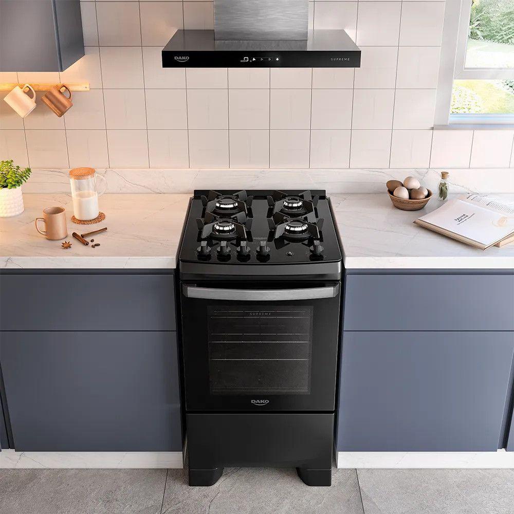 Fogão Dako 4 Bocas Supreme Glass Preto BivoltFogão Dako 4 Bocas Supreme Glass com Mega Chama - PretoO Fogão Dako Supreme Glass de 4 bocas combina design, tecnologia e performance para a sua cozinha. Com uma moderna mesa de vidro, queimador Mega Chama e um forno espaçoso de 60 litros, ele oferece a versatilidade e a potência que você precisa para preparar suas melhores receitas com mais praticidade e elegância.Principais Características:Mesa de Vidro com Queimador Mega Chama: A mesa de vidro temperado é moderna e muito mais fácil de limpar. O potente queimador Mega Chama de 3,0 kW é ideal para panelas maiores e garante mais agilidade no preparo.Grades Individuais de Ferro Fundido: As grades com 6 pontos de apoio oferecem máxima estabilidade e segurança para qualquer tipo de panela, das menores às mais pesadas.Forno de 60L com Limpa Fácil: O forno de boa capacidade possui revestimento que evita o acúmulo de gordura e duas prateleiras deslizantes, tornando o uso e a limpeza muito mais práticos. O visor amplo permite acompanhar o preparo sem abrir a porta.Design e Praticidade: O acendimento automático, o puxador em alumínio escovado e os botões removíveis garantem uma experiência de uso mais prática, segura e funcional no dia a dia.Especificações Técnicas:Marca: DakoModelo: Supreme GlassVoltagem: Bivolt (para o acendimento e luz do forno)EAN: 7897180598853Tipo: Fogão de PisoAlimentação: GásAcendimento: AutomáticoQuantidade de Bocas: 4Queimadores: 1 Mega Chama (3,0kW), 1 Família (2,0kW), 2 Semi-Rápidos (1,7kW)Capacidade do Forno: 60 LitrosMaterial da Mesa: Vidro TemperadoMaterial das Grades: Ferro FundidoCor: PretoPeso: 25,9 kgDimensões [AxLxP]: 94,1 x 52,2 x 64,9 cmGarantia: 12 meses