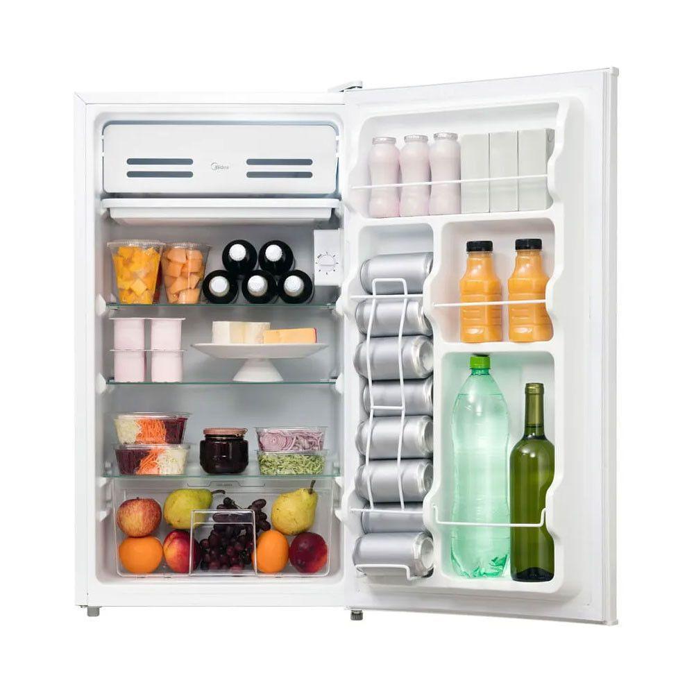 Frigobar 124L Inverter Midea Branco BivoltO frigobar perfeito para quem valoriza desempenho e design em um unico produto.Com 124 litros de capacidade, e compacto por fora e espacoso por dentro, ideal para armazenar bebidas, alimentos e ate garrafas de 2 litros.Conte com muito mais praticidade no dia a dia com compartimento extra frio, prateleiras de vidro faceis de limpar e gaveta organizadora.Ja o controle de temperatura preciso, garante que voce escolha a temperatura ideal para bebidas e alimentos.Alem disso, a tecnologia Flexi Volt permite o uso em 127V ou 220V, e a tecnologia Inverter garante resfriamento rapido, baixo nivel de ruido e alta eficiencia energetica com selo A, de acordo com o novo padrao do Inmetro.Caracteristicas:FrigobarMarca: MideaModelo: MDRD181FGD013Material de fabricacao: PSAI, Aco galvanizado.Capacidade: 124L.Consumo: 8,0Frequencia: 60 Hz.Voltagem: BivoltFlexi Volt: Funciona tanto em 127V quanto em 220V, garantindo seguranca e liberdade para usar em qualquer tomada.Tecnologia Inverter: Proporciona resfriamento rapido e garante a estabilidade da temperatura, preservando os alimentos por mais tempo. Alem disso, contribui para uma maior economia de energia e oferece baixo nivel de ruido.Super economia de energia: Classificacao A pelo novo e mais rigoroso padrao do Inmetro, garantindo ate 20 de economia de energia em comparacao ao novo padrao B.Controle de Temperatura: Ajuste facil por meio de um potenciometro com 7 niveis, entre 0#8239;C e 10#8239;C, que garante a temperatura ideal para conservar bebidas e alimentos com precisao.Compartimento Extrafio: Bebidas geladas mais rapido, com praticidade e conveniencia, sempre que voce precisar.Prateleiras de Vidro: Design mais elegante e resistente. Oferece estabilidade para os alimentos e facilidade na hora da limpeza.Gaveta Organizadora: Perfeita para armazenar frutas e alimentos, mantendo o frigobar sempre organizado.Compartimento de Latas: Mais organizacao e otimizacao do espaco interno com o compartimento exclusivo para 8 latas.Gas Ecologico: Utiliza o gas R600a, que tem menor impacto ambiental e nao agride a camada de ozonio.Dimensoes:Altura: 85,8 cmLargura: 50,1 cmProfundidade: 54 cmPeso: 21,4 kgGarantia do Fornecedor: 12 meses