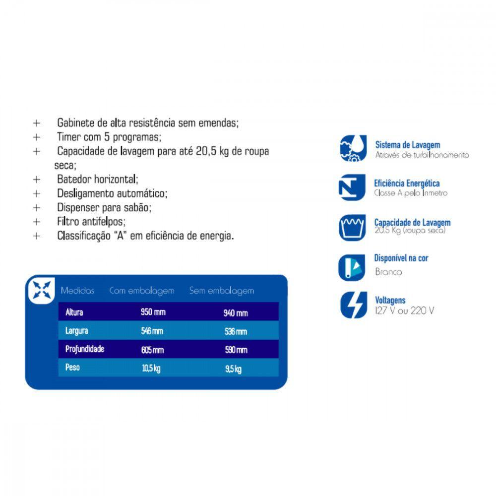 Lavadora De Roupas 20,5 Kg Libell Branco 220VA Lavadora de Roupas Libell 20,5kg e perfeita para quem precisa lavar grandes volumes com praticidade. Com capacidade para 20,5kg e voltagem 110V, oferece alto desempenho e economia. Seu design moderno na cor branca combina com qualquer ambiente. Facil de usar, eficiente e resistente, e a solucao ideal para familias grandes ou uso frequente.Dimensoes:Altura: 95 cm | Largura: 54 cm | Profundidade: 60 cmCaracteristicas:- Capacidade para lavar 20,5kg de roupa seca- Dispenser de sabao em po e amaciante- Timer com 5 programas- Tampa em plastico propileno- Batedor horizontal .- Sistema de lavagem atraves de turbilhonamento- Filtro de drenagem- Filtro de antifelpos- Classificacao A em eficiencia de energia- Potencia 1/5hp .- Rotacao do motor 1535rpm- Corrente eletrica 2,8A- Capacitor do motor 35- Garantia: 12 meses** Imagens ilustrativas. Objetos nao acompanham o produto.** O produto e enviado desmontado.AVISO: Esclarecemos que a Opcao Moveis se responsabilizara pela dos produtos adquiridos ate a porta de entrada (casas) ou portaria (predios ou condominios) do endereco indicado, ou seja: e de total responsabilidade do cliente a montagem, desmontagem e instalacao do produto adquirido. Para evitar futuros desagrados ou imprevistos com a , tambem e necessario que o cliente confira as dimensoes do produto escolhido, antes de finalizar a compra, devendo certificar-se de que a mercadoria passara normalmente por elevador, porta, escada e corredor.