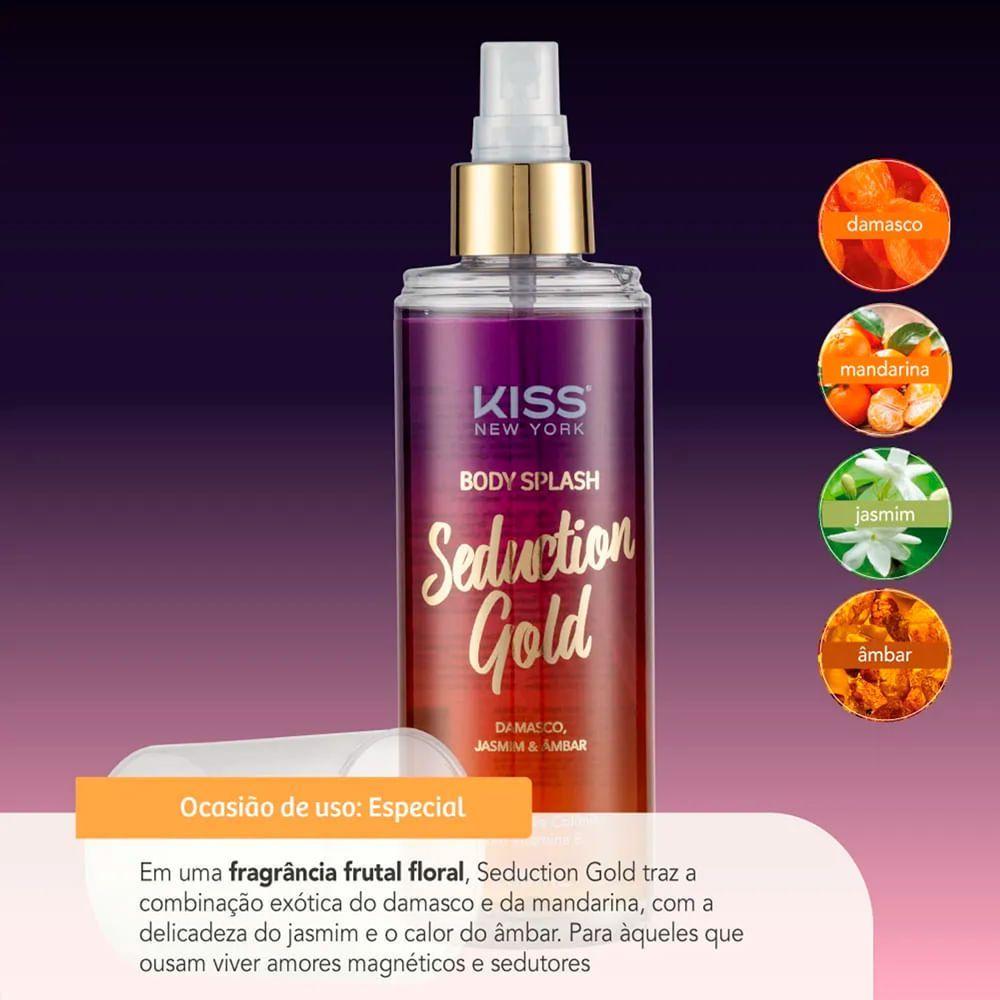 Kiss New York Seduction Gold - Body Splash 200mlKiss New York Seduction Gold - Body Splash 200mlO Kiss New York Seduction Gold Body Splash é perfeito para mulheres que buscam uma fragrância leve e cativante para o dia a dia. Combinando frescor e sofisticação, ele oferece um toque de sensualidade em uma fórmula que pode ser usada a qualquer momento. Ideal para quem deseja uma sensação de frescor prolongada com um aroma envolvente que destaca a feminilidade.Características:Marca: Kiss New YorkModelo: Seduction GoldTipo de Fragrância: Body SplashVolume: 200mlNotas Olfativas:Notas de Topo: Frutas frescas e flor de laranjeiraNotas de Coração: Jasmim, peônia e gardêniaNotas de Fundo: Âmbar, almíscar e madeira de cedroBenefícios:Fragrância Leve e Envolvente: Ideal para o dia a dia e uso frequente.Frescor Prolongado: Mantém a pele perfumada e refrescante ao longo do dia.Praticidade: Frasco de 200ml com spray fácil de usar e reaplicar.Versatilidade: Pode ser usado após o banho, na academia ou em momentos de descontração.Experimente o Kiss New York Seduction Gold Body Splash e sinta-se fresca e elegante todos os dias. Perfeito para mulheres modernas que valorizam uma fragrância leve, mas com personalidade marcante.Família Olfativa - FloralGênero - FemininoVersão - SeductionNome do Produto - Kiss New York Seduction GoldNotas de topo - Frutas frescas e flor de laranjeiraNotas de fundo - Âmbar, almíscar e madeira de cedro