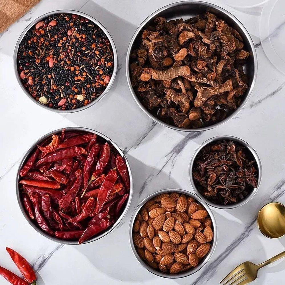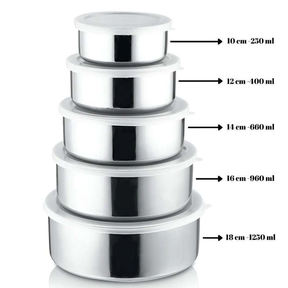Jogo 5 Potes Inox Com Tampa Vasilha Marmita Conjunto Armazenamento Refeiçao Alimento Organizaçao Empilhavel Resistente