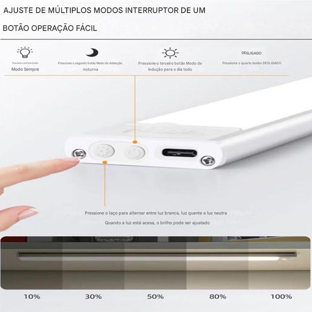 Luminaria Led 3 Tons Sensor Presença Movimento 3 Modos Usb Bateria Recarregavel Quarto Sala Cozinha Armario IluminaçaoLuminária de LED noturna com sensor de presença é perfeita para iluminar quartos, corredores, quartos, banheiros, salas e armários.A luminária é compacta e portátil. Fácil de instalar, não precisa de ferramentas, basta colar a fita dupla face que vem na luminária e encaixar aonde precisar de iluminação.A luminária possui 3 tons de iluminação, Branco Frio, Branco Quente e Branco Misto/Neutro. Para trocar a tonalidade basta pressionar levemente o botão de configuração. Se manter pressionado por segundos, você consegue alterar ajustar o brilho da iluminação, deixando do mais suave ao mais forte.Aluminária possui 3 modosPressionando o botão on e off, ao ligar a luminária ela entra no Modo Constante, luz ligada direto.Pressionando mais uma vez o botão on e off, a luminária vai piscar 3 vezes, após, entrará no Modo Noturno, acenderá em um brilho mais suave, se desligará após não detectar mais a presença.Pressionando mais uma vez o botão on e off, a luminária vai piscar 2 vezes, após entrará no Modo Diurno, acendará quando detectar a presença e se desligará após 25 segundos.Pressionando novamente, desligará a luminária.Produzida em ABS e Alumínio, possui bateria recarrevel através do cabo USB (não acompanha adaptador de tomada). Não é recomendado a utilização da luminária durante o carregamento.Ao carregar a luminária acende uma luz vermelha e ao terminar de carregar a luz fica verde.Características:Luminaria LEDNoturna3 Modos3 Tons (Branco Frio, Branco Neutro/Misto, Branco Quente)Ajuste de BrilhoBotão on e offBotão de configuração (Ajuste de Tom e Brilho)A bateria vai depender do tempo e modo de usoPotência: 5wVoltagem BivoltCor: Branco e CinzaMaterial: ABS e AlumínioDimensões Aproximadas:Comprimento: 30cmLargura: 4cmEspessura: 1cmComprimento do Cabo USB: 50cmConteúdo da Embalagem:1 Luminária LED Sensor de Presença1 Cabo USB3 Meses de Garantia Contra Defeito de Fabricação**132 MOD: BSL3750