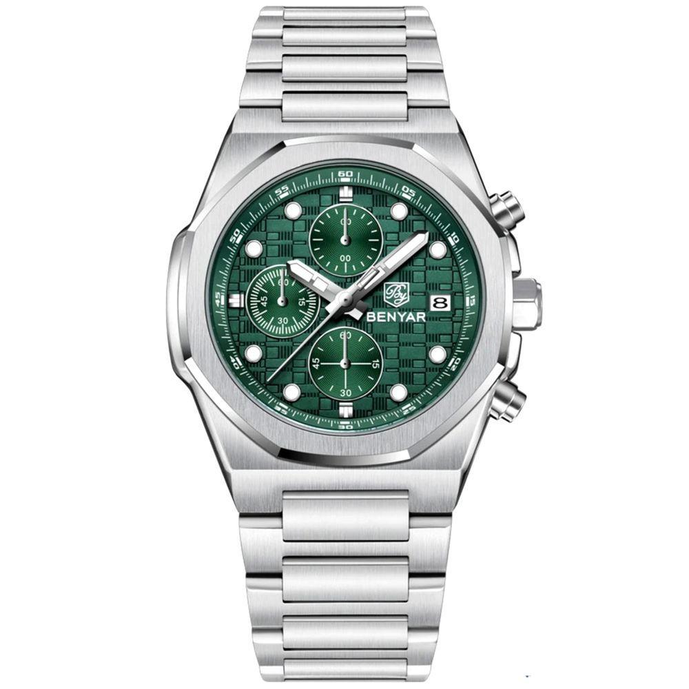 Relógio Masculino Quartzo Com Cronógrafo Aço Inoxidável A Prova D'agua VerdeDescubra o encanto irresistível , onde a excelência em design encontra funcionalidade indiscutível. Este relógio de pulso cronógrafo é a escolha definitiva para o homem moderno que valoriza tanto a estética quanto o desempenho. Com um mostrador impressionante que exibe detalhes intricados, ele oferece não apenas o horário, mas também uma experiência visual inigualável que complementa qualquer ocasião.Fabricado com aço inoxidável , este relógio alia resistência e sofisticação. Seu mostrador de vidro Hardlex garante uma durabilidade excepcional, enquanto a resistência à água de até 3ATM o torna ideal para o uso diário, mesmo em ambientes desafiadores. A funcionalidade luminosa assegura visibilidade em condições de pouca luz, conferindo um toque de modernidade e praticidade que não passa despercebido.Especificações:[Alta Resiliência] O aço inoxidável usado tanto no material da pulseira quanto no estojo proporciona não apenas um visual robusto, mas também uma durabilidade inigualável, garantindo que este relógio seja um companheiro fiel por muitos anos.[Precisão Japonesa] Equipado com movimento quartzo de origem japonesa, ele assegura uma medição de tempo precisa, enquanto o cronógrafo sofisticado adiciona funcionalidade prática para o dia a dia de um homem ativo.[Multifuncionalidade] Com características como data automática, calendário completo e cronômetro, este relógio é mais do que um adorno estético; é uma ferramenta essencial para a gestão eficaz do seu tempo.[Conforto Luxuoso] A largura da banda varia de 25 a 29mm, proporcionando um ajuste confortável, enquanto o fechamento dobrável com segurança oferece facilidade de uso sem comprometer a elegância.[Estilo Luminoso] As mãos luminosas permitem leitura clara em qualquer ambiente, reforçando o perfil de um acessório sofisticado que se destaca pela funcionalidade tanto quanto pelo design.